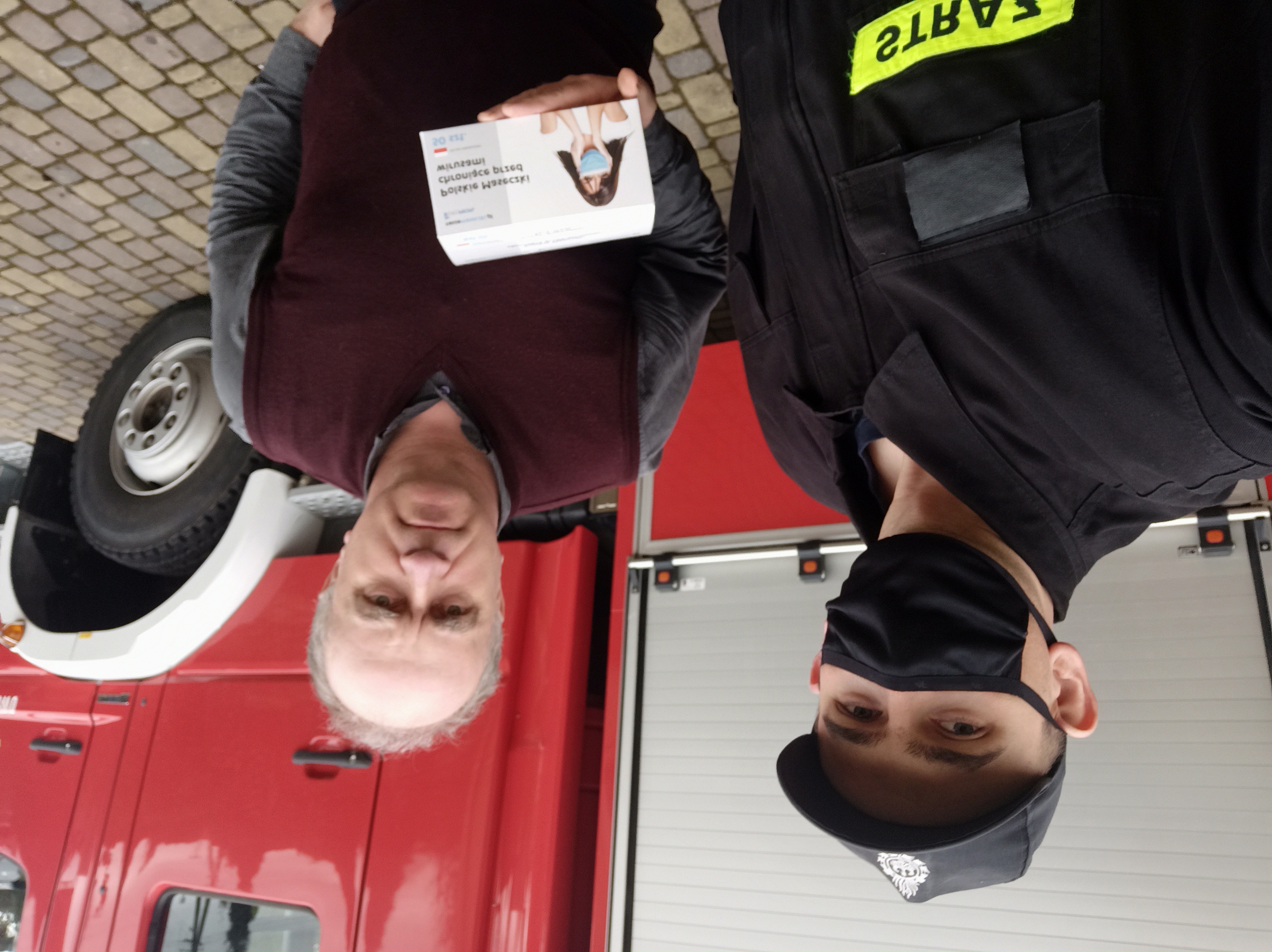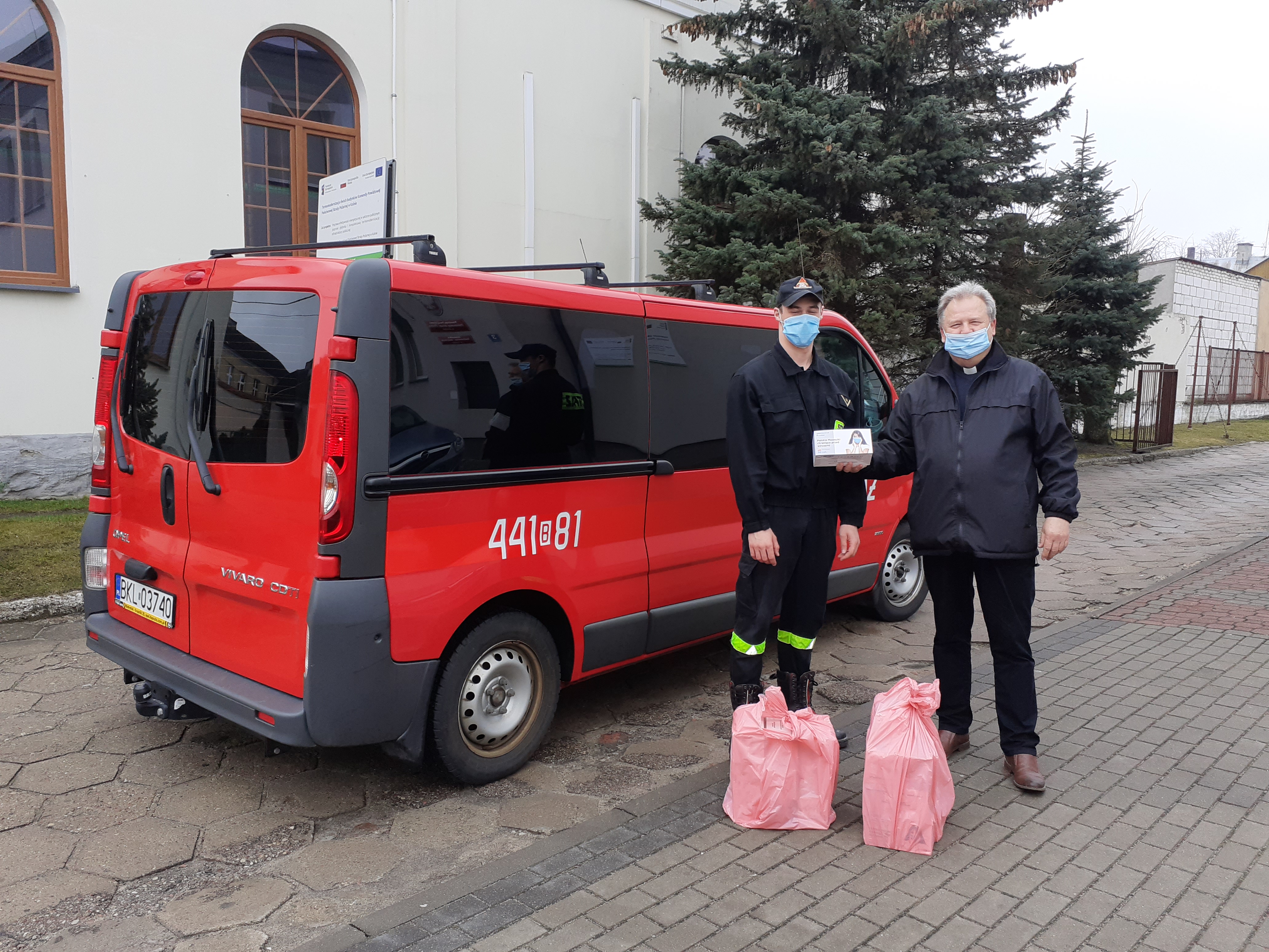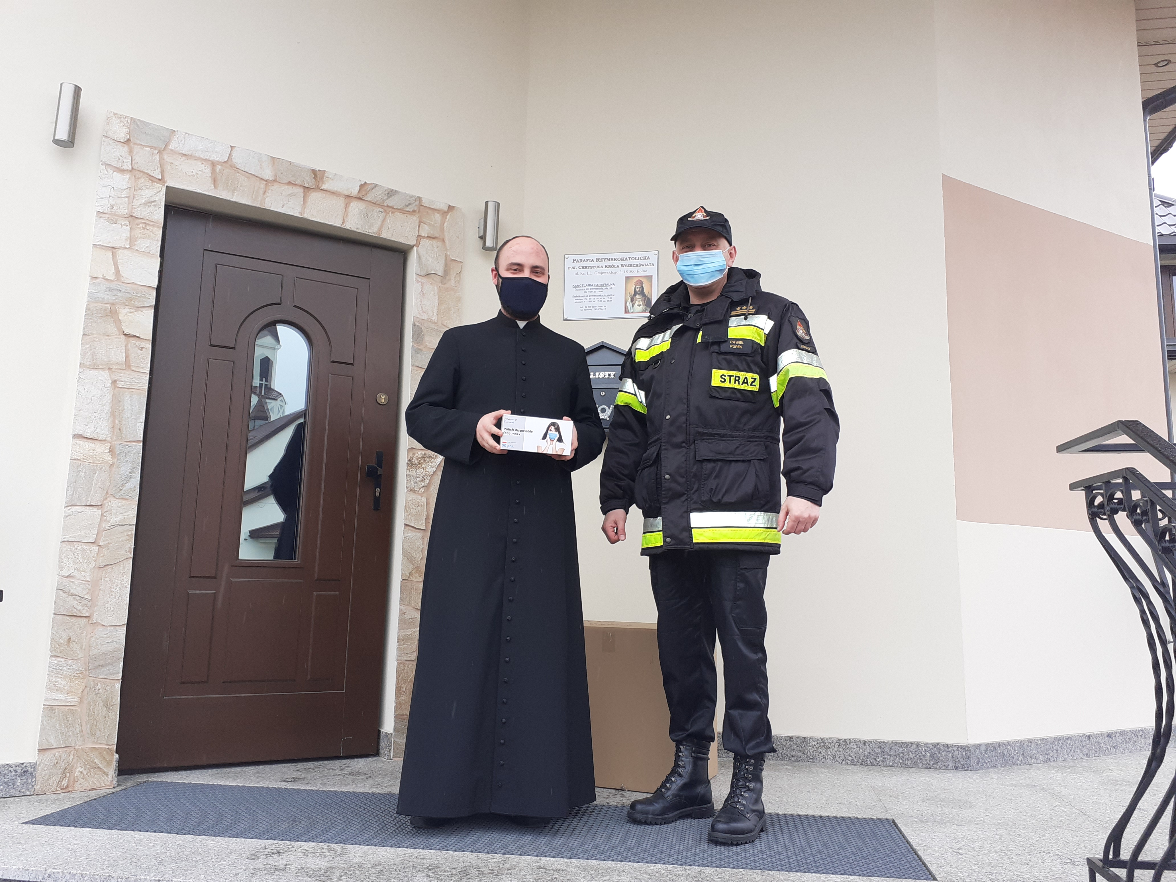 Widać strażaka i księdza. Ksiądz trzyma w ręku paczkę maseczek. Na dalszym planie widać część budynku. Po lewej stronie księdza stoi karton, za nim znajdują się drzwi do budynku.