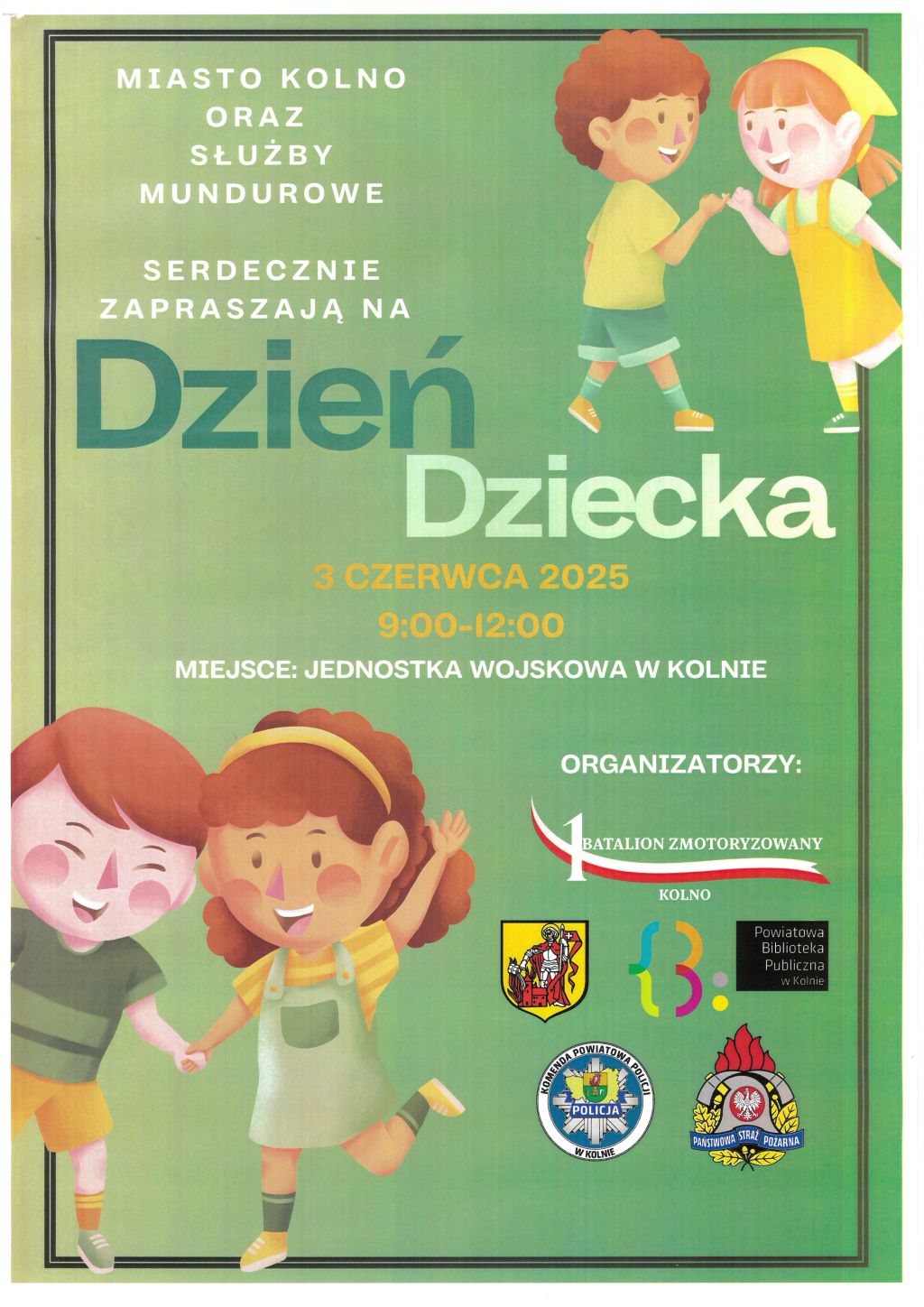Miasto Kolno oraz służby mundurowe serdecznie zapraszają na Dzień Dziecka, który odbędzie się 3 czerwca 2025 roku w godzinach 900-1200 na trenie Jednostki Wojskowej w Kolnie. W wydarzeniu udział wezmą również funkcjonariusze z Jednostki Ratowniczo-Gaśniczej PSP w Kolnie.