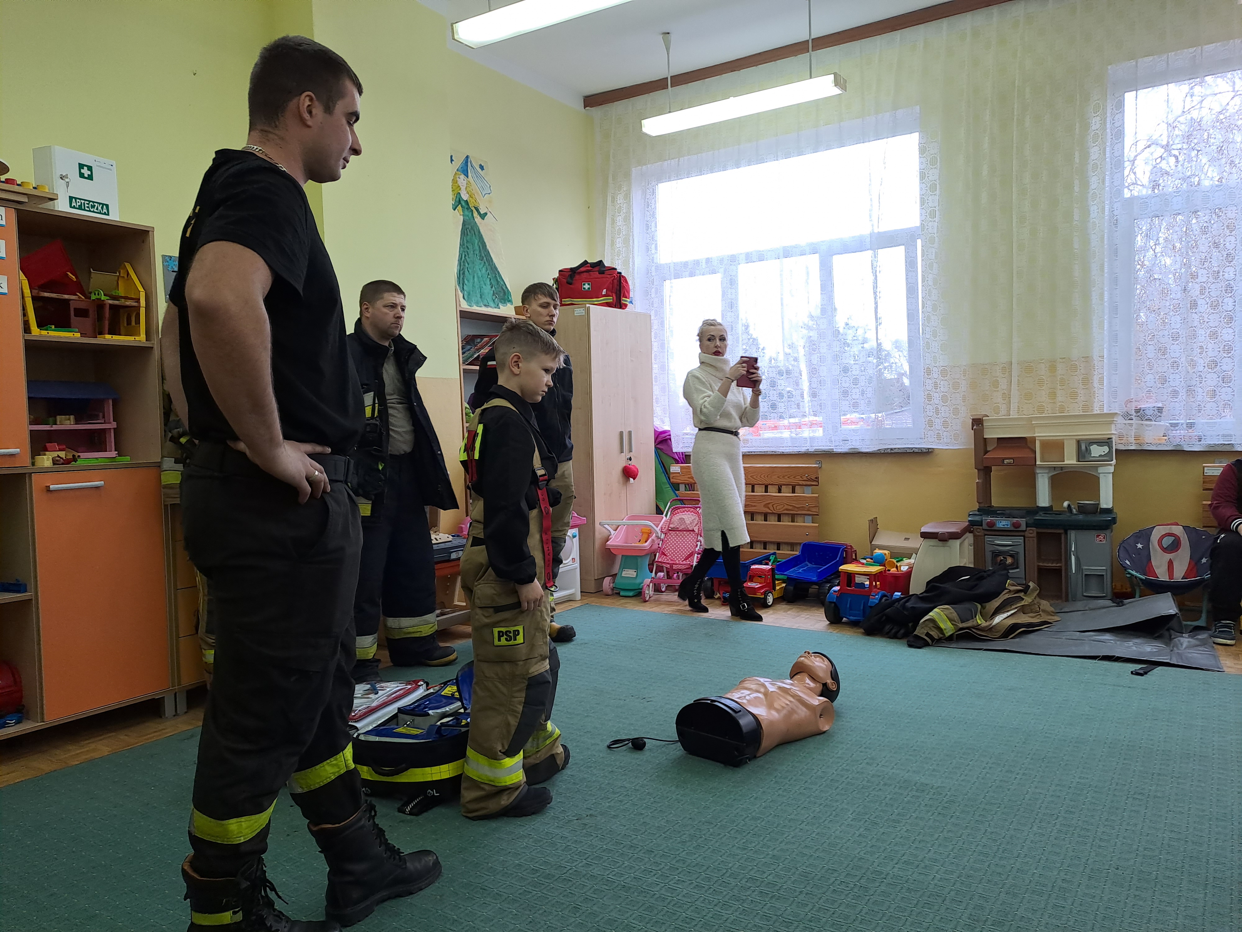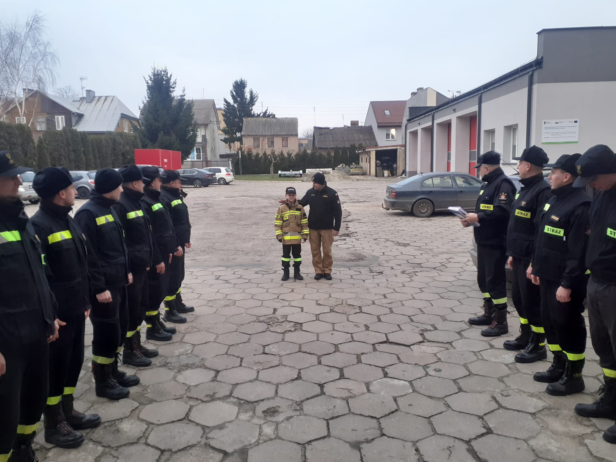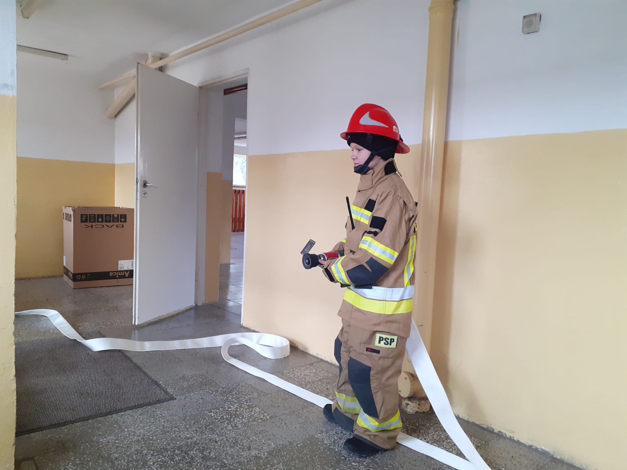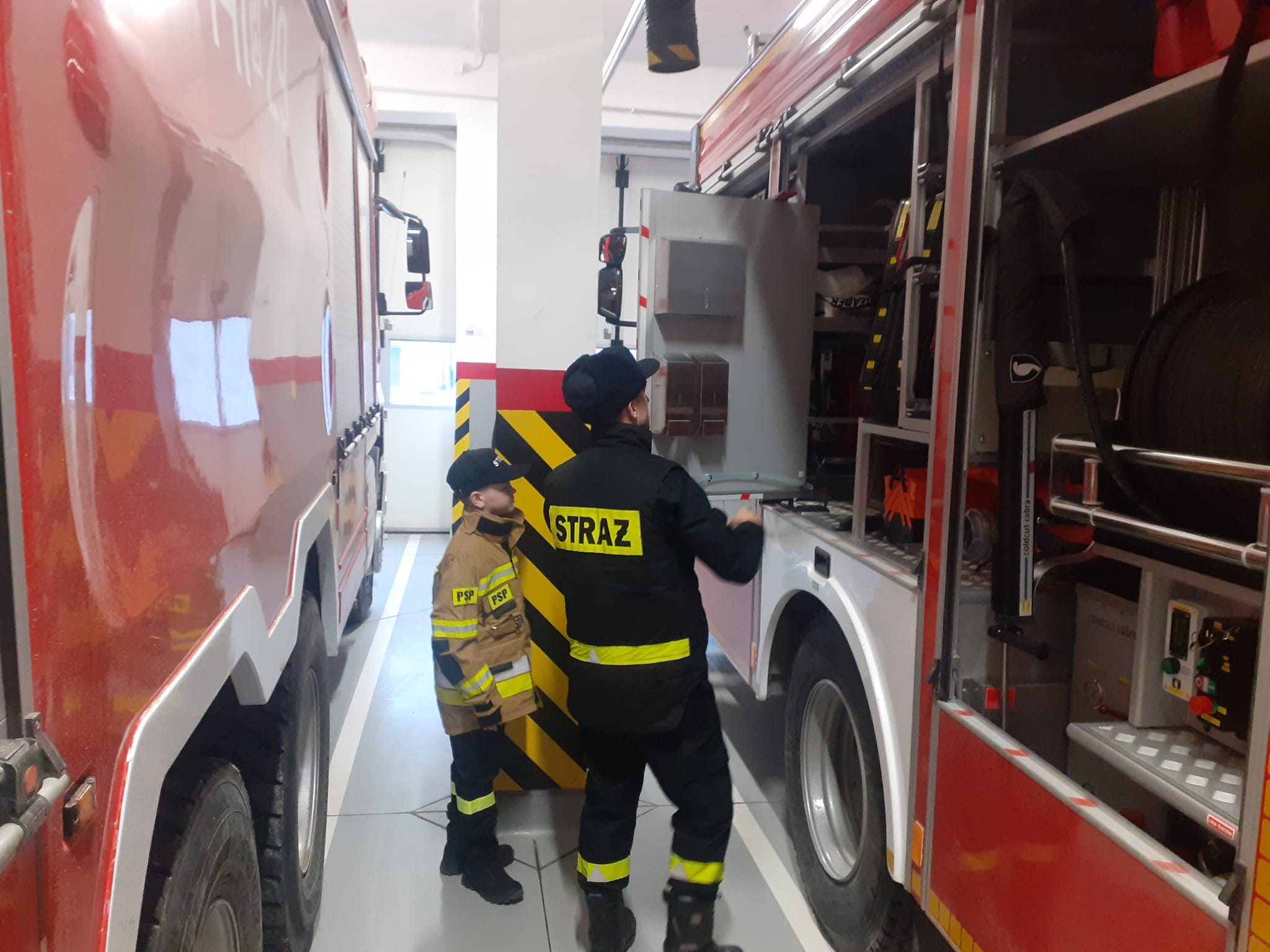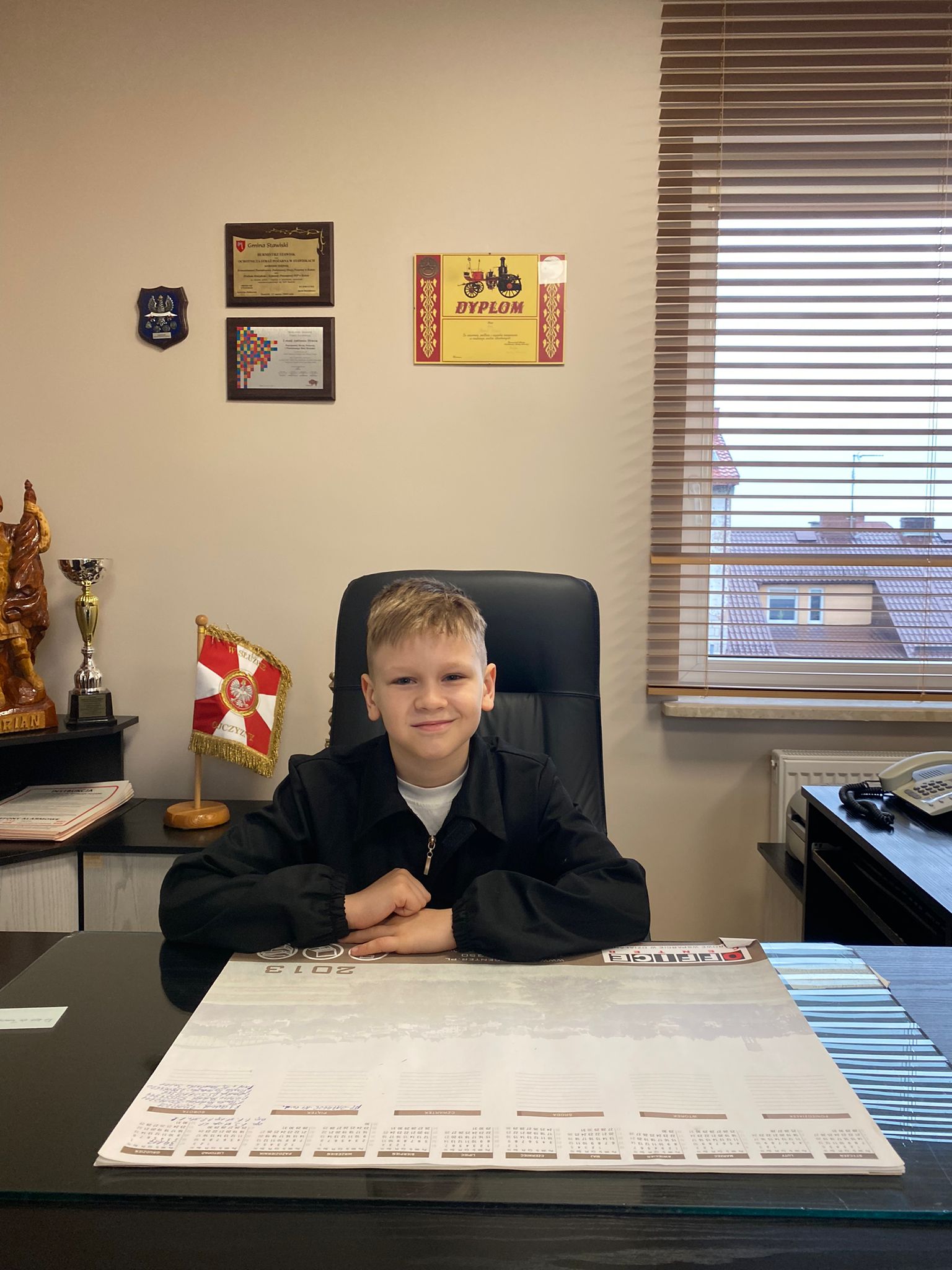 Na koniec swojej służby „jednodniowy strażak” z rąk st. bryg. Pawła Pupka – Komendanta Powiatowego PSP w Kolnie otrzymał pamiątkowy hełm strażacki oraz koszulkę.