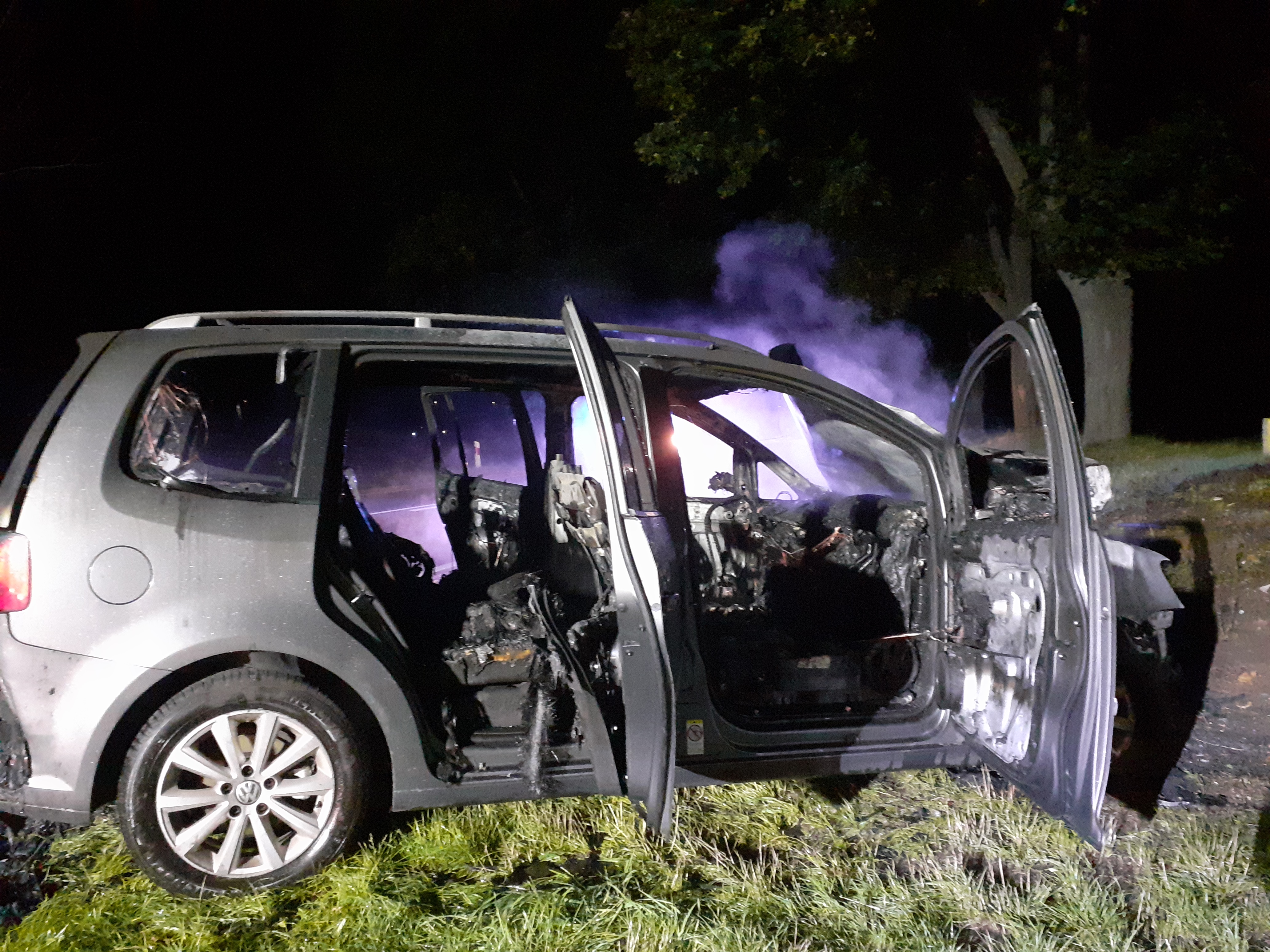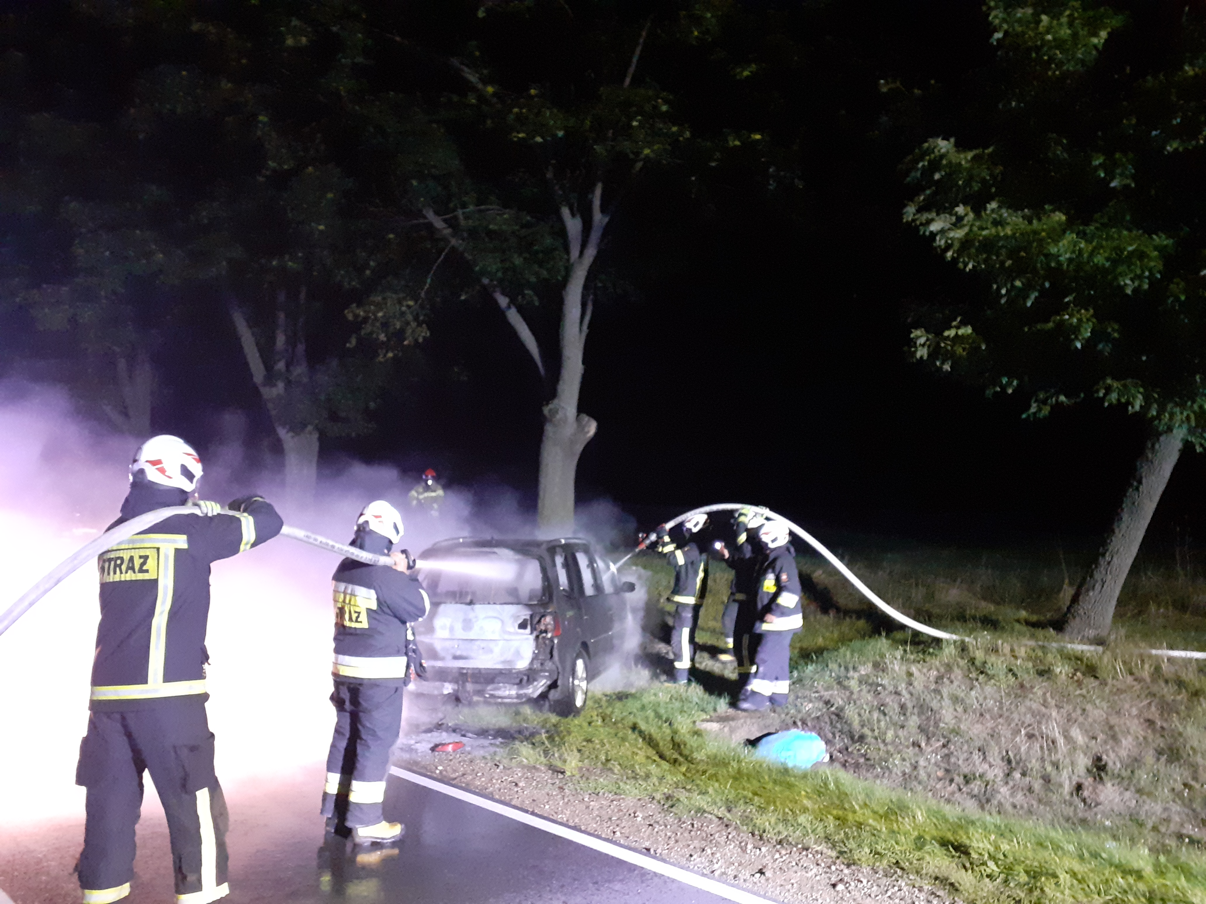 Działania zastępów polegały na zabezpieczeniu miejsca zdarzenia, oświetleniu terenu akcji oraz podaniu dwóch prądów wody w natarciu na palące się auto.