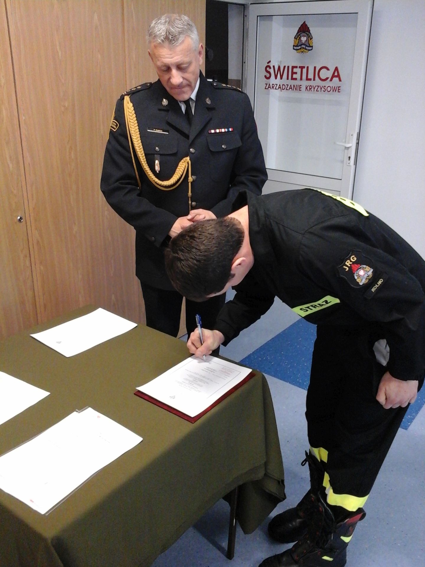 Następnie strażacy złożyli podpisy pod aktami ślubowania, pieczętując ten ważny moment w karierze zawodowej. Z rąk komendanta odebrali również akty mianowania do służby przygotowawczej.