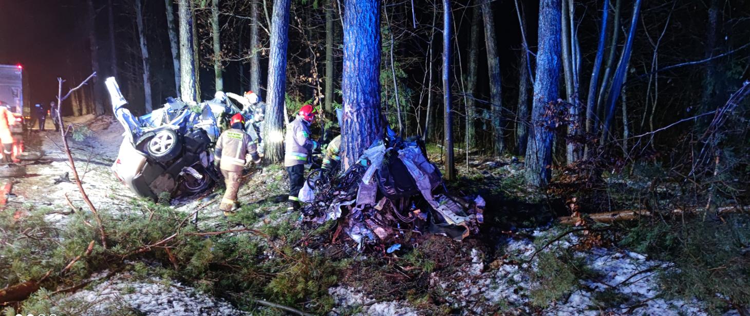 Po przybyciu na miejsce akcji stwierdzono, że w zdarzeniu brał udział jeden samochód osobowy marki Audi. Samochód znajdował się poza pasem jezdni. Siła uderzenia była tak duża, że samochód po obtarciu się o jedno drzewo i uderzeniu w drugie został rozerwany na dwie części. Kierujący pojazdem znajdował się poza samochodem, nieprzytomny i bez funkcji życiowych.
