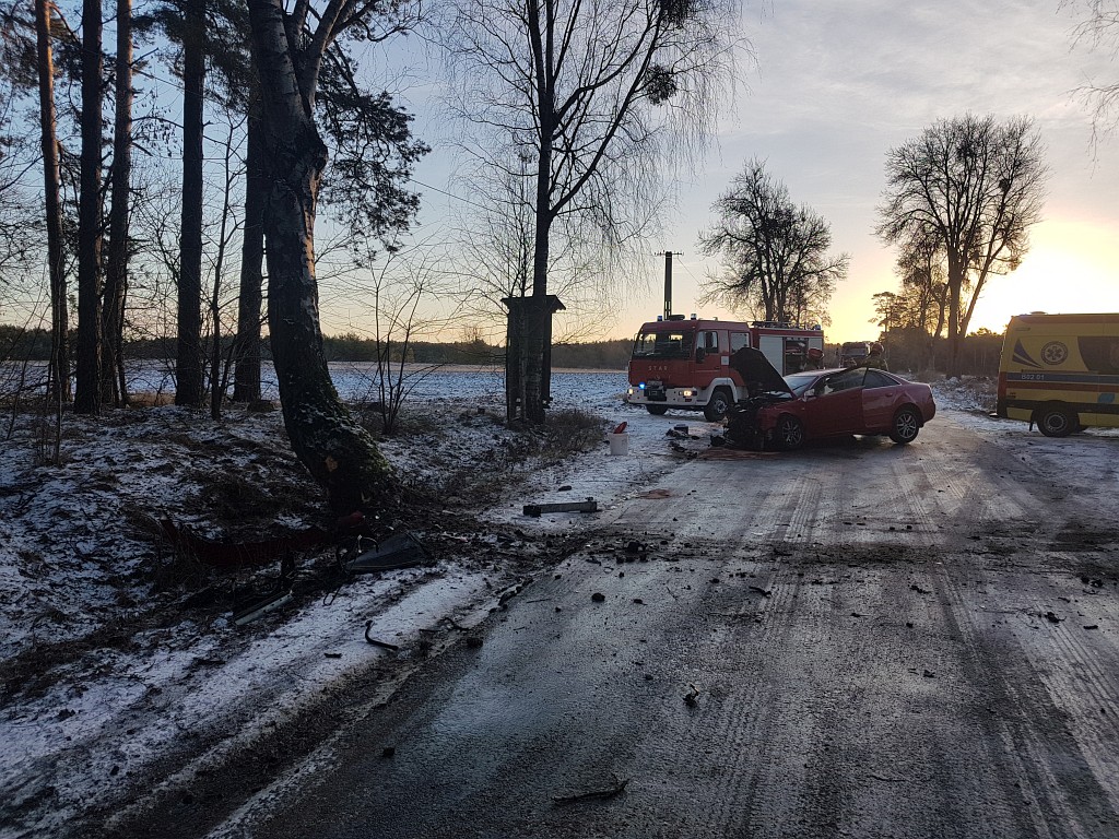 W dniu 18 stycznia 2021 r. o godz. 740 do Stanowiska Kierowania Komendanta Powiatowego PSP w Kolnie, wpłynęła informacja o wypadku samochodu osobowego na drodze powiatowej, pomiędzy miejscowością Kozioł, a Czerwone gm. Kolno. Do zdarzenia zadysponowano dwa zastępy z JRG PSP Kolno oraz OSP KSRG Czerwone. Po przybyciu pierwszych zastępów na miejsce zdarzenia stwierdzono, że w zdarzeniu brały udział dwa samochody osobowe, a nie jeden, jak było to w zgłoszeniu. Jeden z nich (BMW) znajduje się poza pasem jezdni, drugi (Audi) stoi na kołach w poprzek jezdni zajmując oba pasy. Kobieta i mężczyzna kierujący autami opuścili je o własnych siłach i znajdowali się na zewnątrz, natomiast w środku pojazdu Audi znajdowała się pasażerka z widocznym urazem głowy