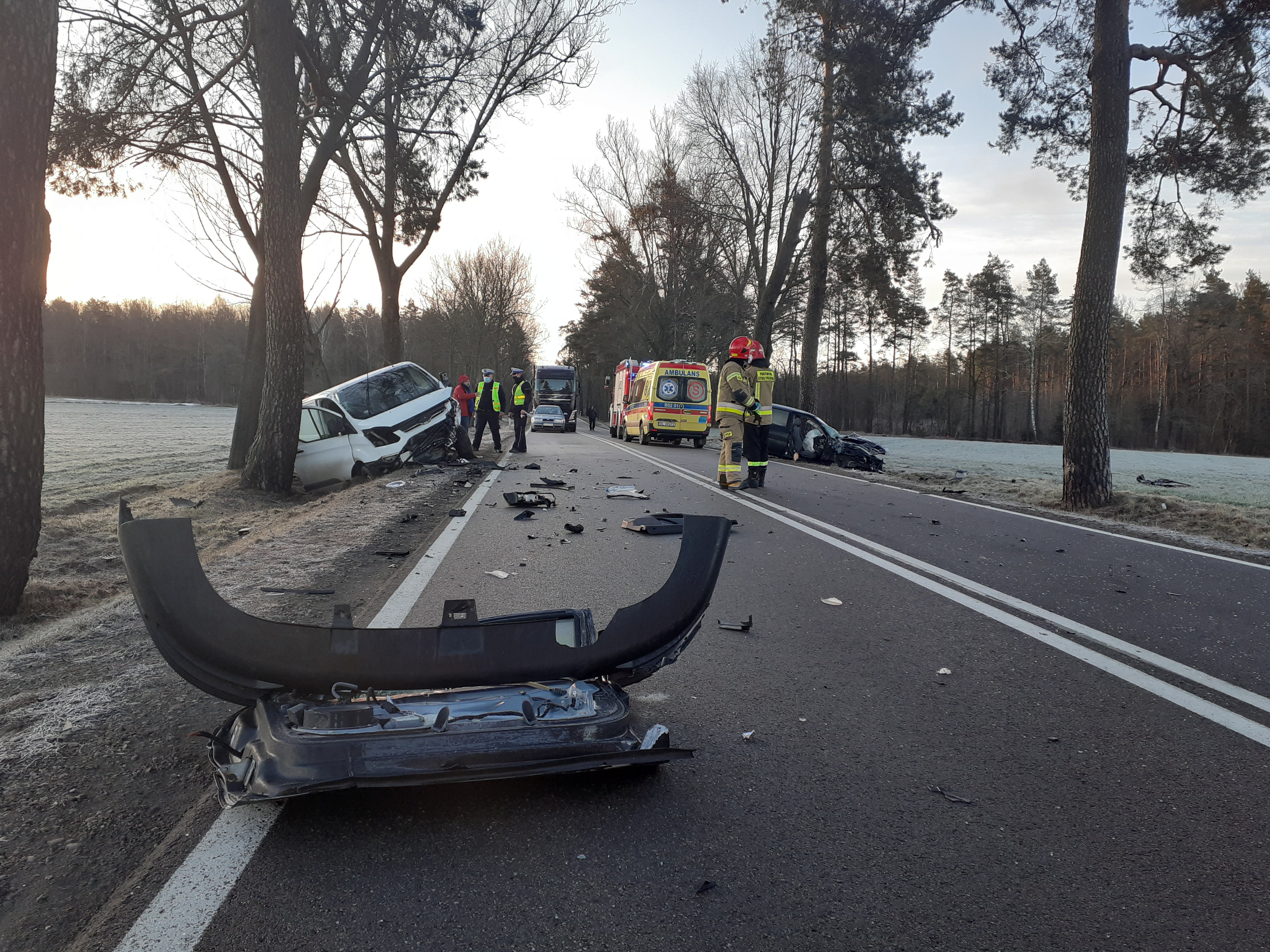 Wypadek z udziałem dwóch samochodów osobowych i samochodu ciężarowego.