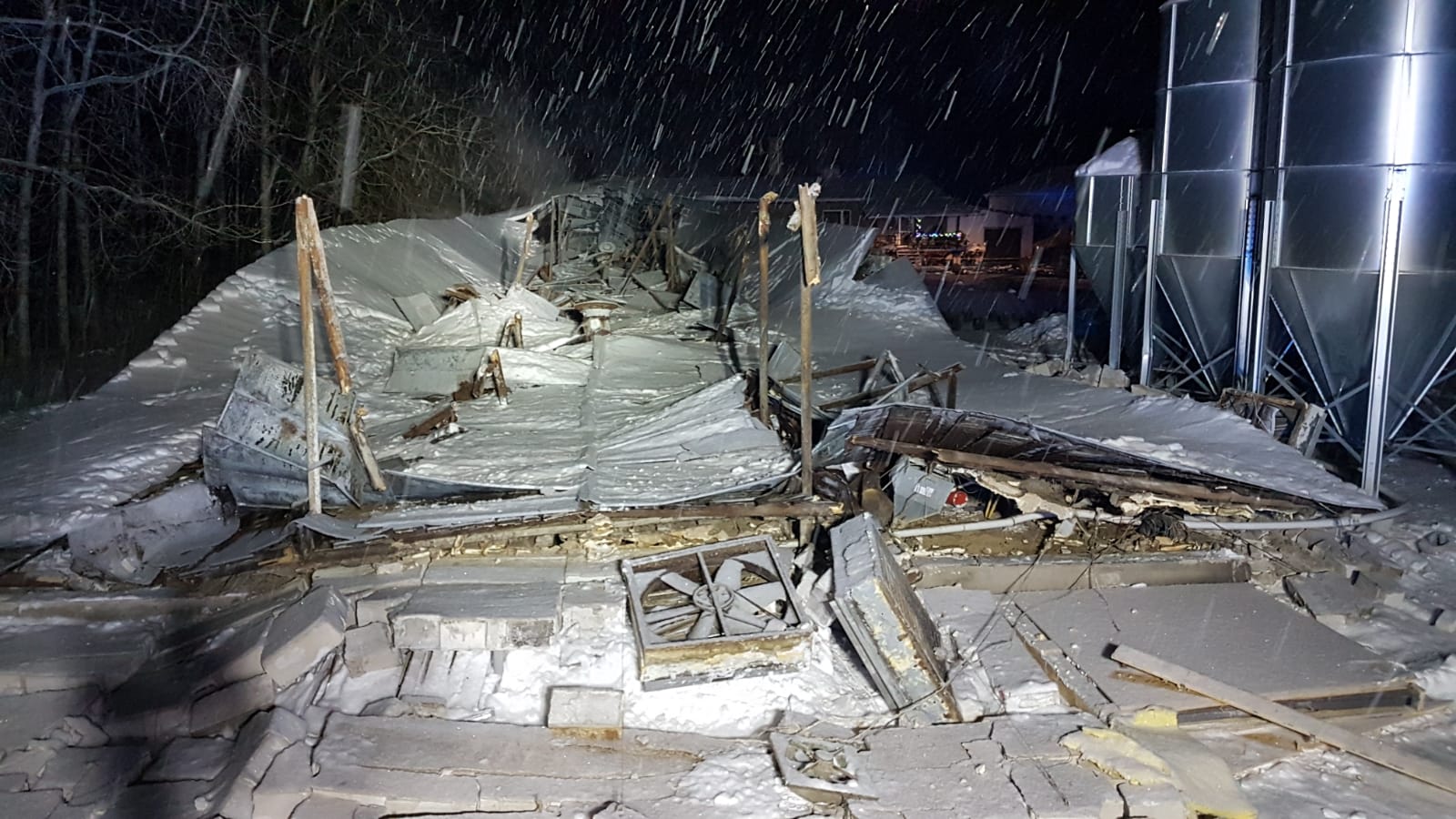 Po dojeździe na miejsce zdarzenia pierwszych zastępów JOP stwierdzono, że w budynku inwentarskim, w którym przetrzymywane są kurczaki w ilości około 25 tyś. sztuk, zawaleniu uległ dach na długości około 50 metrów oraz fragment ściany bocznej i szczytu budynku murowanego krytego blachą o wymiarach 110m x13m x 6m.