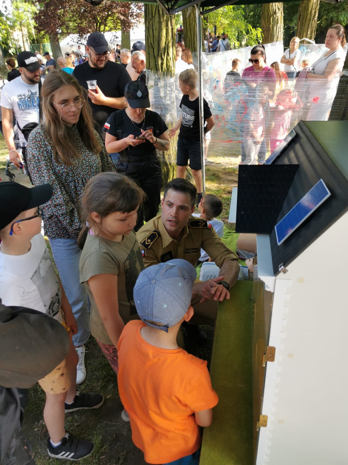 Przy pomocy mobilnego symulatora zagrożeń pożarowych domu jednorodzinnego funkcjonariusze zaprezentowali zagrożenia pożarowe i inne niebezpieczne zdarzenia, jakie mogą mieć miejsce