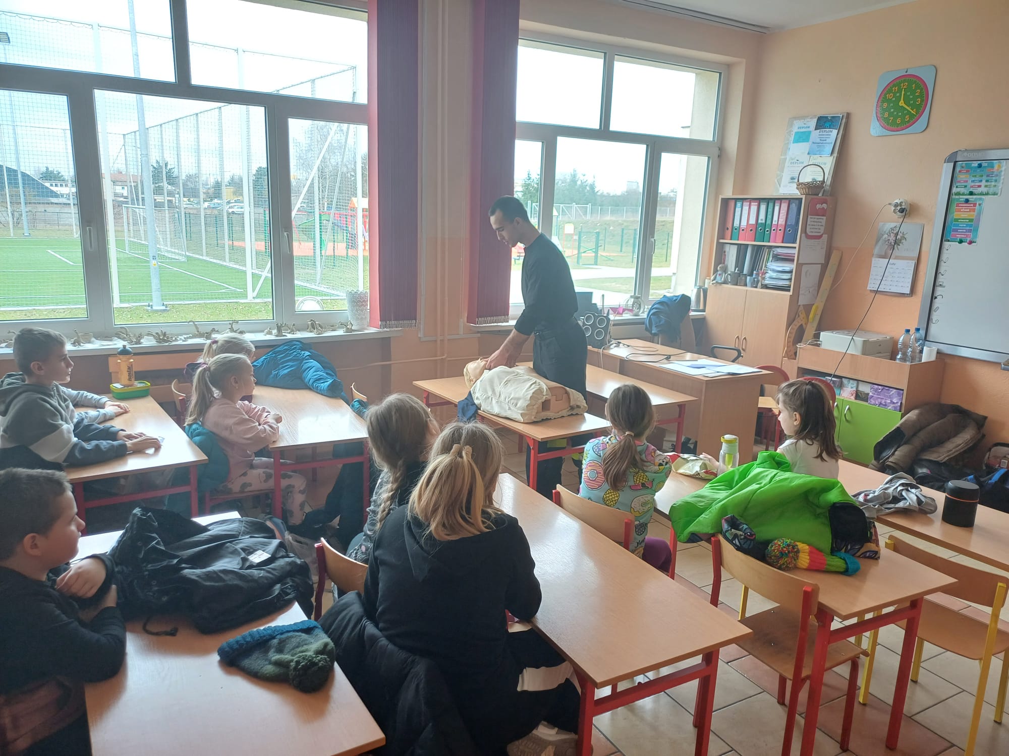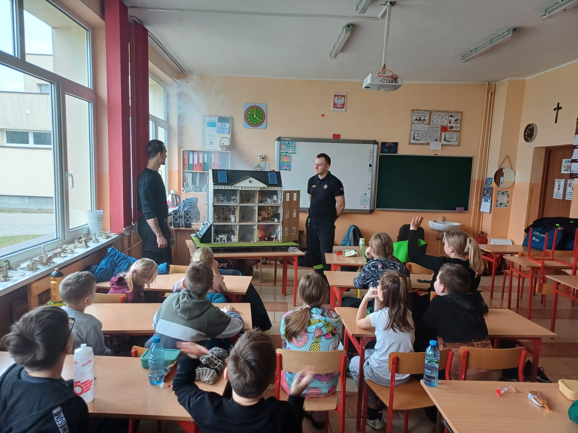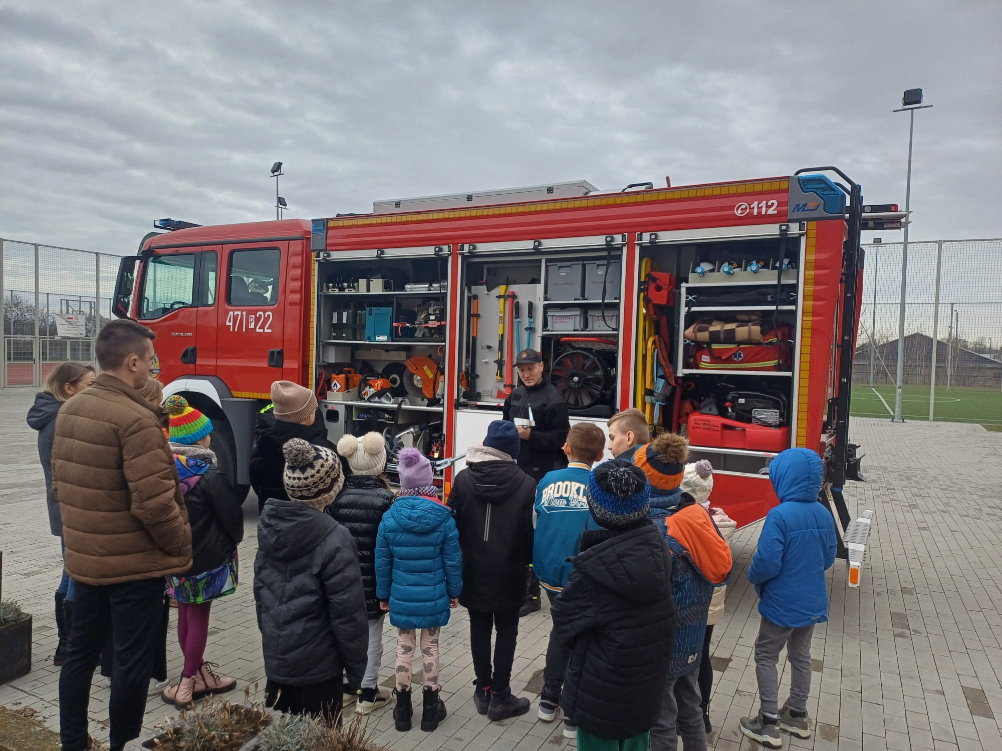 Funkcjonariusze Komendy Powiatowej Państwowej Straży Pożarnej w Kole w dniu 22.02.2024 r. przeprowadzili prewencje społeczną w Szkole Podstawowej nr 5 w Kole podczas organizowanych tam półkolonii dla dzieci. Strażacy przeprowadzili pokaz działania interaktywnego symulatora edukacyjnego, przy pomocy, którego zaprezentowali zagrożenia pożarowe i inne niebezpieczne zdarzenia, jakie mogą mieć miejsce w domu jednorodzinnym. Przedstawiono zasady udzielania kwalifikowanej pierwszej pomocy, zasady postępowania w przypadku zdarzeń nagłych oraz zagrożenia związane z pożarami traw na łąkach i nieużytkach rolnych. Zaprezentowano także umundurowanie i środki ochrony indywidualnej strażaka. Strażacy przypomnieli również dzieciom numery telefonów alarmowych oraz zasady zgłaszania zdarzeń pod numer alarmowy.