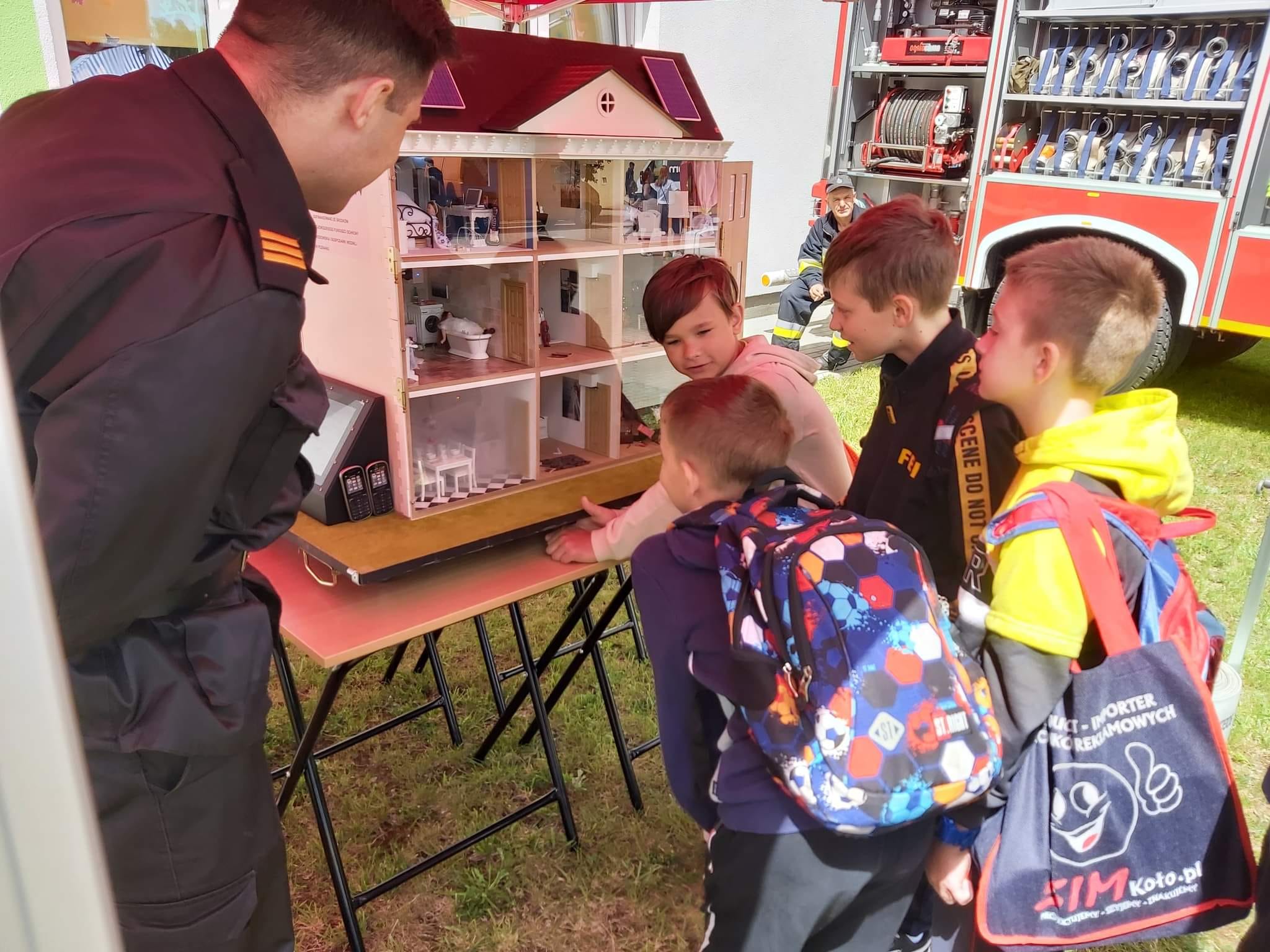 Bardzo dużym zainteresowaniem wśród dzieci cieszył się mobilny symulator zagrożeń pożarowych domu jednorodzinnego. Dzięki urządzeniu strażacy