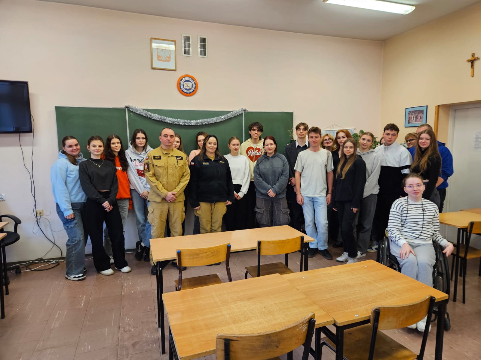 Dnia 17.12.2024 r. funkcjonariusze Komendy Powiatowej Państwowej Straży Pożarnej w Kole mł. kpt. Katarzyna Wojciechowska i mł. kpt. Andrzej Brzoski uczestniczyli w spotkaniu z uczniami klasy IV Liceum Ogólokształcącego im. Kazmierza Wielkiego w Kole. Celem spotkania było przedstawienie przyszłym absolwentom możliwość rozwoju i realizacji zawodowej w służbach mundurowych, ścieżki kariery zawodowej, wymagań zdrowotnych oraz niebezpieczeństw zawiązanych z pełnieniem służby.