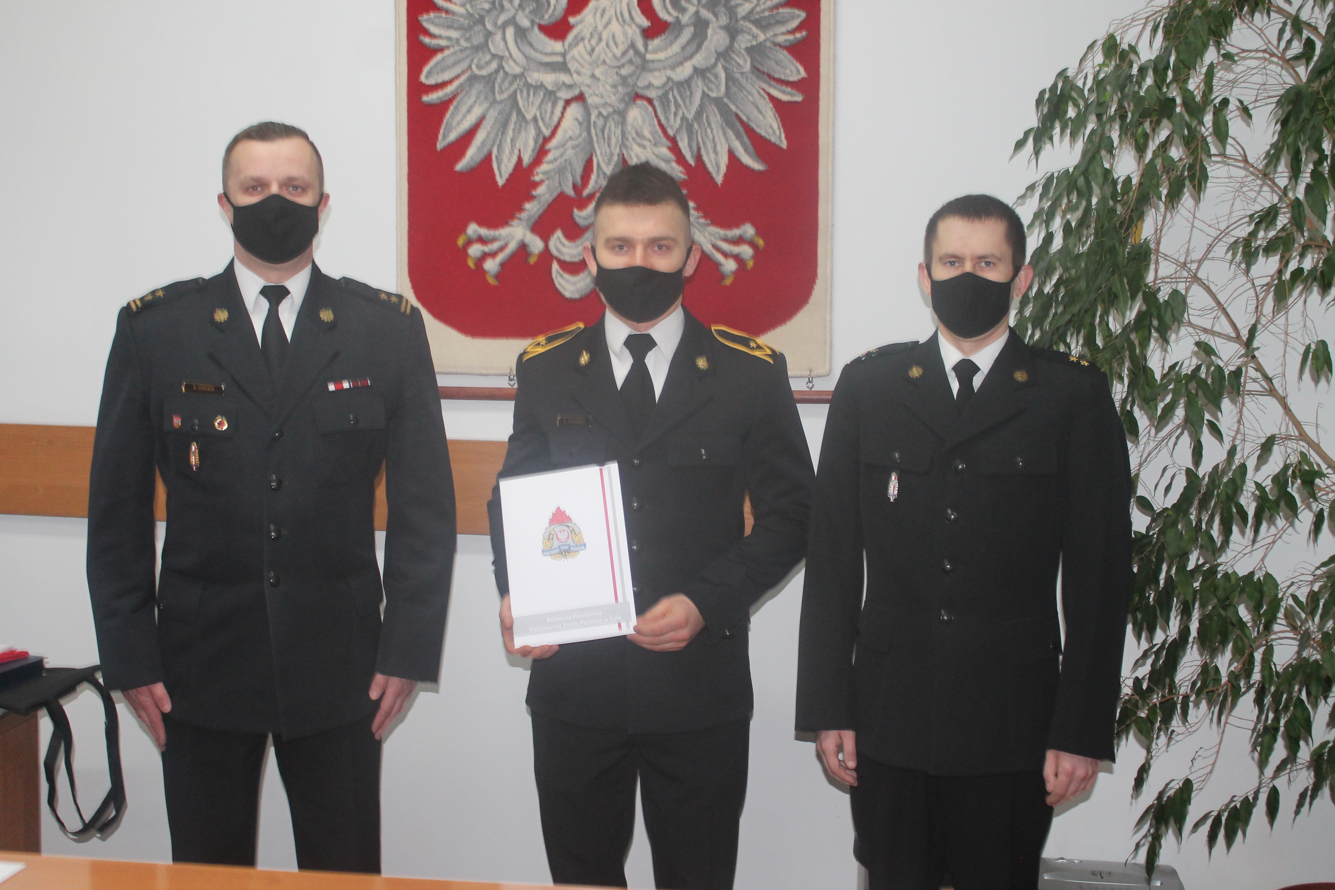 Dnia 30.12.2021 r. komendant powiatowy PSP w Kole bryg. Krzysztof Żurawik przekazał na ręce mł. asp. Konrada Siwińskiego podziękowania za akcję ratowniczo-gaśniczą prowadzoną poza granicami kraju od Ministra Spraw Wewnętrznych i Administracji Pana Mariusza Kamińskiego w postaci ryngrafu, flagi Polski oraz emblematu na ramię. Podczas spotkania komendant powiatowy PSP w Kole bryg. Krzysztof Żurawik wręczył również mł. asp. Konradowi Siwińskiemu akt mianowania na wyższe stanowisko służbowe inspektora w Wydziale Operacyjno-Kontrolno-Rozpoznawczym.