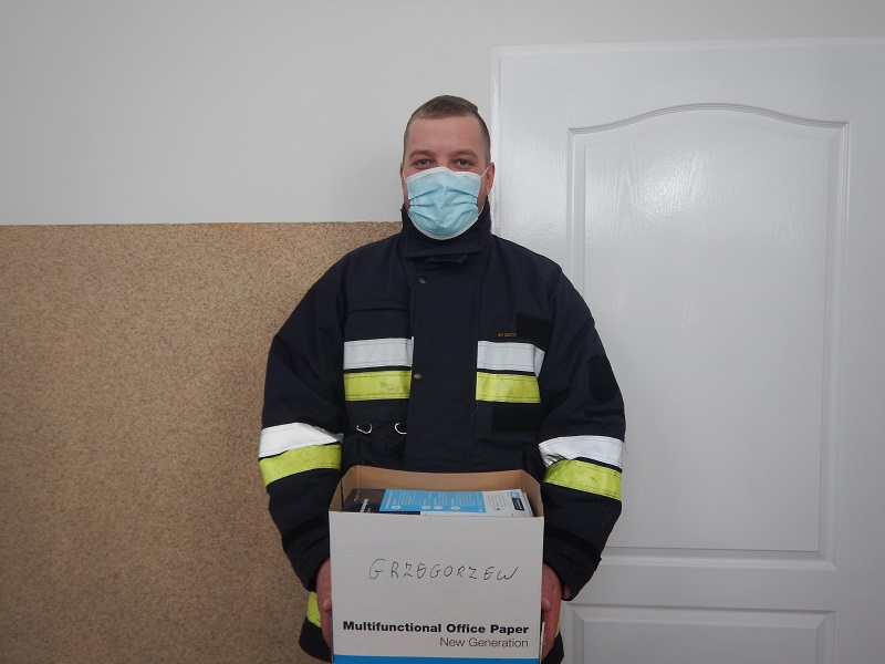Zdjęcie przedstawia przekazanie ulotek Komendantowi gminnemu OSP. Strażak ubrany jest w ubranie typu NOMEX oraz maseczkę.