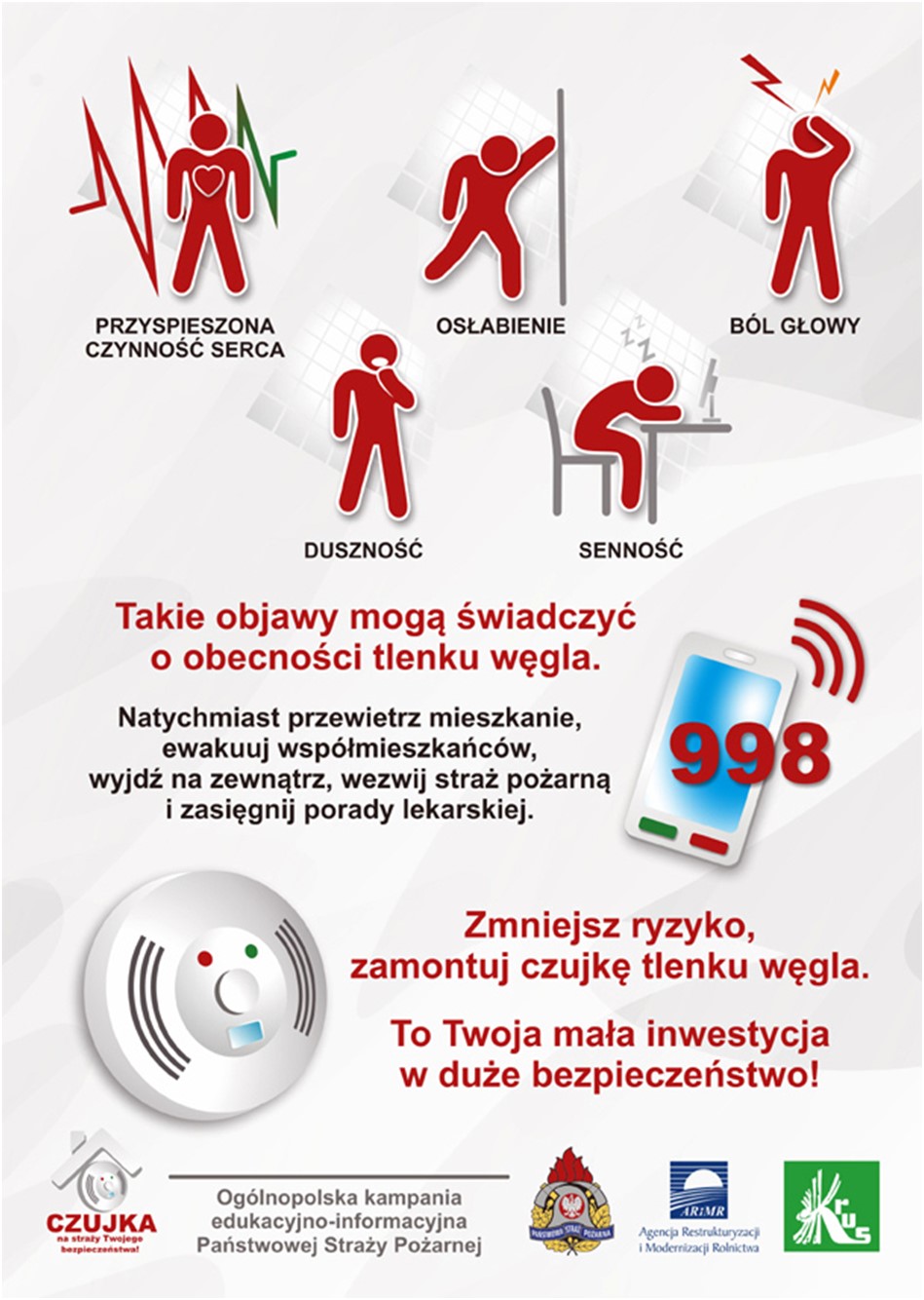 - Państwowa Straż Pożarna rekomenduje instalowanie czujek dymu i tlenku węgla.
