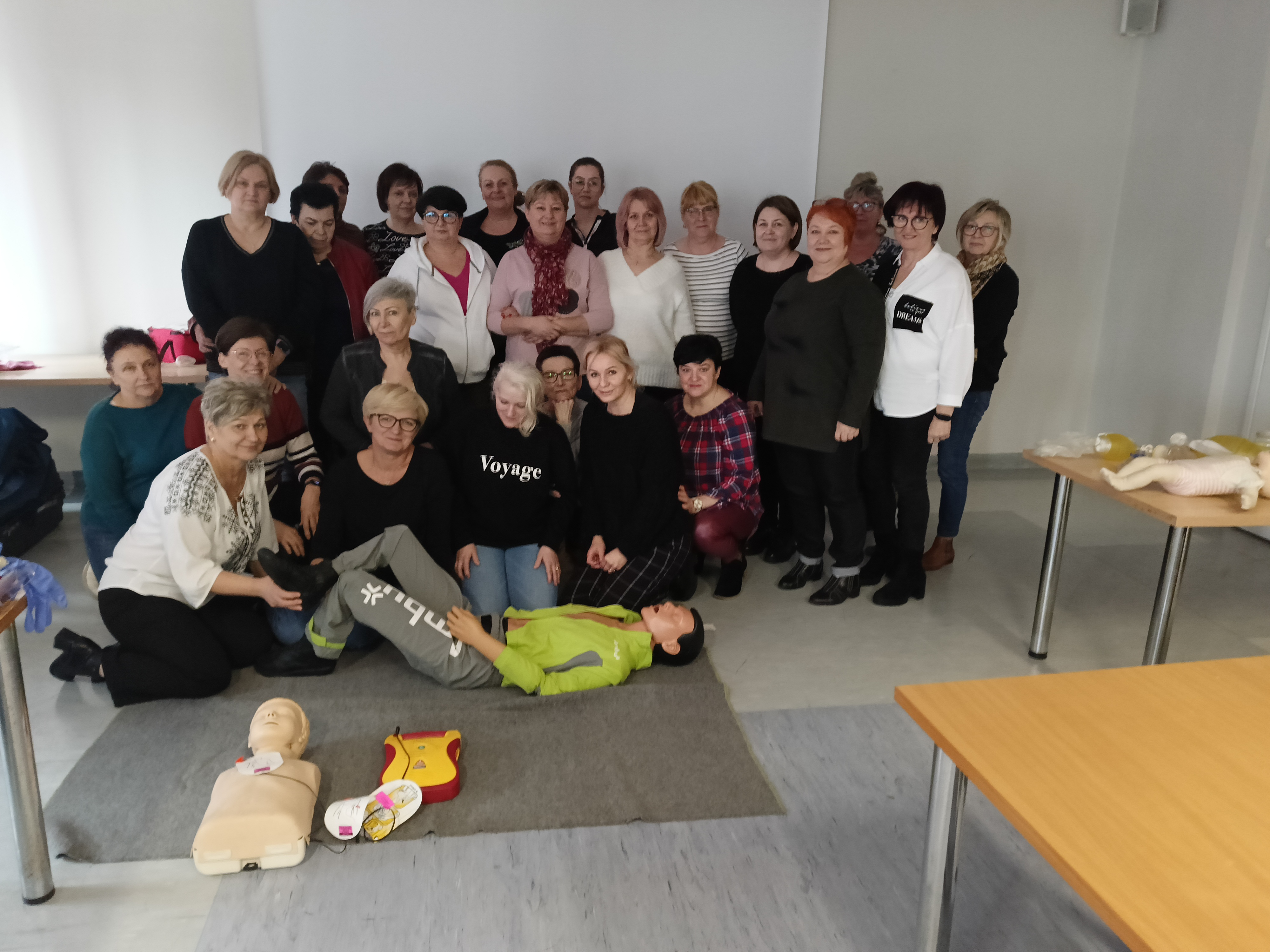 Szkolenie obejmowało zakres udzielania Kwalifikowanej Pierwszej Pomocy w sytuacjach wystąpienia nagłego zatrzymania krążenia oraz zadławienia u osób dorosłych, dzieci oraz noworodków z wykorzystaniem defibrylatora AED i sprzętu medycznego.