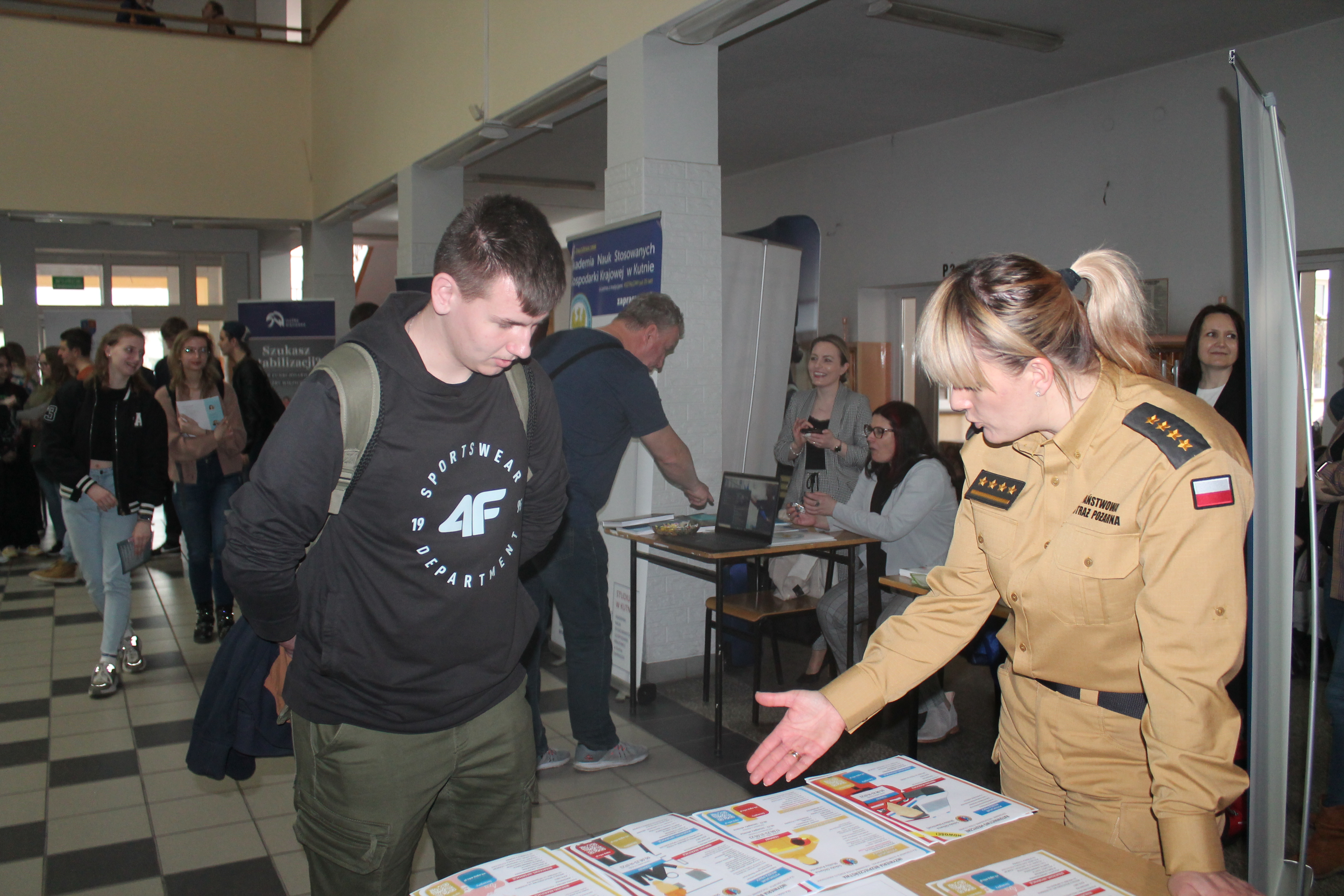 19 kwietnia 2023 r. w Liceum Ogólnokształcącym im. Kazimierza Wielkiego w Kole odbyły się Targi Akademickie Uczelni Wyższych i Szkół Policealnych w Kole. Przedsięwzięcie zostało zorganizowane przez Liceum Ogólnokształcące w Kole oraz Społeczną Akademię Nauk. Podczas targów swoją ofertę zaprezentowało kilkanaście publicznych i niepublicznych uczelni wyższych a także instytucji szkoleniowych. Komenda Powiatowa PSP w Kole również zorganizowała swoje stoisko. Funkcjonariuszki Wydziału Kwatermistrzowsko - Kadrowego Komendy Powiatowej PSP w Kole st. kpt. Joanna Wolna i mł. kpt. Katarzyna Wojciechowska propagowały zawód oficera PSP poprzez zapoznawanie zainteresowanych z procedurami naboru do Szkoły Głównej Służby Pożarniczej w Warszawie – zarówno studia mundurowe jak i cywilne, w tym nowopowstały kierunek ratownictwo medyczne oraz do Szkół Aspirantów Państwowej Straży Pożarnej. Prowadzące stoisko udzielały szczegółowych informacji dotyczących specyfiki zawodu strażaka oraz rozdawały materiały związane z zasadami rekrutacji do szkół pożarniczych. Stoisko cieszyło się dużym zainteresowaniem. |