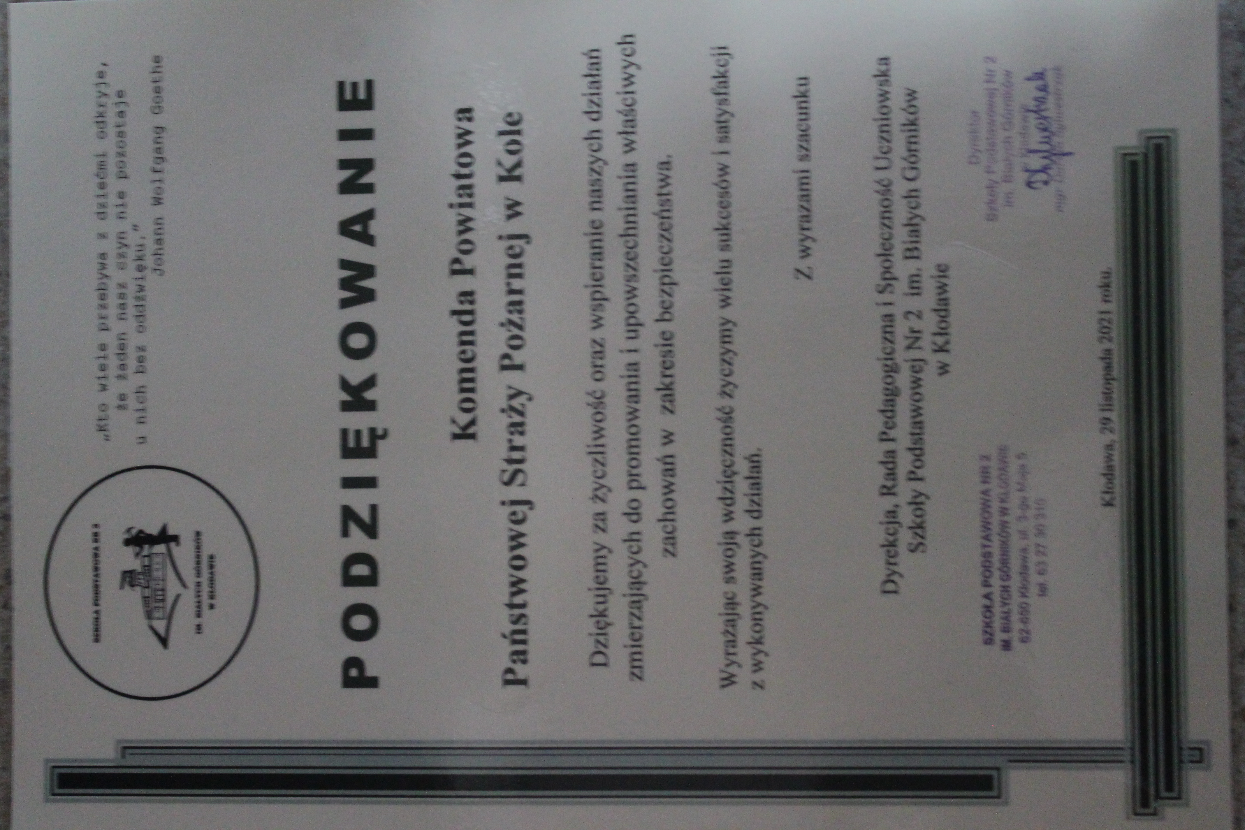 Dnia 29 listopada 2021 roku strażacy z Komendy Powiatowej Państwowej Straży Pożarnej w Kole odwiedzili uczniów Szkoły Podstawowej Nr 2 im. Białych Górników w Kłodawie. Podczas spędzonych chwil ze strażakami, dzieci z wielkim zainteresowaniem wysłuchały informacji na temat specyfiki strażackiej służby, akcji ratowniczych oraz najczęstszych przyczyn powstawania pożarów. Do tego celu strażacy wykorzystali mobilny symulator zagrożeń pożarowych domu jednorodzinnego, który jak zawsze spełnił swoją rolę i dzięki zastosowanym efektom specjalnym wywołał wielkie emocje i niemałe poruszenie na sali lekcyjnej. Dzięki urządzeniu strażacy w ciekawy i przystępny sposób mogą przestrzec dzieci przed zagrożeniami pożarowymi mogącymi wystąpić w naszych domach, wskazać jak postępować w przypadku ich wystąpienia, a co najważniejsze, jak im skutecznie zapobiegać.