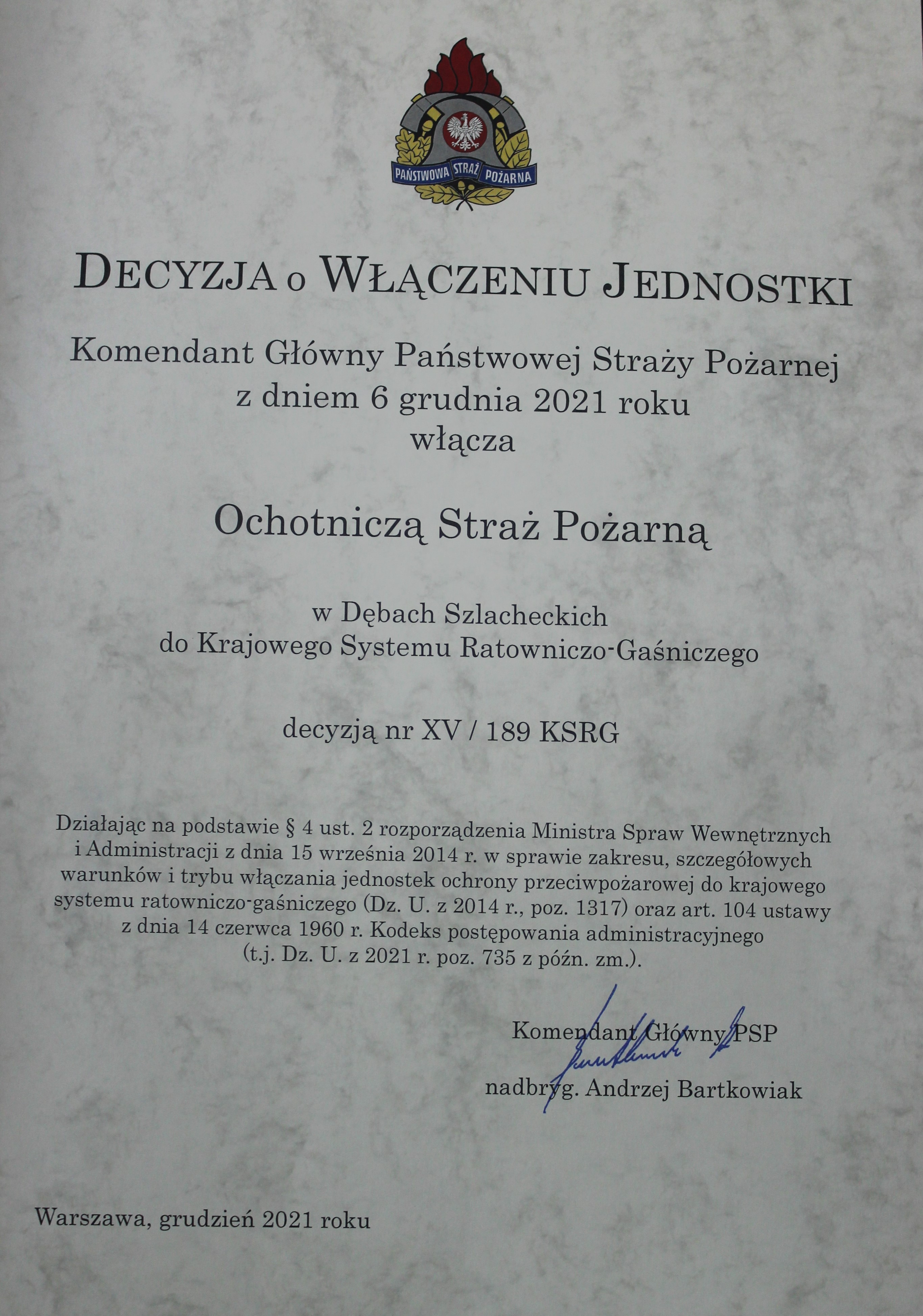 WŁĄCZENIE JEDNOSTKI OSP DĘBY SZLACHECKIE DO KRAJOWEGO SYSTEMU RATOWNICZO-GAŚNICZEGO NA KOLEJNE 5 LAT