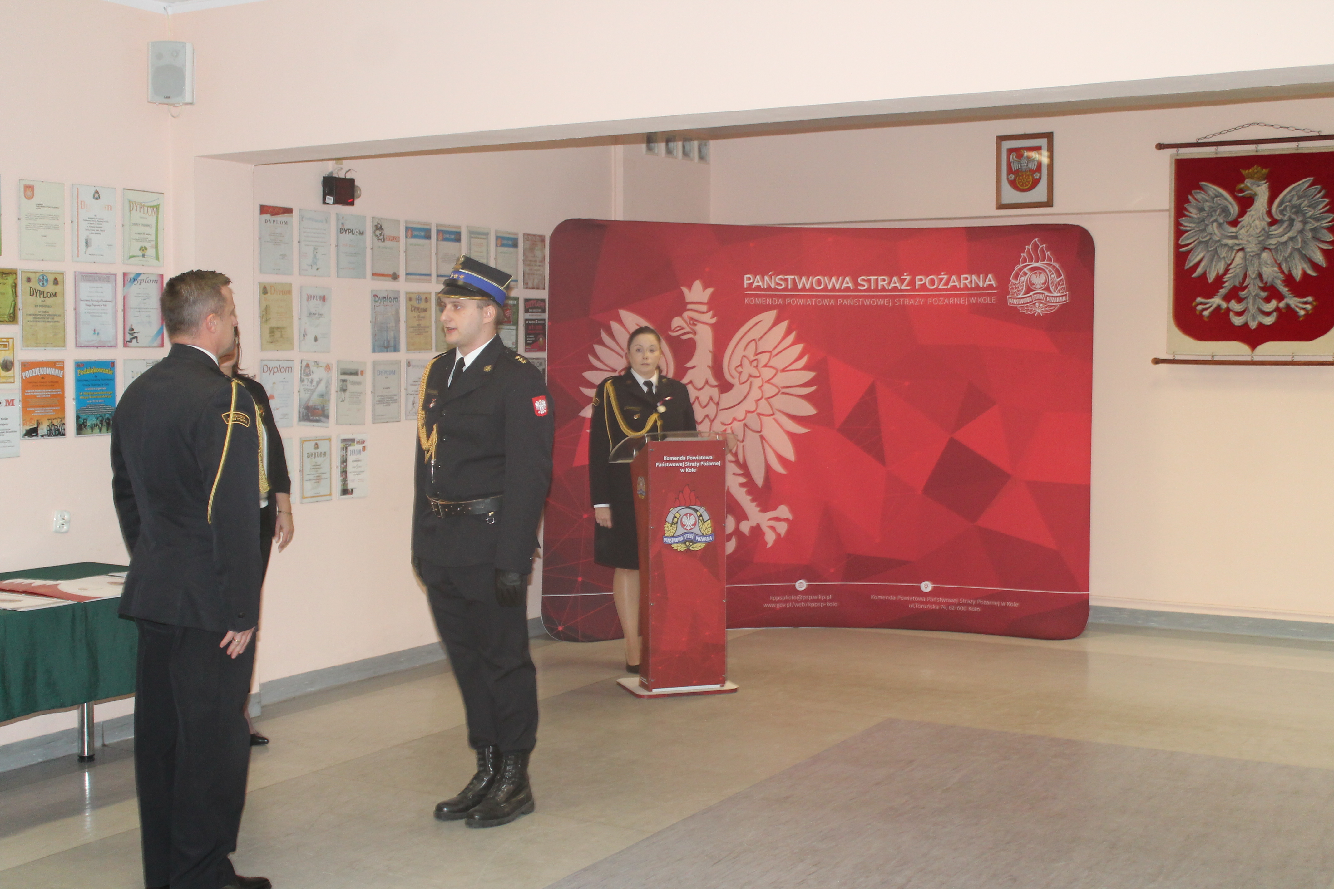 Uroczysta zbiórka rozpoczęła się od złożenia meldunku przez dowódcę uroczystości kpt. Marcina Chodkowskiego komendantowi powiatowemu PSP w Kole st. bryg. Krzysztofowi Żurawikowi. Po wprowadzeniu sztandaru Komendy Powiatowej Państwowej Straży Pożarnej w Kole oraz odśpiewaniu Hymnu Narodowego nastąpiło wręczenie wyróżnień oraz aktów nadania wyższych stopni służbowych, których dokonał komendant powiatowy PSP w Kole st. bryg. Krzysztof Żurawik.