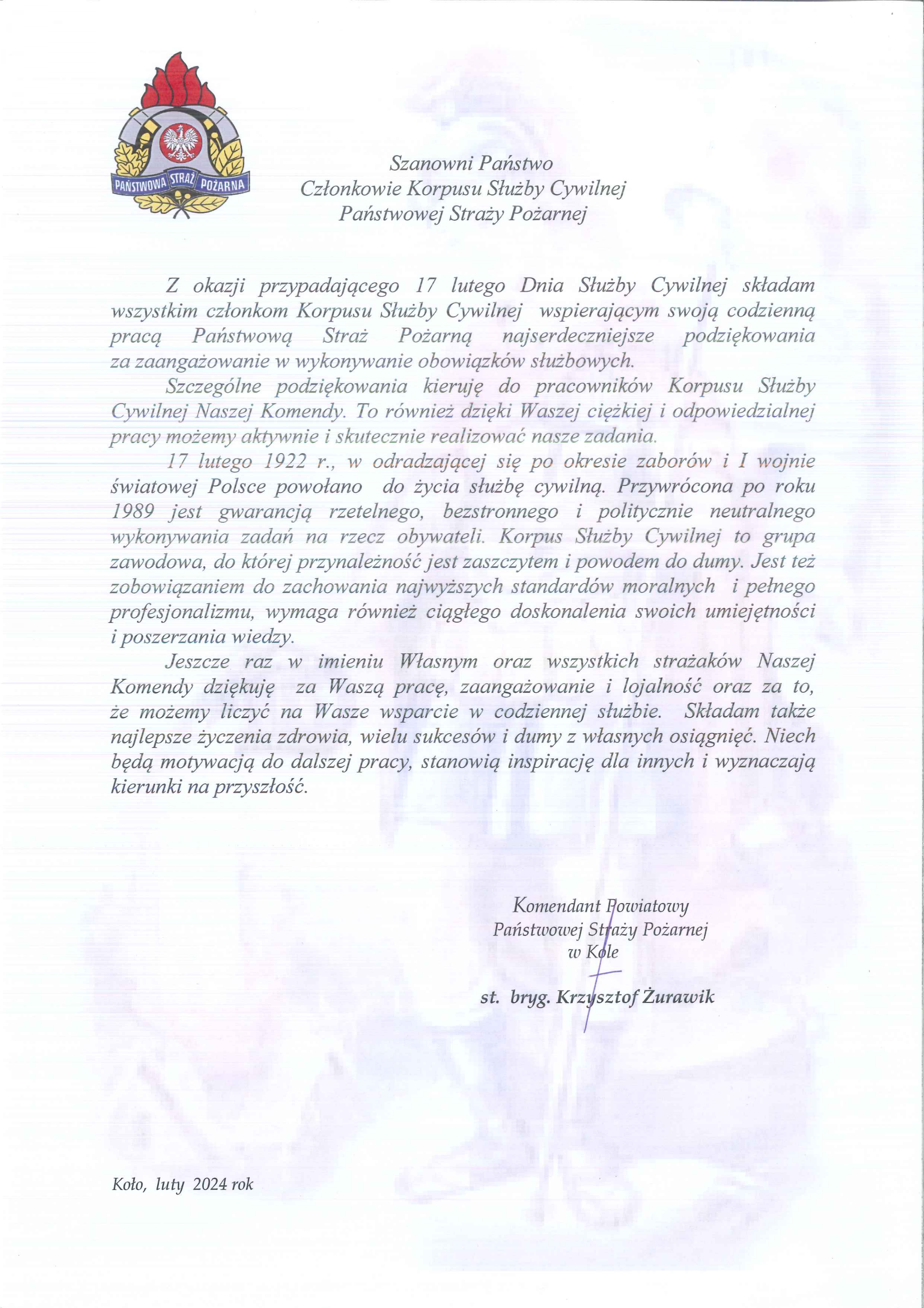 ŻYCZENIA KOMENDANTA POWIATOWEGO PSP W KOLE Z OKAZJI DNIA SŁUŻBY CYWILNEJ 16.02.2024 Zdjęcia (1) Pokaż zdjęcie 1 z galerii.