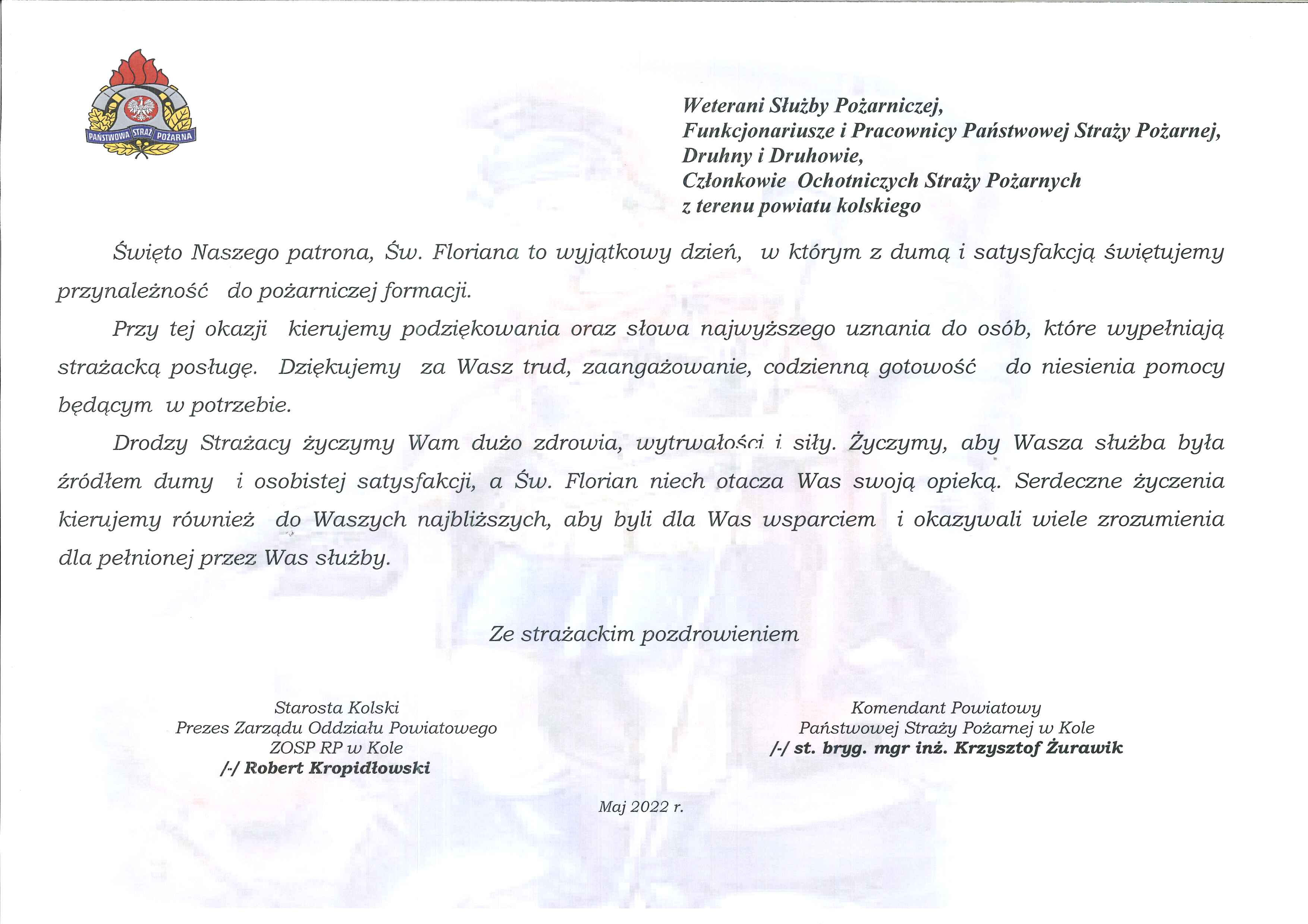 ŻYCZENIA KOMENDANTA POWIATOWEGO PSP W KOLE Z OKAZJI DNIA STRAŻAKA