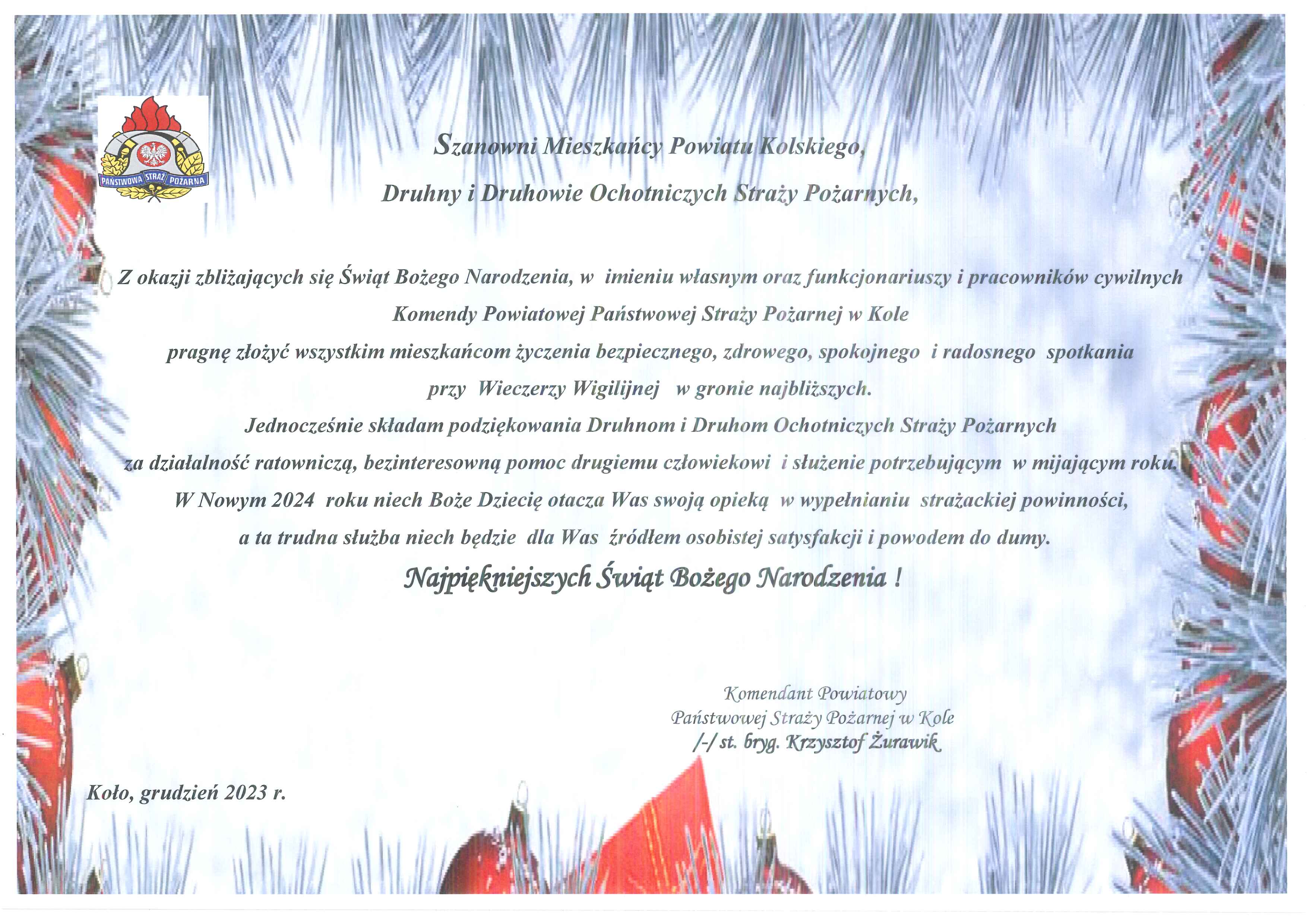 ŻYCZENIA KOMENDANTA POWIATOWEGO PSP W KOLE Z OKAZJI ŚWIĄT BOŻEGO NARODZENIA 20.12.2023 Zdjęcia (1) Pokaż zdjęcie 1 z galerii.