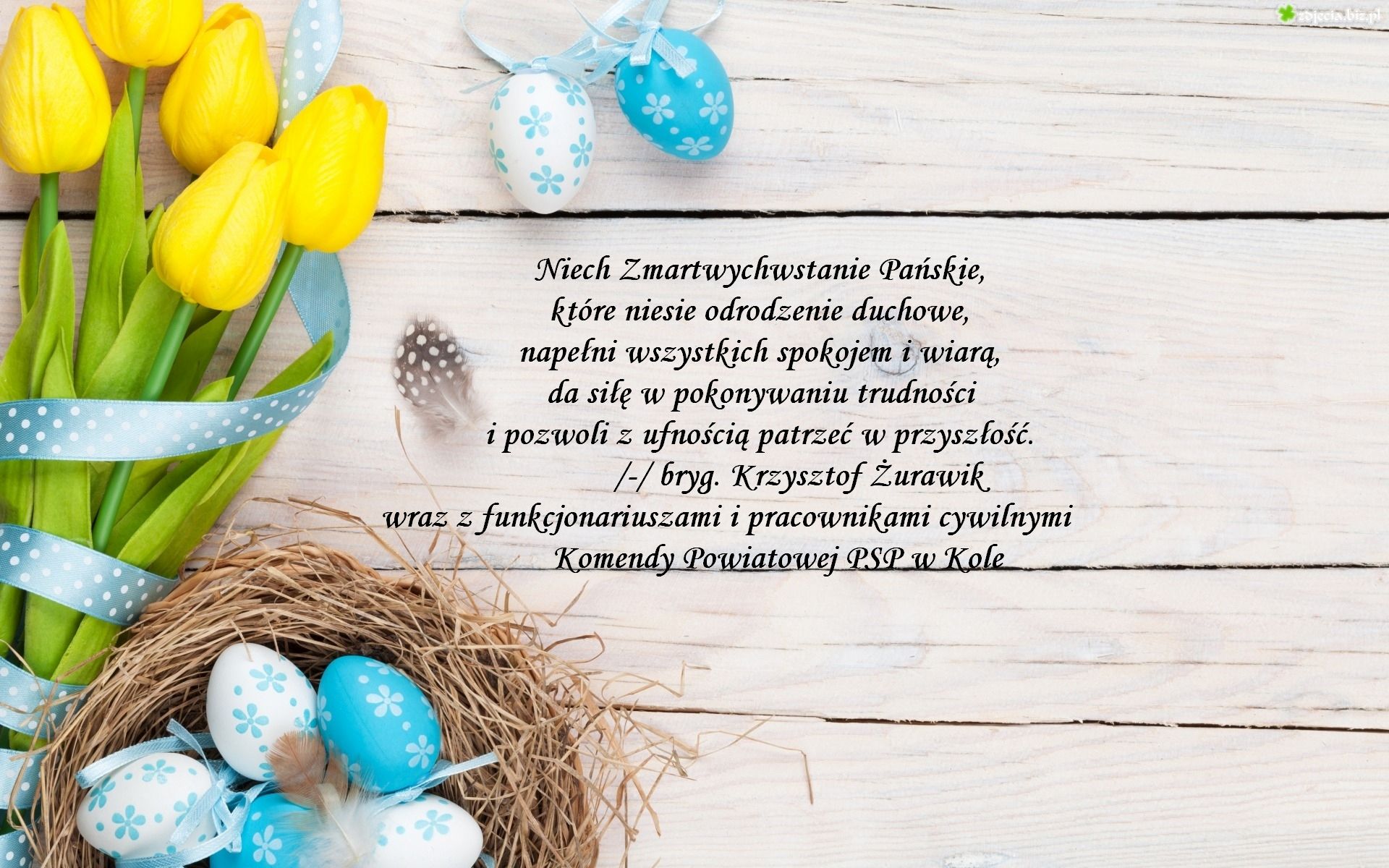 ŻYCZENIA KOMENDANTA POWIATOWEGO PSP W KOLE Z OKAZJI ŚWIĄT WIELKANOCNYCH 15.04.2022 Zdjęcia (1) Pokaż zdjęcie 1 z galerii.