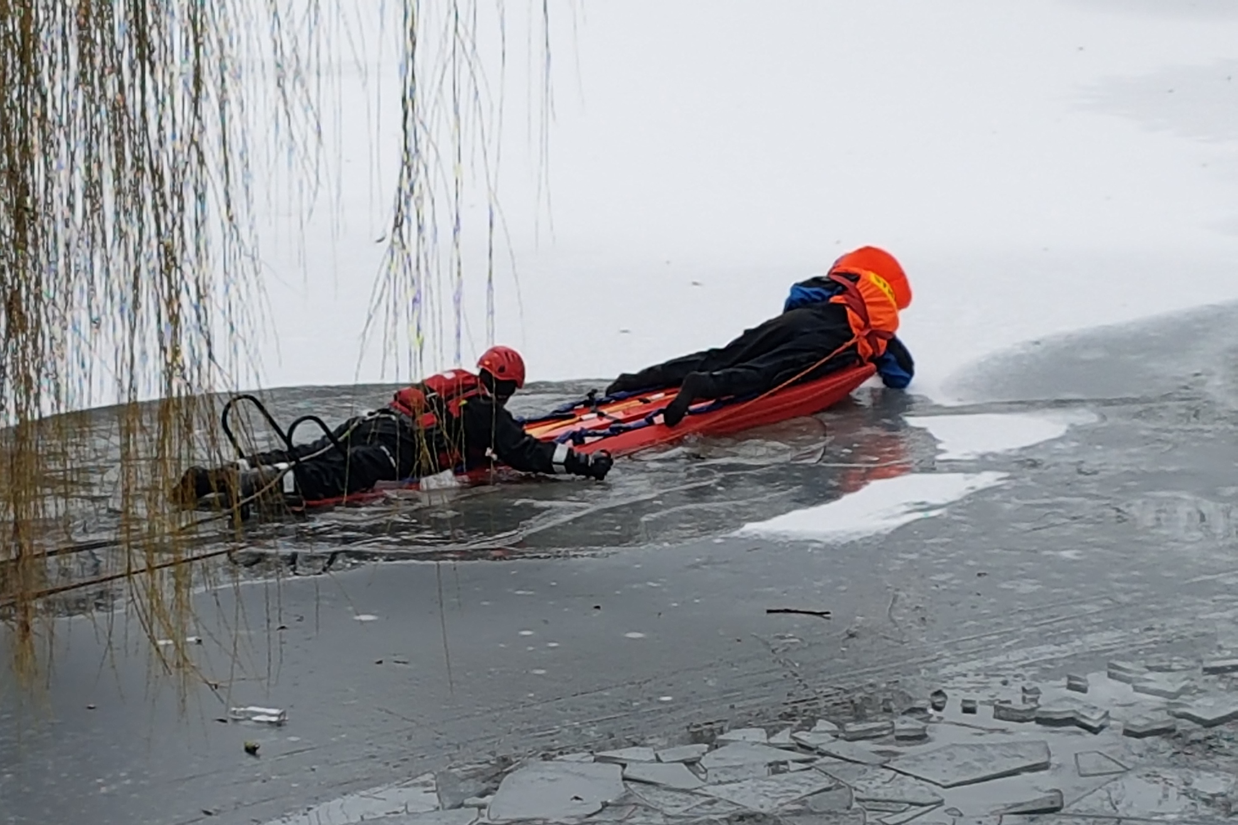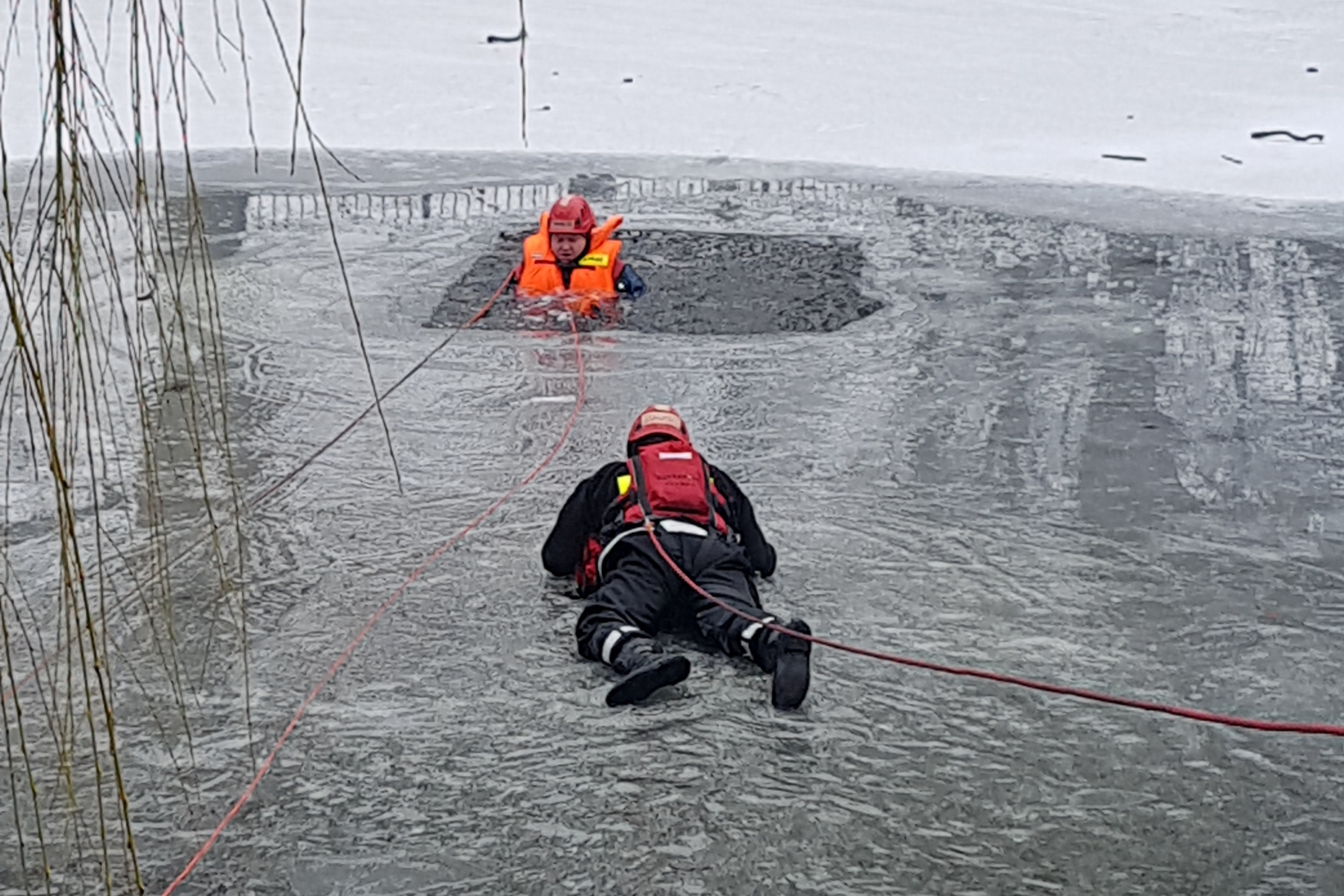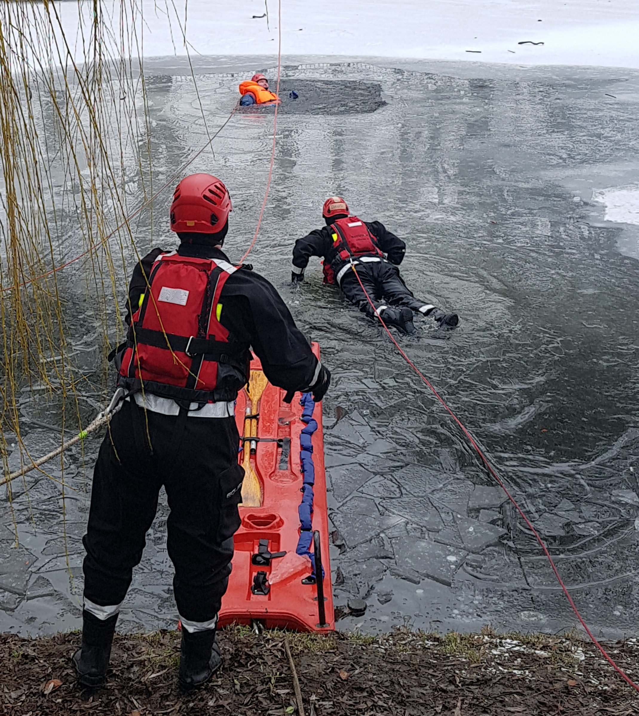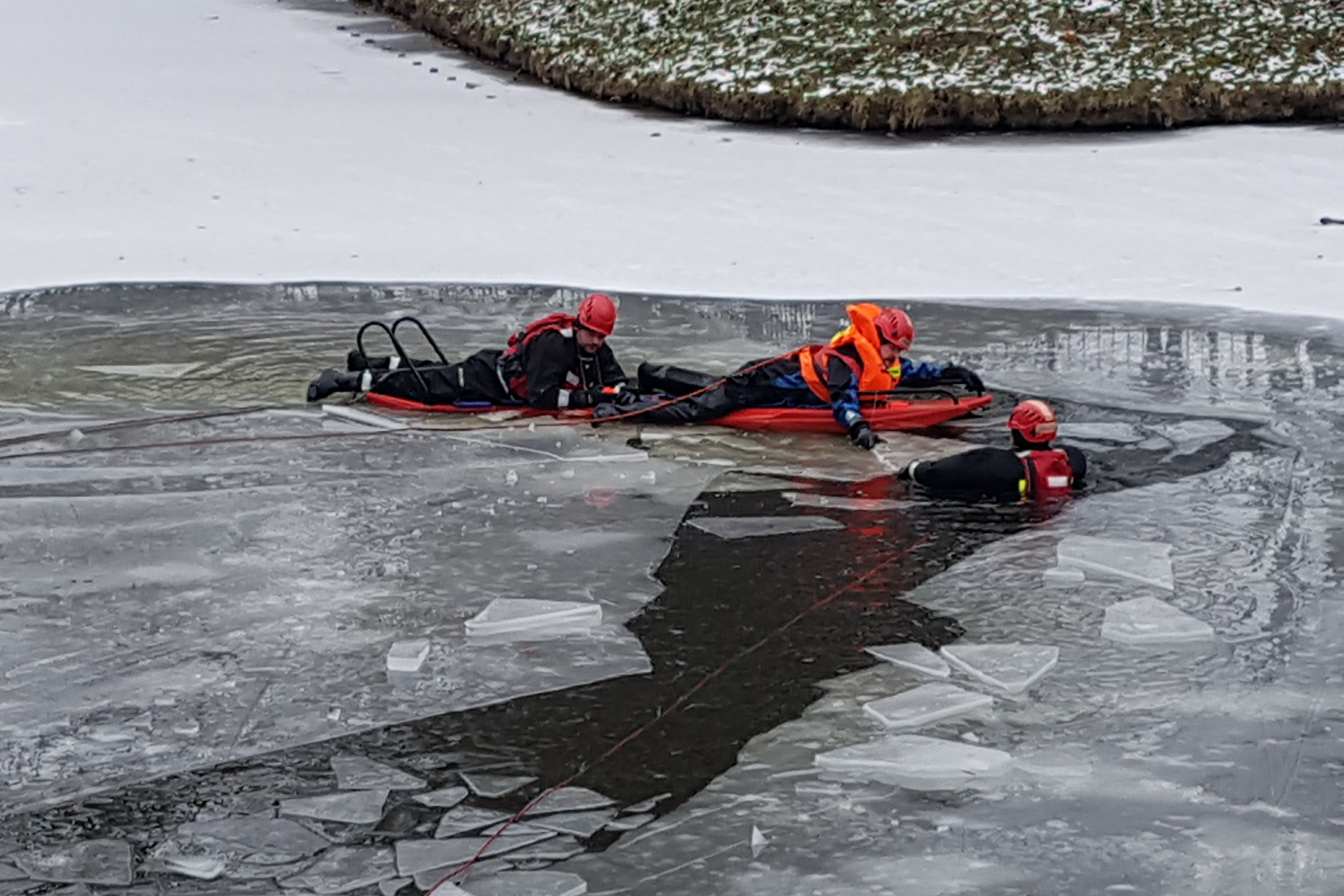 W dniach 02-05 lutego br. w ramach szkolenia zawodowego, na zamarzniętym stawie w parku im. H. Dąbrowskiego w Kołobrzegu, przeprowadzony został cykl ćwiczeń, których celem było doskonalenie postępowania podczas działań ratowniczych na zamarzniętych akwenach wodnych. W trakcie zajęć przećwiczone zostały różne warianty akcji ratowniczych m.in. z użyciem sań lodowych i linek ratowniczych. Strażacy przećwiczyli również różne techniki samoratowania na wypadek załamania się pod nimi lodu.