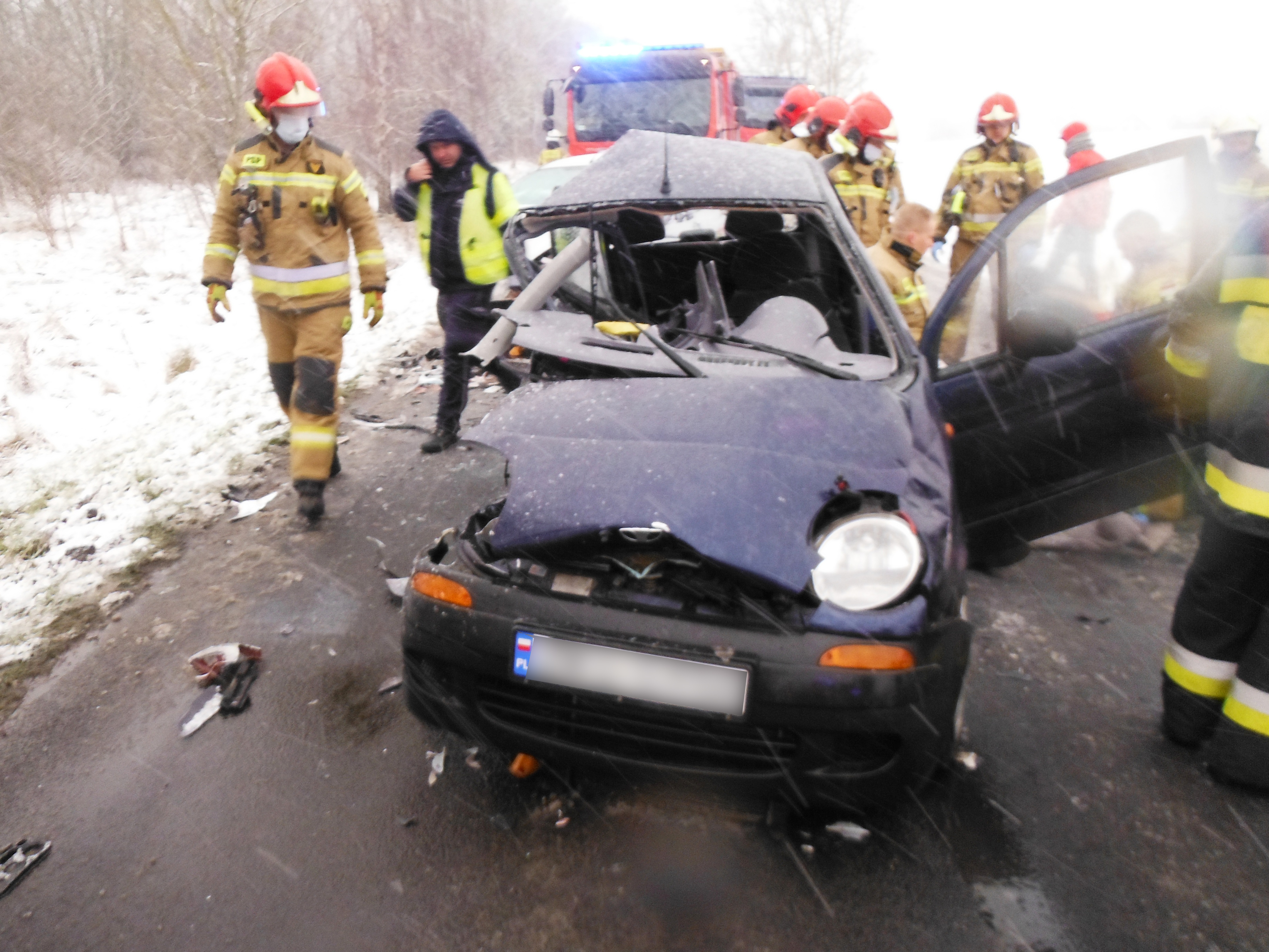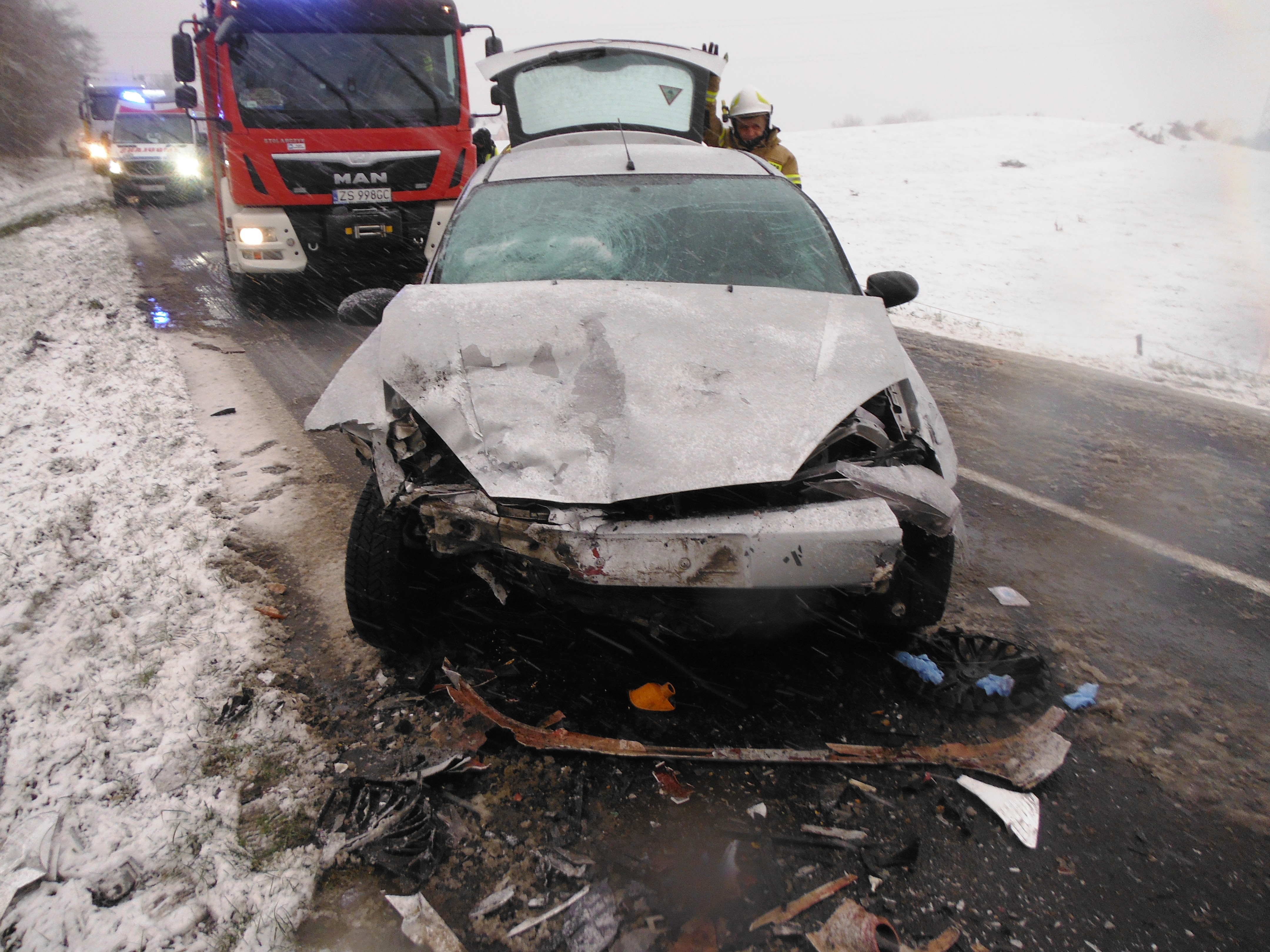 Natychmiast na miejsce zdarzenia zadysponowanych zostało 5 zastępów z JRG Kołobrzeg, OSP Dygowo oraz OSP Czernin. Po przybyciu na miejsce zdarzenia okazało się, że na prostym odcinku drogi doszło do zderzenia dwóch samochodów osobowych - Daewoo Matiz oraz Forda Fokusa. W wyniku zdarzenia ranni zostali obaj kierowcy. Pierwszej pomocy medycznej nieprzytomnemu kierowcy Daewoo, udzieliły przypadkowe osoby, które były świadkami zdarzenia - wracający ze służby strażak z JRG Kołobrzeg oraz ratownicy WOPR z Białogardu. Kierowcę koreańskiej osobówki, 29-letniego obywatela Ukrainy, w stanie ciężkim ratownicy medyczni przetransportowali do kołobrzeskiego szpitala. Do szpitala trafił również lżej ranny kierowca Forda. Okoliczności wypadku ustala kołobrzeska policja.