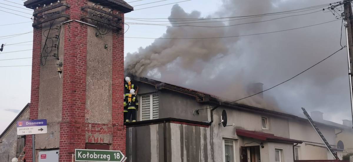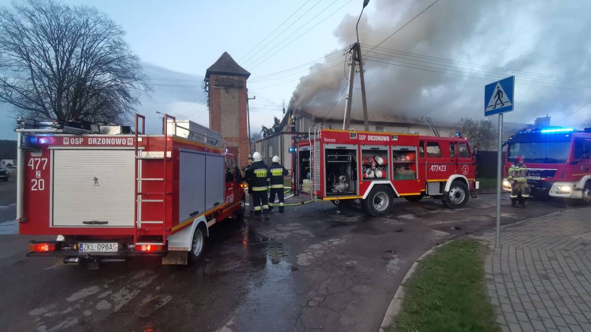 Około godziny 19:29 do stanowiska kierowania PSP w Kołobrzegu wpłynęła informacja o pożarze poddasza w budynku wielorodzinnym zlokalizowanym w m. Drzonowo (gm. Kołobrzeg).