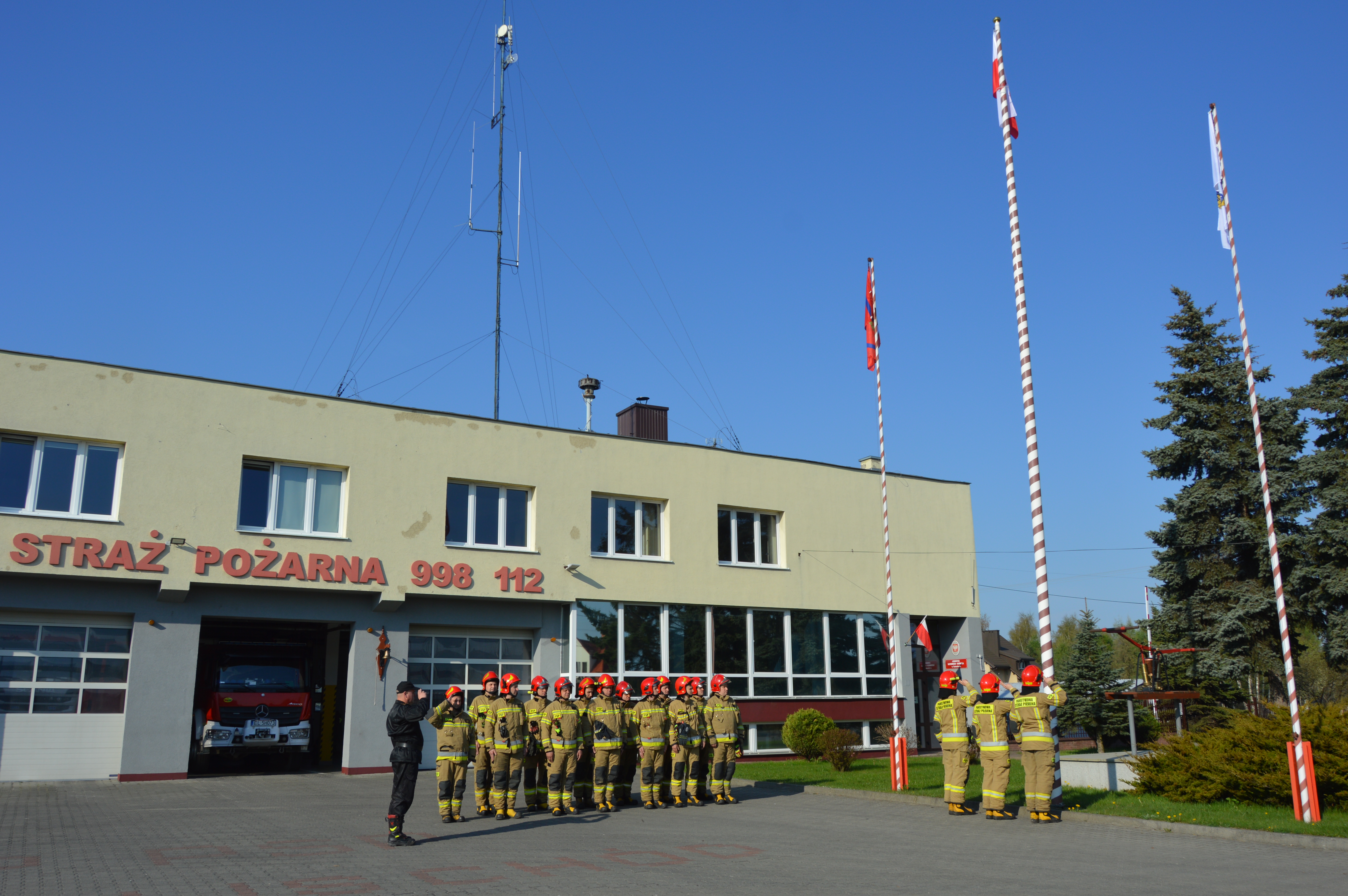 W związku z obchodzonym w Polsce Dniem Flagi Rzeczypospolitej Polskiej, przed siedzibą Komendy Powiatowej Państwowej Straży Pożarnej powiatu łódzkiego wschodniego odbyła się uroczysta zmiana służby, podczas której dokonano podniesienia Flagi na maszt.