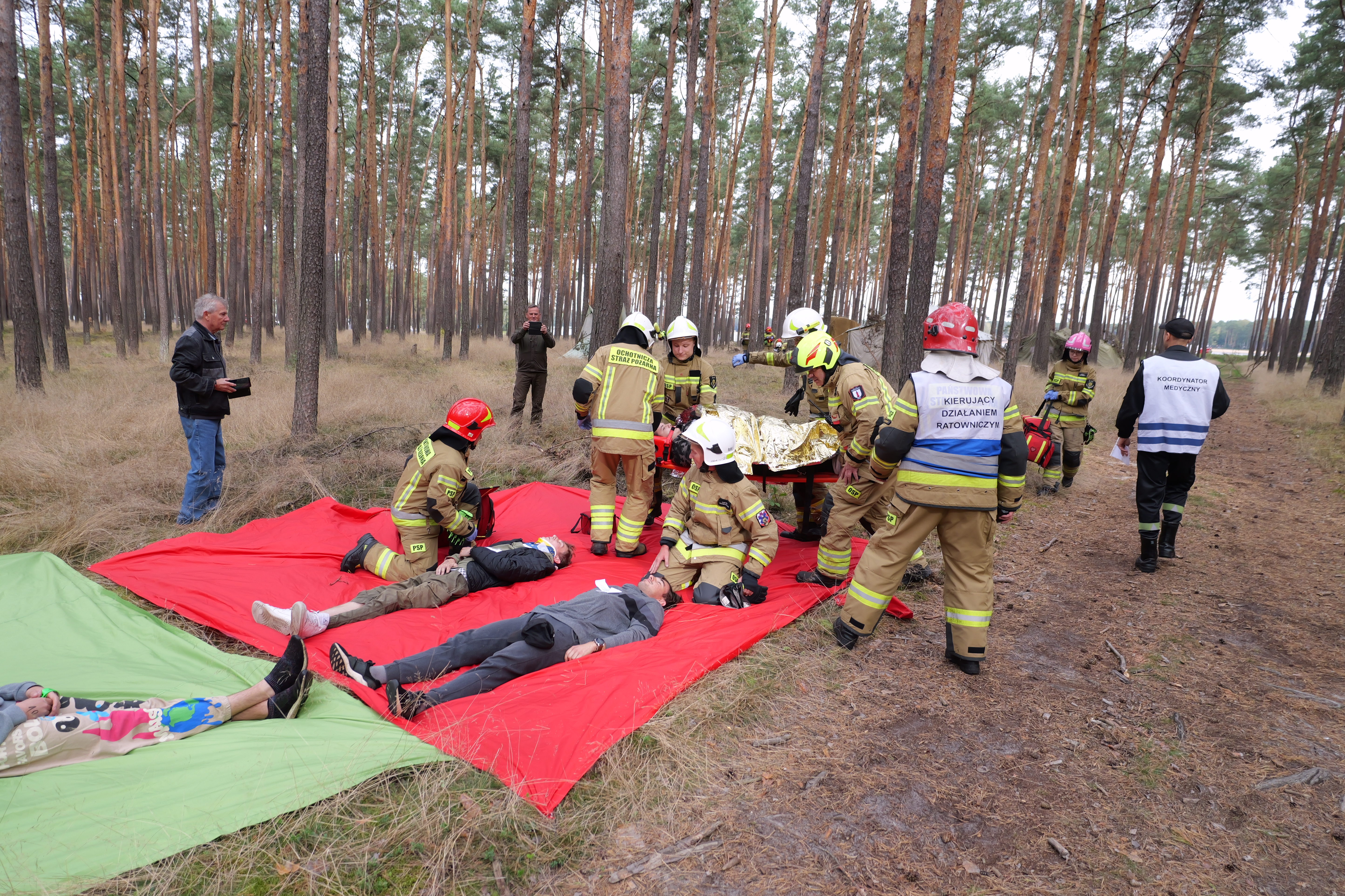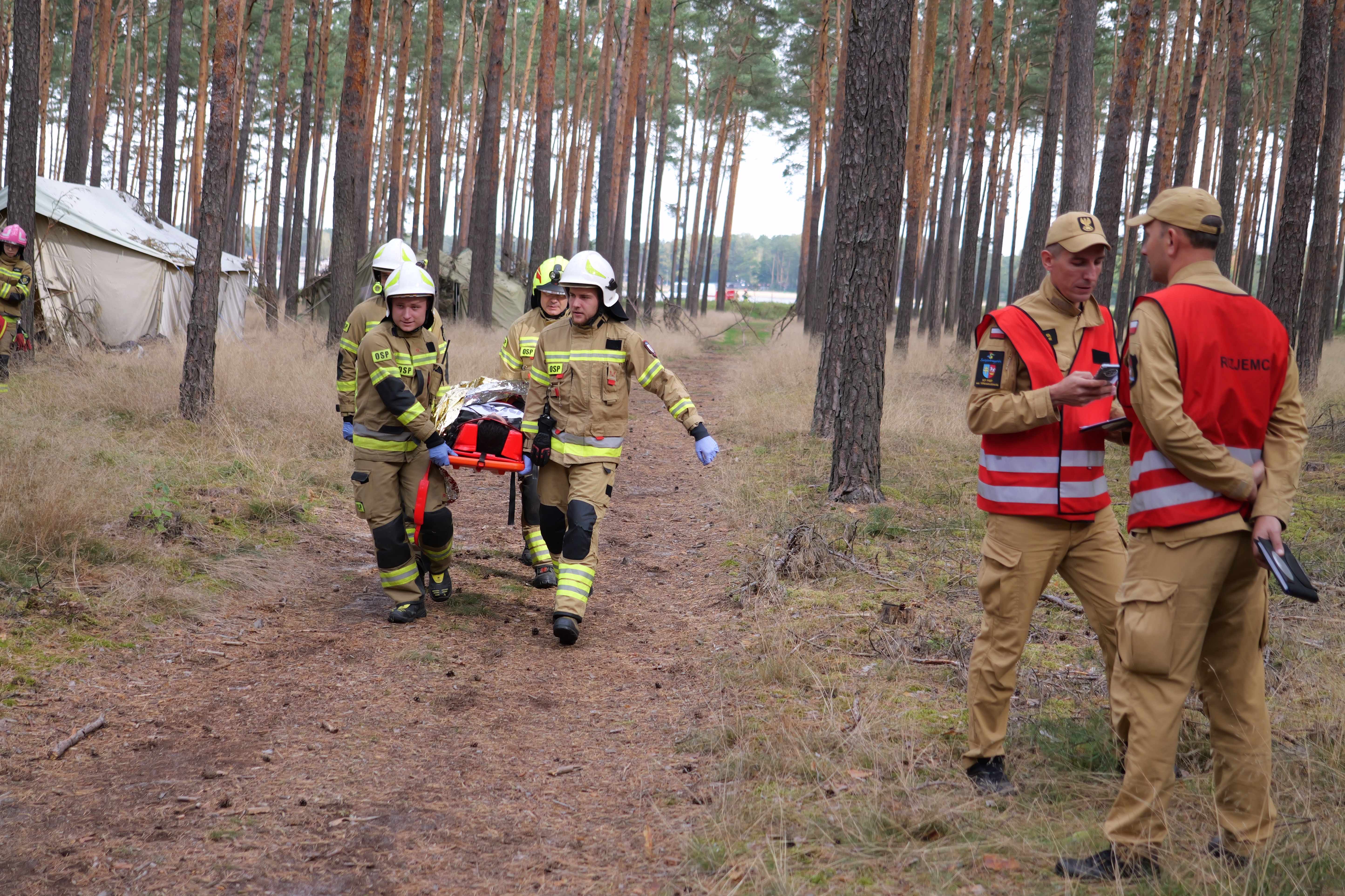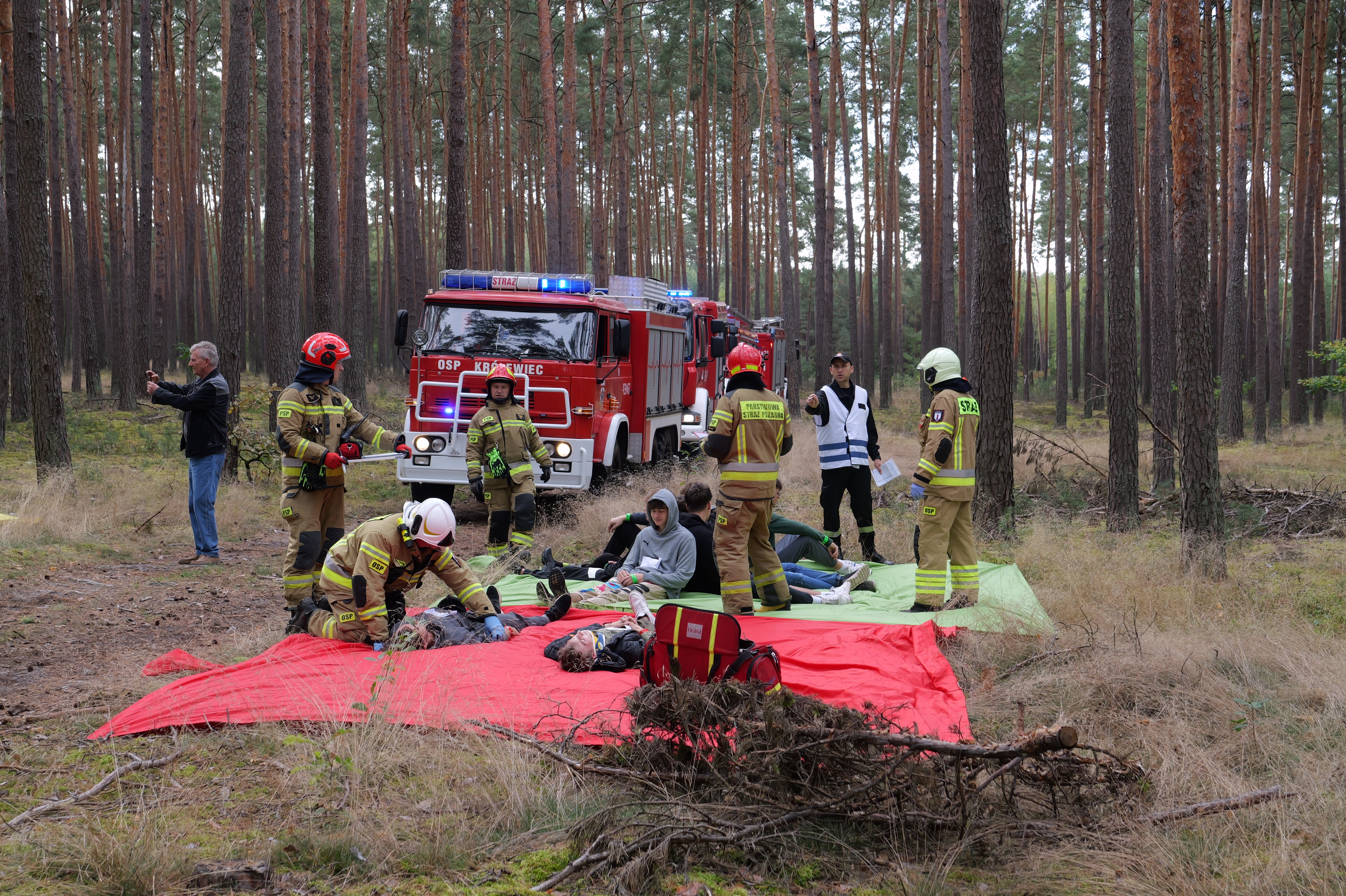 Na skutek załamania pogody grupa harcerzy podejmuje ewakuację z obozu harcerskiego zlokalizowanego w lesie nieopodal południowej części zalewu sielpeckiego. Kilku z nich doznaje obrażeń porwanymi przez wiatr luźnymi elementami wyposażenia oraz połamanymi konarami drzew. Ponadto rybacy pozostawiają ognisko w pobliżu obozowiska doprowadzając do pożaru lasu stwarzającego zagrożenie dla pozostałych w obozowisku rówieśników. Takie założenie realizowane było przez 2 zastępy z Jednostki Ratowniczo - Gaśniczej w Końskich i 5 zastępów Ochotniczych Straży Pożarnych. Strażacy musieli dokonać właściwej segregacji rannych w zależności od stopnia obrażeń. W tym samym czasie należało opanować pożar poszycia leśnego, który powstał od niezgaszonego ogniska.