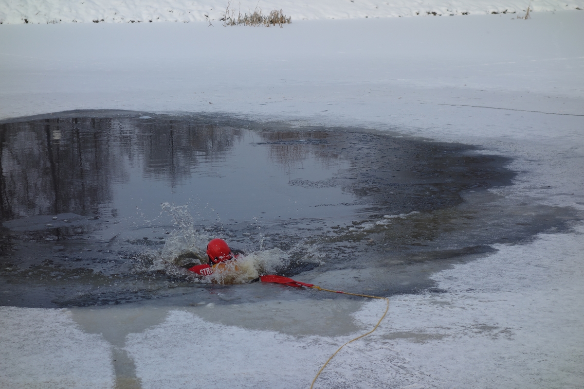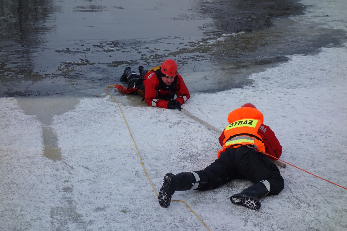 Dzięki uprzejmości władz miasta i gminy Końskie, strażacy ze wszystkich zmian służbowych Jednostki Ratowniczo - Gaśniczej w Końskich, ćwiczyli na zbiorniku wodnym wyciąganie osoby pod którą załamał się lód. Założenie wymagało znalezienie cienkiego lodu, który załamuje się pod ciężarem człowieka. Jeden ze strażaków, odpowiednio zabezpieczony, wpadał do wody a pozostali musieli uratować go za pomocą trzech różnych metod - podręcznych przedmiotów (szalik, gałąź, bosak), drabina nasadkowej i sprzętu specjalistycznego czyli sań lodowych.