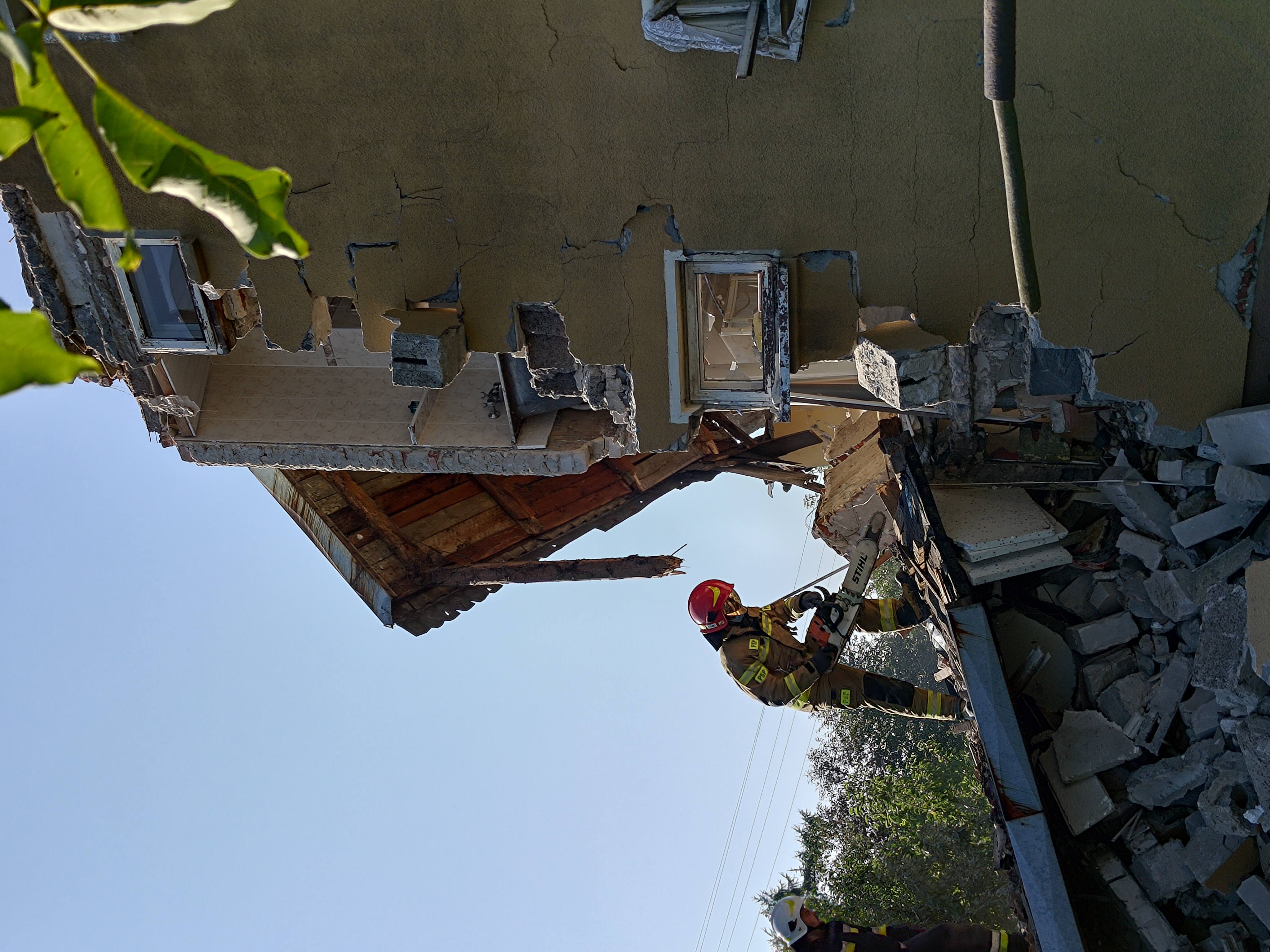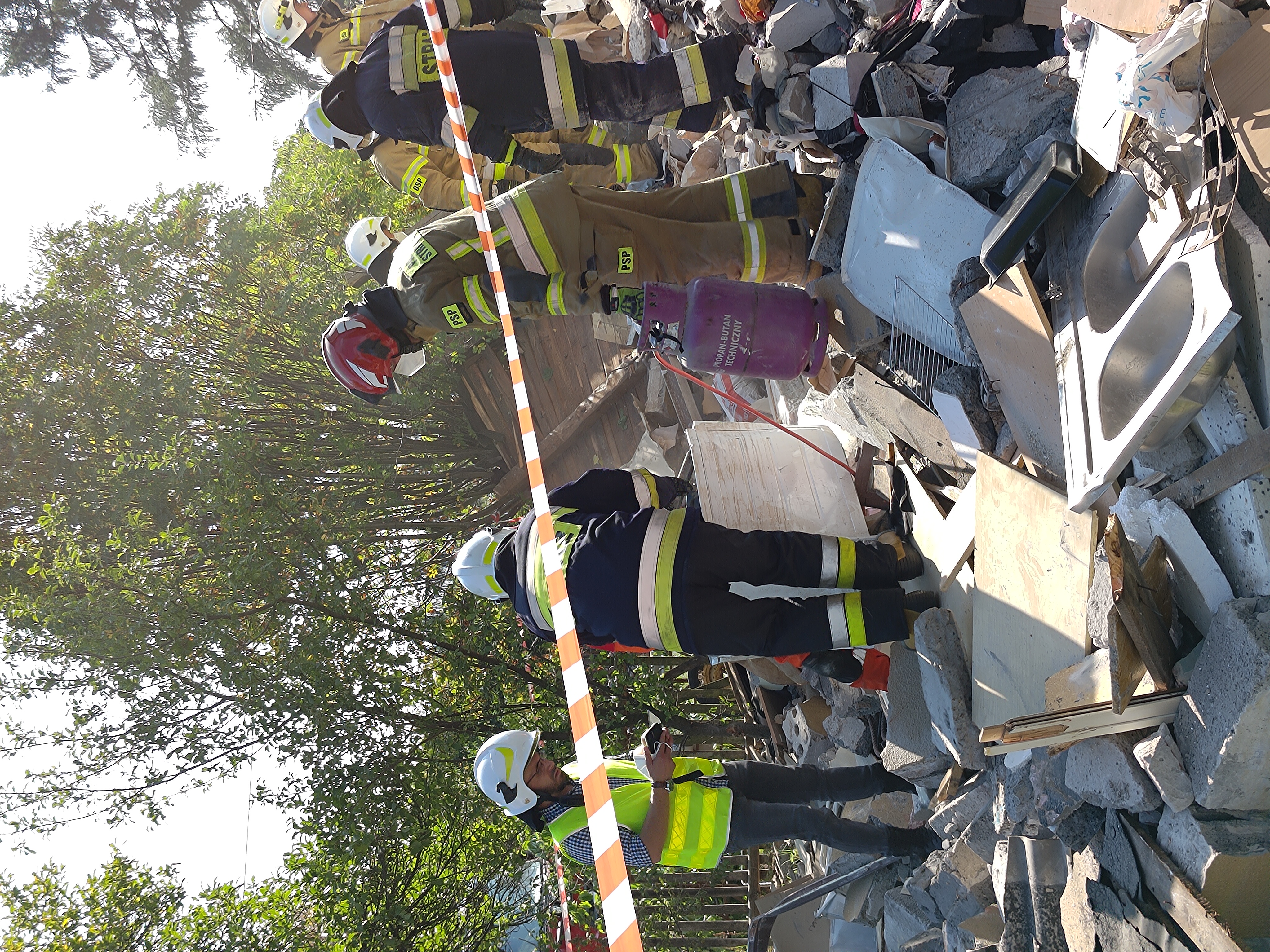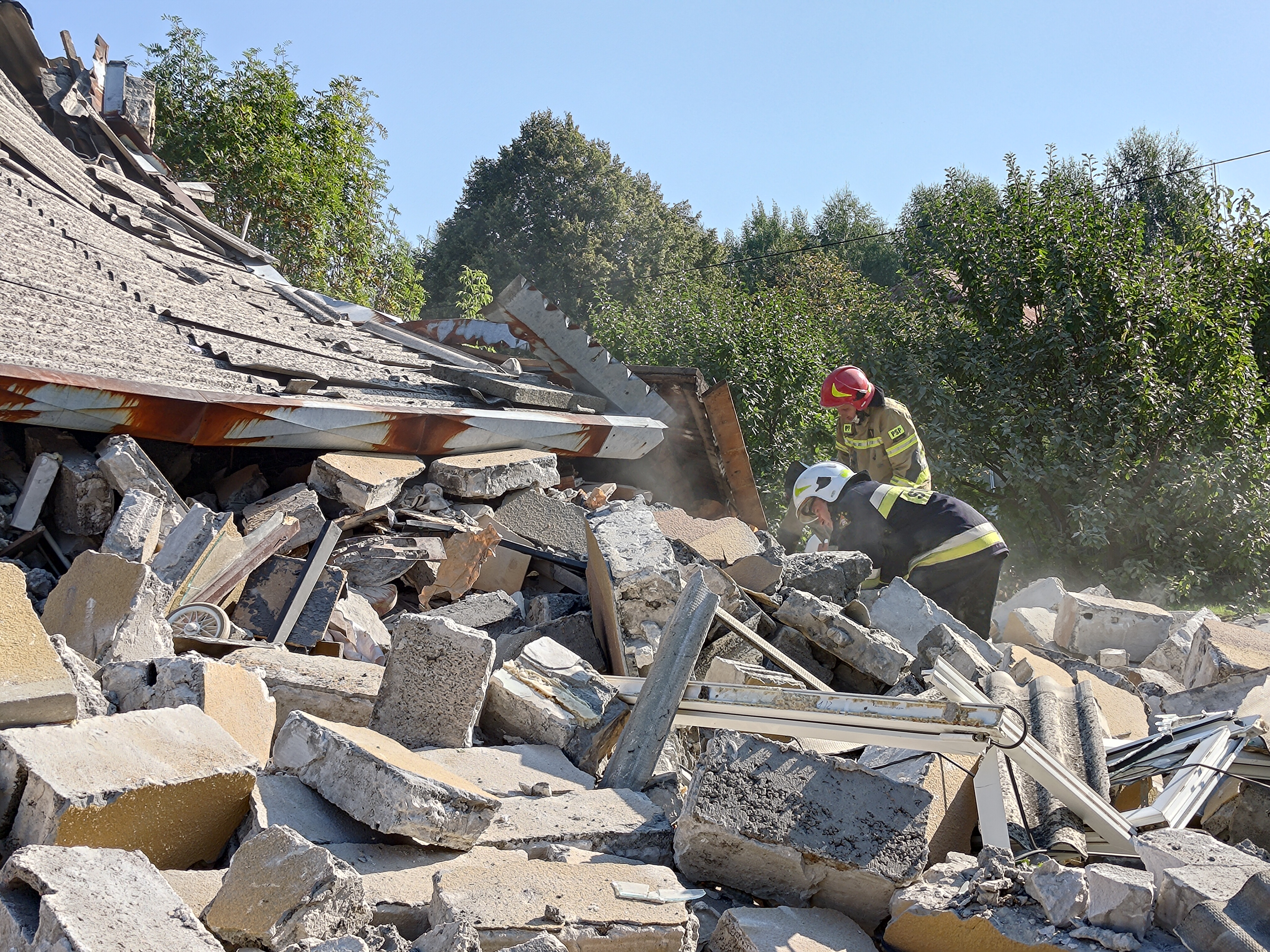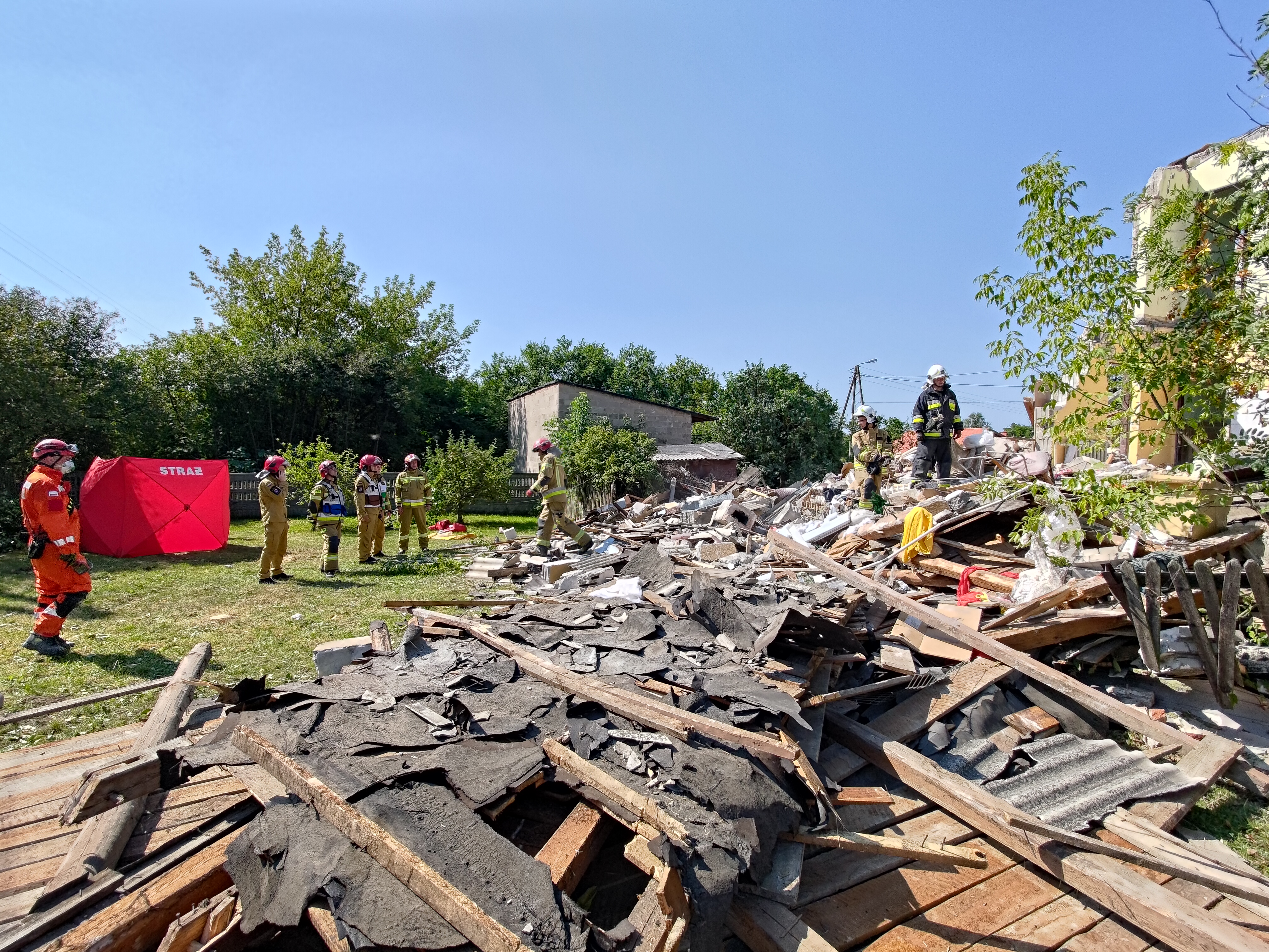 22 sierpnia br. około godz. 8:00 w Rogowie przy ulicy Granicznej gmina Końskie doszło do eksplozji w jednym z budynków jednorodzinnych. Po dojeździe pierwszych zastępów jednostek ochrony przeciwpożarowej strażacy zastali zawalony w ok. 70% budynek i przystąpili do rozpoznania. Z relacji świadków, sąsiadów i rodziny wynikało, że w momencie wybuchu wewnątrz znajdowała się 82 letnia kobieta. Biorąc pod uwagę okoliczności i czas powstania zdarzenia ratownicy ustalili, gdzie prawdopodobnie może znajdować się lokatorka i rozpoczęli odgruzowywanie w tym właśnie obszarze. Aby móc bezpiecznie działać usunęli luźne elementy konstrukcji oraz resztki dachu i ręcznie odkopywali pomieszczenie, które chwilę wcześniej było kuchnią. Przed godziną 10 wspólnie ze Specjalistyczną Grupą Poszukiwawczo-Ratowniczą z Kielc udało się ustalić w której części gruzowiska znajduje się kobieta. Następnie po wykonaniu dostępu kilka minut później ewakuować i przekazać nieprzytomną 82 latkę pod opiekę zespołu ratownictwa medycznego. Niestety obrażenia jakich doznała kobieta były na tyle poważne, że ratownicy odstąpili od udzielenia pomocy medycznej. Dalsze działania polegały na wprowadzeniu do akcji ciężkiego sprzętu i usuwaniu gruzowiska z zawalonych pomieszczeń, mając na uwadze ewentualną, ale mało prawdopodobną obecność osób trzecich. Na miejsce akcji przybył st. bryg. Marcin Machowski – Zastępca Świętokrzyskiego Komendanta Wojewódzkiego PSP w Kielcach wraz z grupą operacyjną oraz nadbryg. Arkadiusz Przybyła – Zastępca Komendanta Głównego Państwowej Straży Pożarnej. Działania jednostek ochrony przeciwpożarowej trwały do godz. 13:00 i prowadzone były przez 10 zastępów, 42 strażaków oraz sprzęt pomocniczy. W działaniach udział brały zastępy z JRG Końskie oraz OSP: Modliszewice, Dziebałtów, Końskie, Czermno, Kozów, Wąsosz. Prawdopodobną przyczyną mogła być wada urządzenia zasilanego paliwem gazowym.