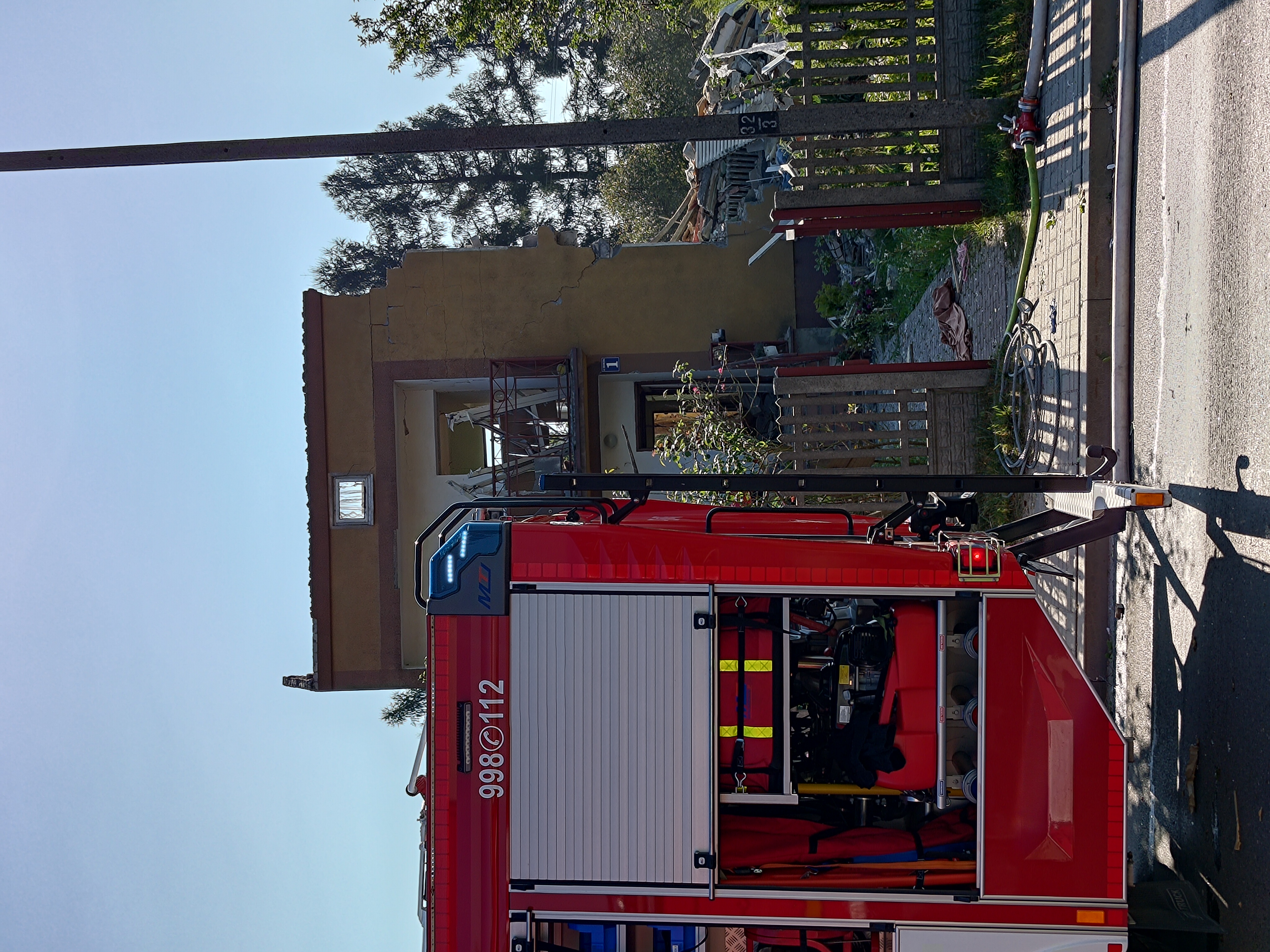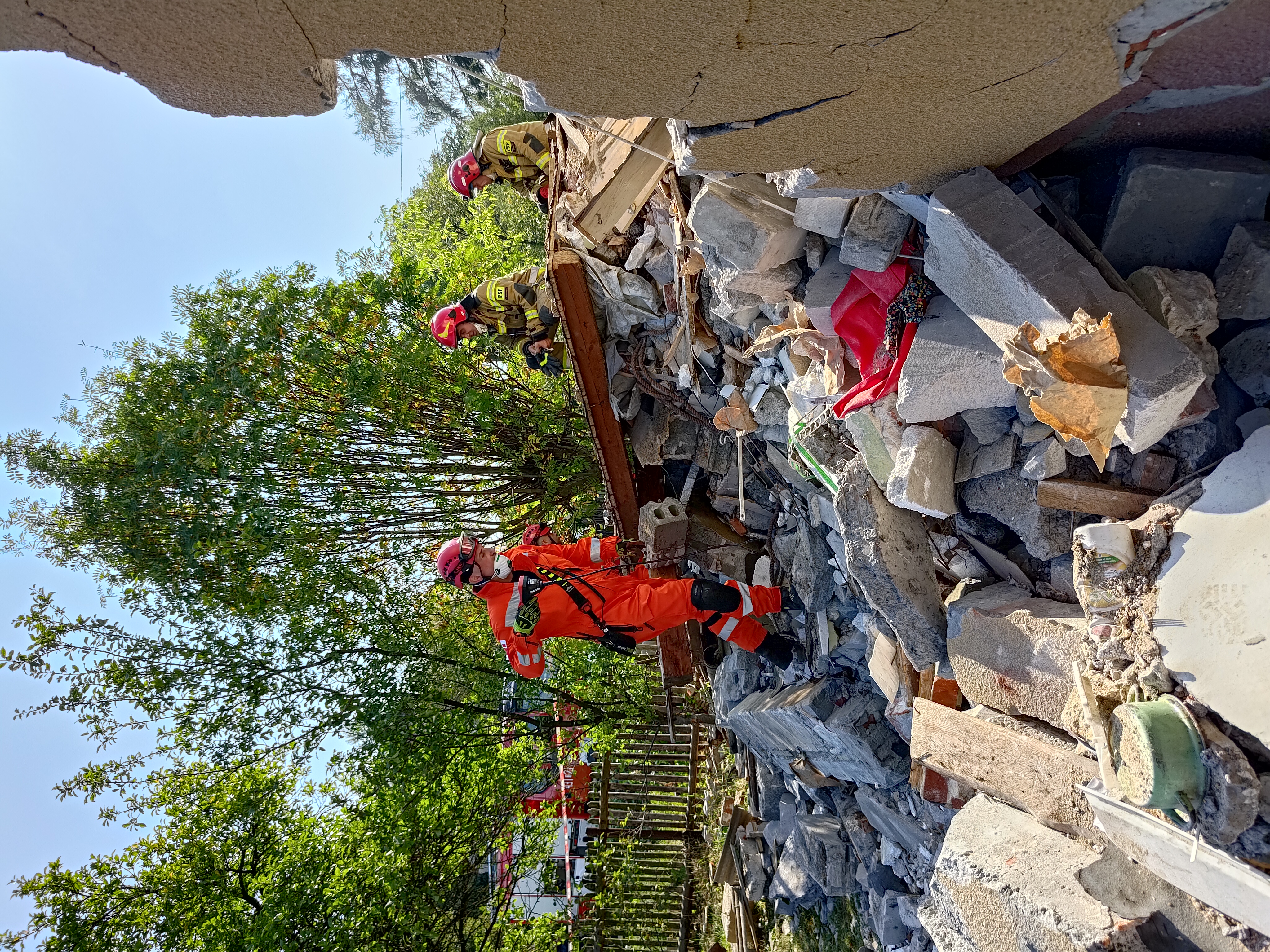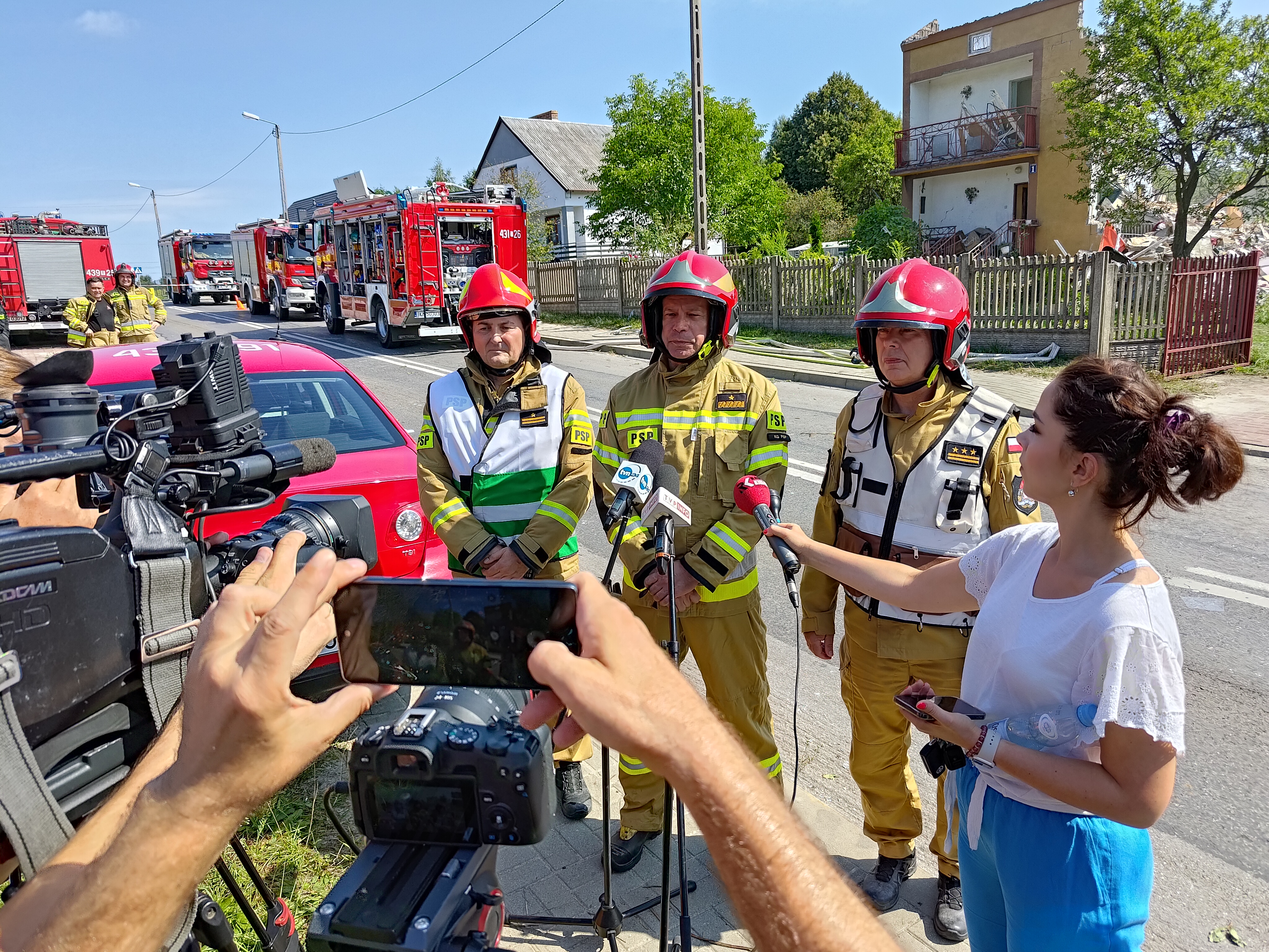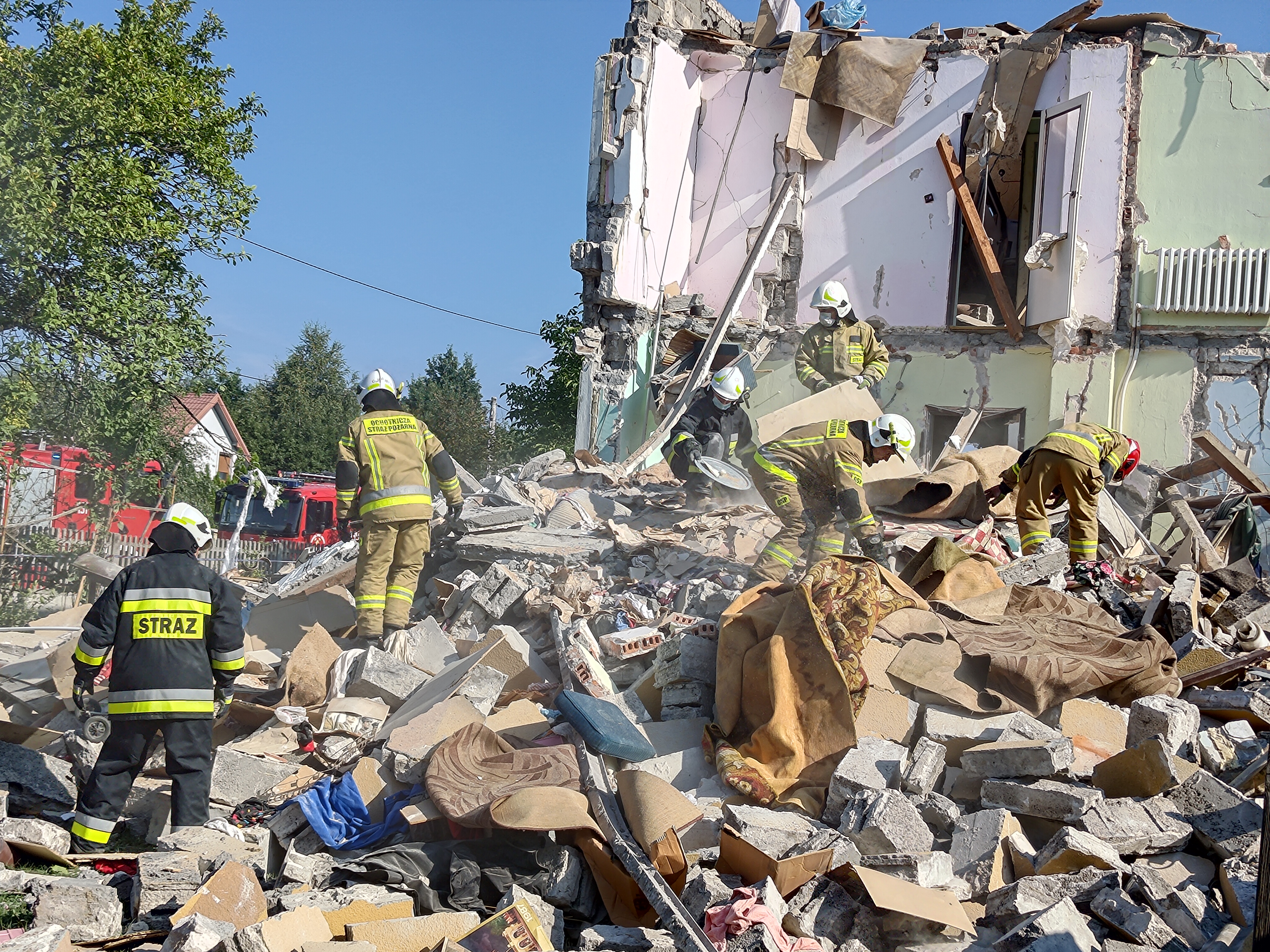 22 sierpnia br. około godz. 8:00 w Rogowie przy ulicy Granicznej gmina Końskie doszło do eksplozji w jednym z budynków jednorodzinnych. Po dojeździe pierwszych zastępów jednostek ochrony przeciwpożarowej strażacy zastali zawalony w ok. 70% budynek i przystąpili do rozpoznania. Z relacji świadków, sąsiadów i rodziny wynikało, że w momencie wybuchu wewnątrz znajdowała się 82 letnia kobieta. Biorąc pod uwagę okoliczności i czas powstania zdarzenia ratownicy ustalili, gdzie prawdopodobnie może znajdować się lokatorka i rozpoczęli odgruzowywanie w tym właśnie obszarze. Aby móc bezpiecznie działać usunęli luźne elementy konstrukcji oraz resztki dachu i ręcznie odkopywali pomieszczenie, które chwilę wcześniej było kuchnią. Przed godziną 10 wspólnie ze Specjalistyczną Grupą Poszukiwawczo-Ratowniczą z Kielc udało się ustalić w której części gruzowiska znajduje się kobieta. Następnie po wykonaniu dostępu kilka minut później ewakuować i przekazać nieprzytomną 82 latkę pod opiekę zespołu ratownictwa medycznego. Niestety obrażenia jakich doznała kobieta były na tyle poważne, że ratownicy odstąpili od udzielenia pomocy medycznej. Dalsze działania polegały na wprowadzeniu do akcji ciężkiego sprzętu i usuwaniu gruzowiska z zawalonych pomieszczeń, mając na uwadze ewentualną, ale mało prawdopodobną obecność osób trzecich. Na miejsce akcji przybył st. bryg. Marcin Machowski – Zastępca Świętokrzyskiego Komendanta Wojewódzkiego PSP w Kielcach wraz z grupą operacyjną oraz nadbryg. Arkadiusz Przybyła – Zastępca Komendanta Głównego Państwowej Straży Pożarnej. Działania jednostek ochrony przeciwpożarowej trwały do godz. 13:00 i prowadzone były przez 10 zastępów, 42 strażaków oraz sprzęt pomocniczy. W działaniach udział brały zastępy z JRG Końskie oraz OSP: Modliszewice, Dziebałtów, Końskie, Czermno, Kozów, Wąsosz. Prawdopodobną przyczyną mogła być wada urządzenia zasilanego paliwem gazowym.