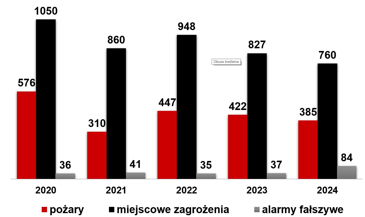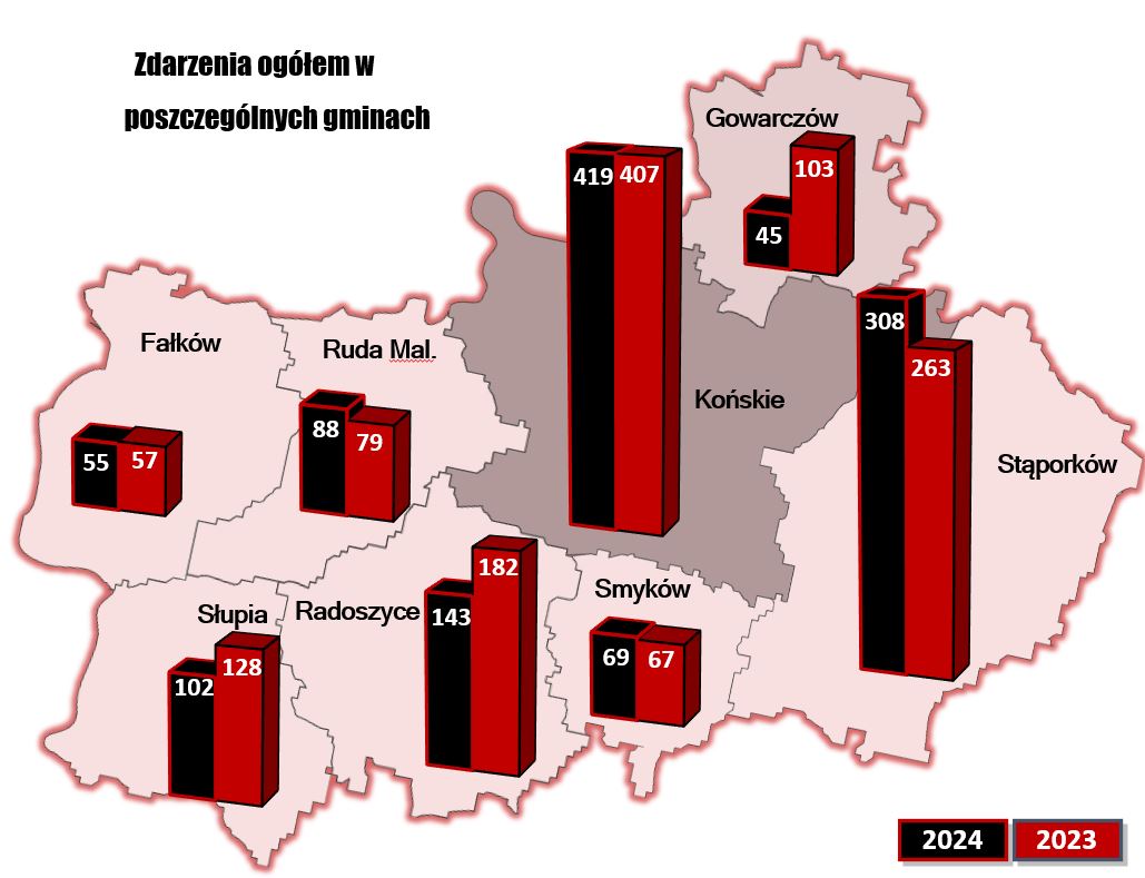 Ogólna liczba zdarzeń zmniejszyła się o ponad 4% i wyniosła 1229 w porównaniu do 1286 w roku 2023. Liczba pożarów spadła z 422 do 385, oraz innych zdarzeń tzw. miejscowych zagrożeń z 827 do 760. Znacznie wzrosła natomiast liczba alarmów fałszywych z 37 do 84. Związane jest to z czujnikami tlenku węgla, które alarmują o wyczerpanej baterii lub wykrywają niewielką ilość tlenku węgla, niepotwierdzaną następnie przez nasze urządzenia na skutek przewietrzenia pomieszczeń. Najwięcej zdarzeń jak co roku powstało na terenie miasta i gminy Końskie - 419 a najmniej zanotowaliśmy w ubiegłym roku na terenie gminy Gowarczów - 45.