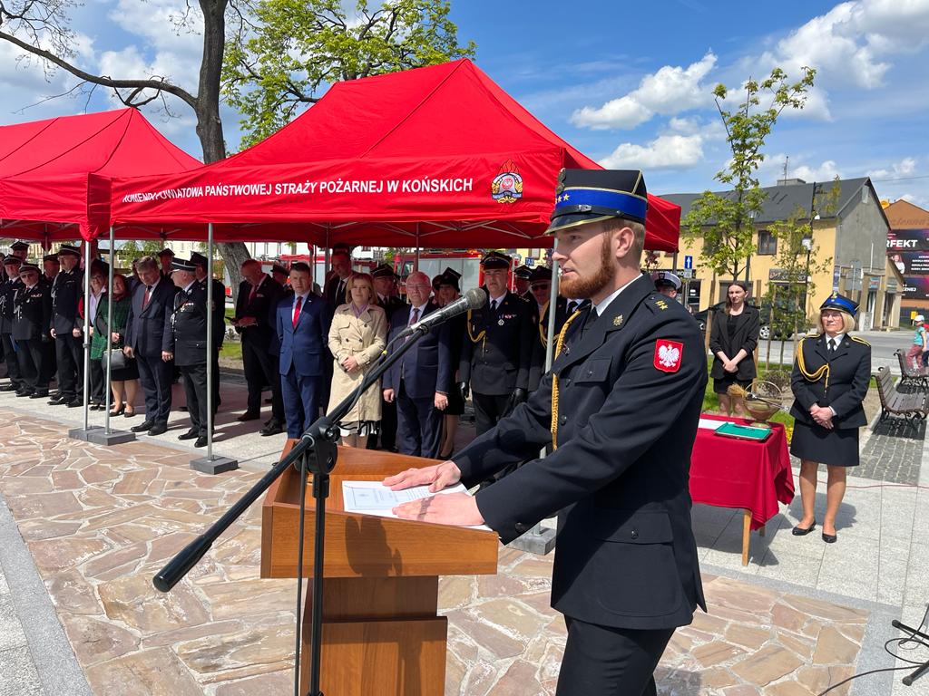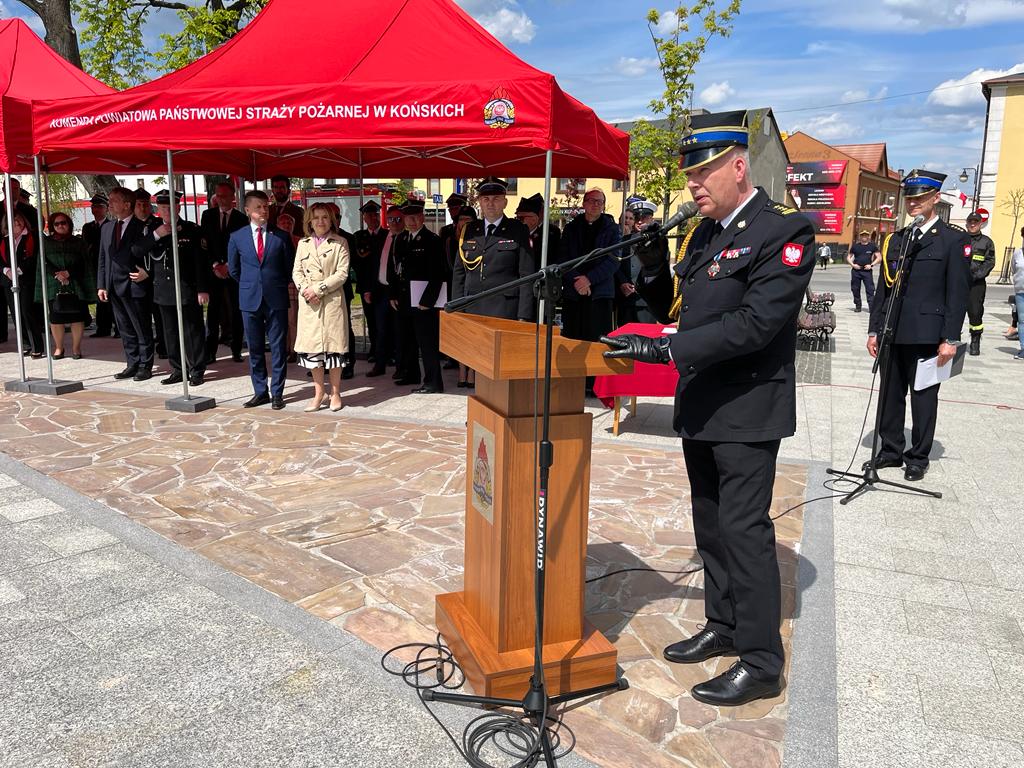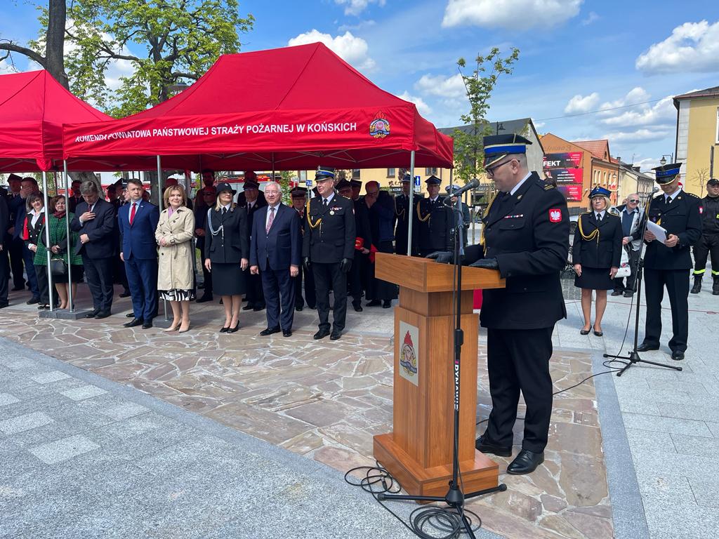 5 maja koneccy strażacy o godz. 11:00 rozpoczęli swoją uroczystość w Kolegiacie św. Mikołaja w Końskich mszą świętą, którą odprawił kapelan koneckich strażaków ks. Tomasz Janicki w asyście dziekana ks. Jacka Wieczorka. Po mszy pododdziały przemaszerowały na Plac Kościuszki, gdzie odbył się uroczysty apel, który rozpoczął się złożeniem meldunku przez dowódcę uroczystości mł. bryg. Michała Krzeszowskiego. Meldunek przyjął zastępca świętokrzyskiego komendanta wojewódzkiego Państwowej Straży Pożarnej st. bryg. Marcin Machowski. Następnie wciągnięta została flaga na maszt i odegrano hymn państwowy „Mazurek Dąbrowskiego”. Po hymnie komendant powiatowy PSP w Końskich mł. bryg. Ryszard Stańczak przywitał przybyłych na uroczystość gości. Wśród nich znaleźli się między innymi: sekretarz stanu w Ministerstwie Sportu i Turystyki Anna Krupka, posłowie Krzysztof Lipiec, Bartłomiej Dorywalski, marszałek województwa Andrzej Bętkowski jednocześnie wiceprezes Zarządu Oddziału Wojewódzkiego ZOSP RP, przewodniczący sejmiku województwa Andrzej Pruś, zastępca komendanta wojewódzkiego PSP st. bryg. Marcin Machowski. W wydarzeniu udział wzięli też włodarze powiatowi – starosta Grzegorz Piec, który jest jednocześnie prezesem Zarządu Oddziału Powiatowego ZOPS RP oraz przewodniczący Rady Powiatu Zbigniew Kowalczyk. Obecni byli też włodarze wszystkich gmin z powiatu koneckiego: burmistrzowie Stąporkowa - Dorota Łukomska, Końskich - Krzysztof Obratański i Radoszyc - Michał Pękala, wójtowie Rudy Malenieckiej - Leszek Kuca, Gowarczowa - Stanisław Pacocha, Smykowa - Jarosław Pawelec i Słupi Koneckiej - Robert Wielgopolan oraz zastępca wójta Fałkowa - Krzysztof Bajor.