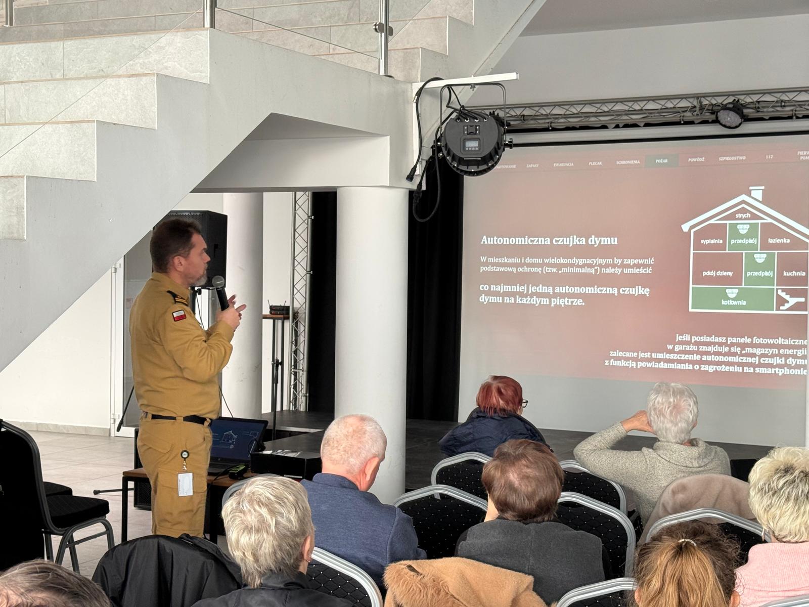 Podczas spotkania poruszono również tematy związane z reagowaniem na sygnały alarmowe, przygotowaniem plecaka ewakuacyjnego, tworzeniem domowych zapasów na minimum 72 godziny oraz zabezpieczeniem mieszkania na wypadek przerw w dostawach prądu, wody czy gazu. Seniorzy otrzymali praktyczne wskazówki dotyczące montażu czujek dymu i CO, utrzymania drożności wentylacji oraz bezpiecznego użytkowania urządzeń grzewczych.