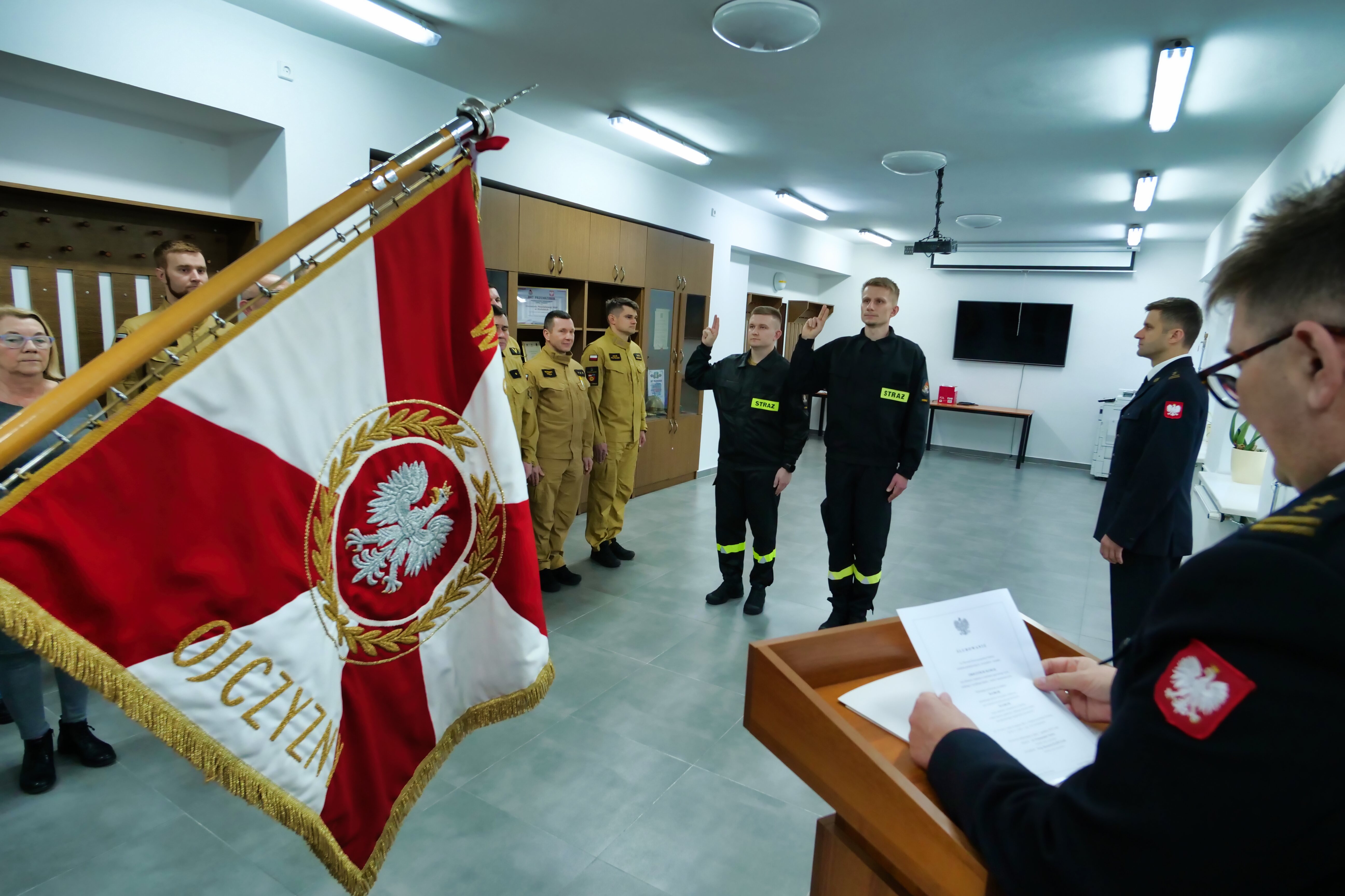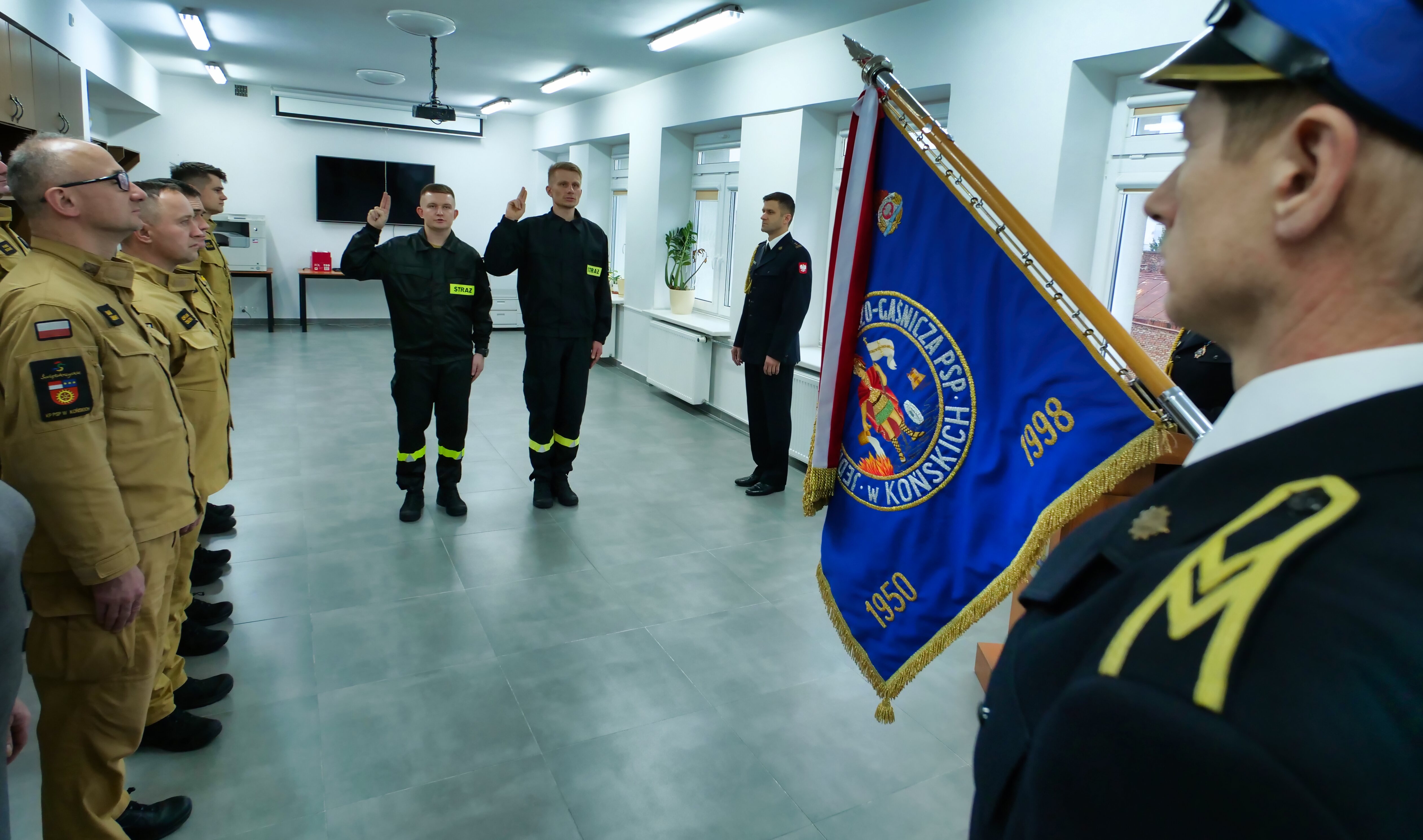 Wypowiadając słowa roty, str. Przemysław Tarka i str. Jakub Jakubowski zobowiązali się być ofiarnymi i mężnymi w ratowaniu zagrożonego życia ludzkiego i wszelkiego mienia – nawet z narażeniem życia. Przyjęcie nowych funkcjonariuszy to ważne wzmocnienie potencjału osobowego Jednostki Ratowniczo-Gaśniczej w Końskich.