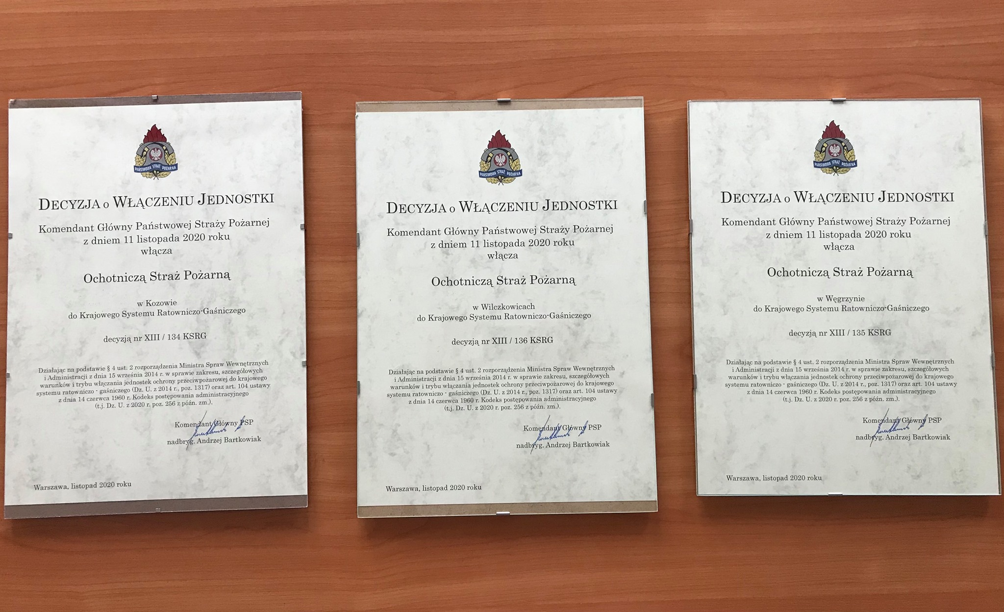 Potwierdzające Decyzje podpisane przez nadbryg. Andrzeja Bartkowiaka — Komendanta Głównego PSP wręczył mł. bryg. Ryszard Stańczak— Komendant Powiatowy PSP w Końskich. Dokument ten otrzymali reprezentanci jednostek: dh Sylwester Król — Prezes OSP Wilczkowice, dh Mariusz Kos — Prezes OSP Kozów, dh Dariusz Mularczyk — Naczelnik OSP Węgrzyn.