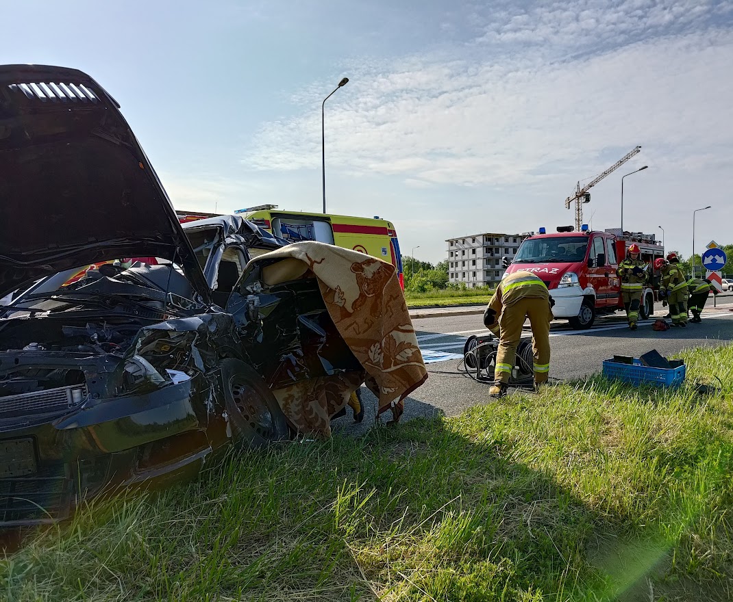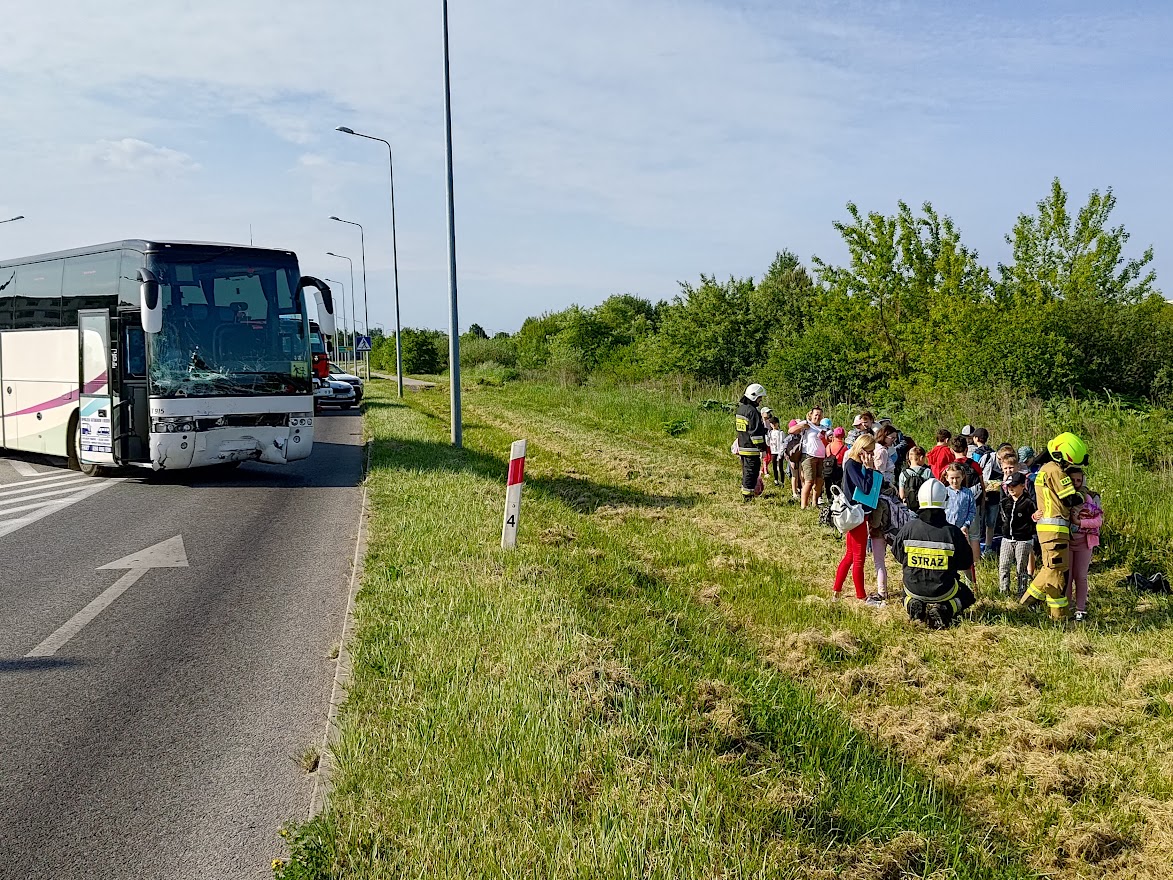 Tuż przed godz 8:00, 30 maja br. na drodze wojewódzkiej 728 przy skrzyżowaniu z ul. Staszica w Końskich doszło do zderzenia autobusu turystycznego z osobową Skodą. W autobusie podróżowało 29 dzieci w wieku 9 lat oraz 4 opiekunów i kierowca. Natomiast w Skodzie 5 młodych osób. Po dojeździe pierwszych zastępów z Jednostki Ratowniczo - Gaśniczej z Końskich strażacy zabezpieczyli miejsce zdarzenia i przystąpili do uwalniania kierującej samochodem osobowym i pasażera. Po wykonaniu dostępu 18 latka i 17 latek zostali przekazani zespołom ratownictwa medycznego. Trzecia lekko ranna osoba ze Skody także została zaopatrzona przez strażaków i oczekiwała na kolejny zespół medyków. Dwie kolejne osoby pod wpływem zdarzenia miały niegroźnie wyglądające otarcia i nie wymagały opieki medycznej. Żadne z dzieci podróżujących autobusem nie odniosło obrażeń. Początkowo przebywały one na poboczu w bezpiecznej odległości od jezdni pod nadzorem strażaków. Po pewnym czasie zostały odprowadzone wraz z opiekunami do pobliskiej szkoły w asyście strażaków i policji. Niewielki wyciek płynów eksploatacyjnych z pojazdu osobowego posypano sorbentem. Działania jednostek ochrony przeciwpożarowej prowadzone były ponad 2 godziny. W tym czasie ruch na tym odcinku drogi zablokowany był w obu kierunkach.