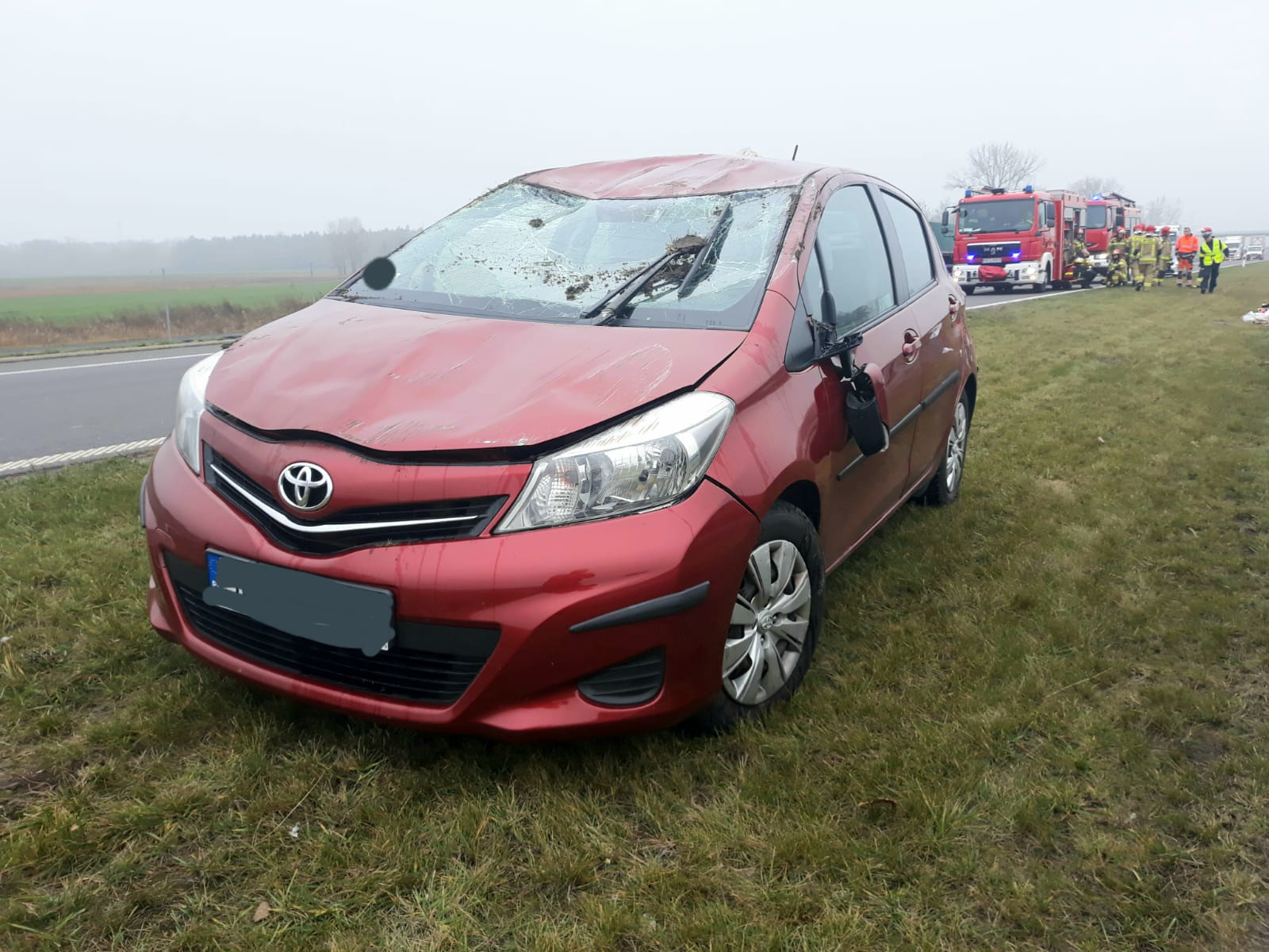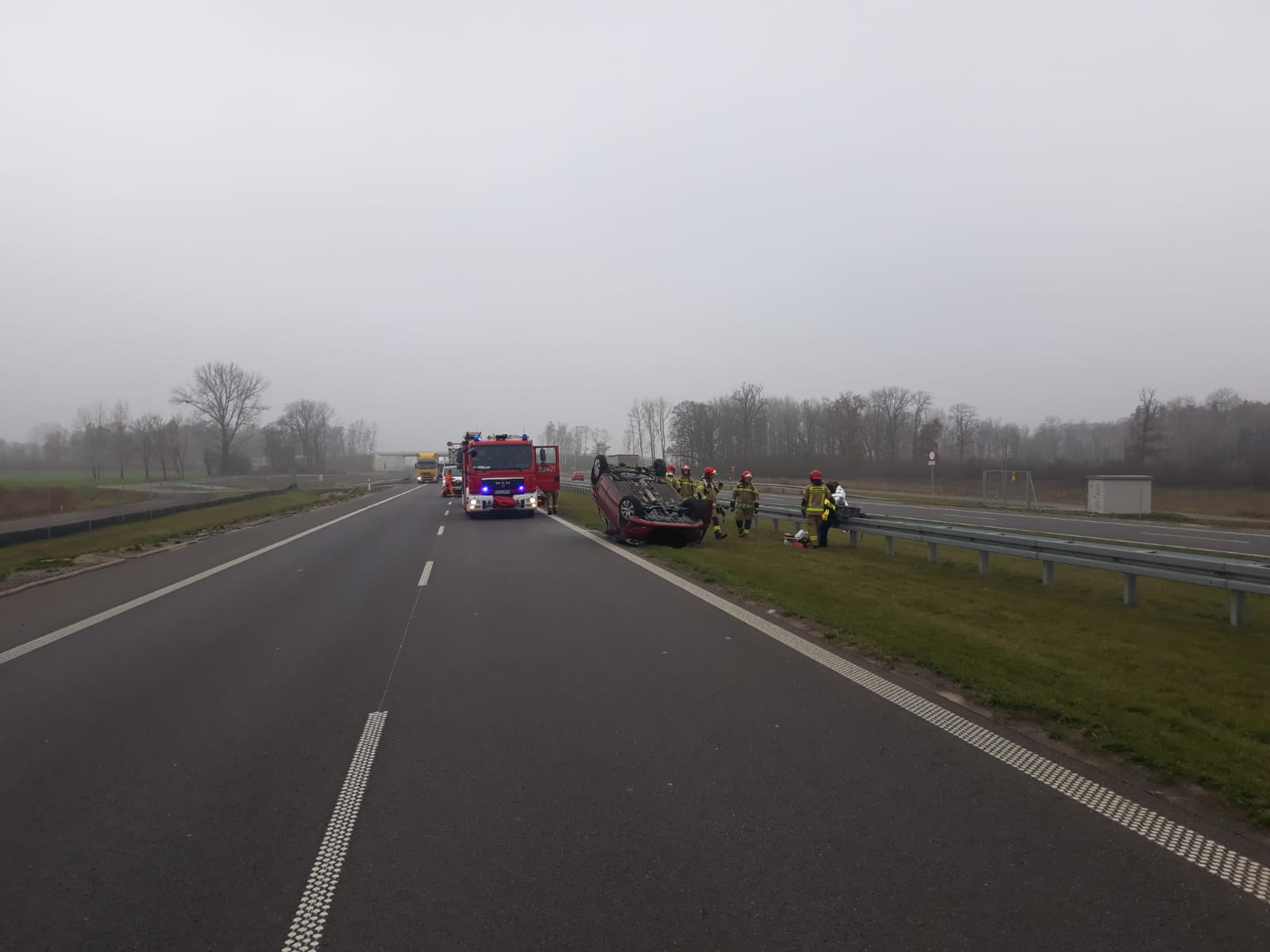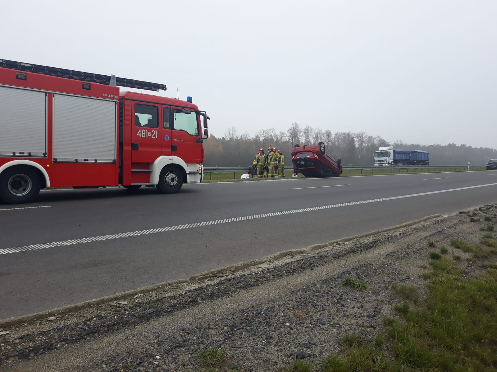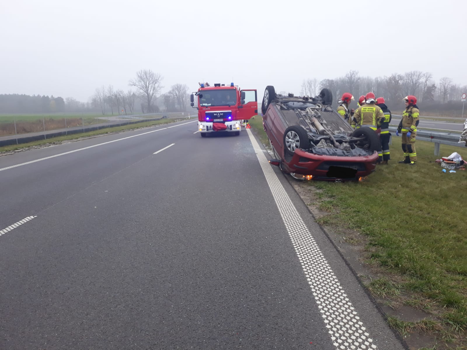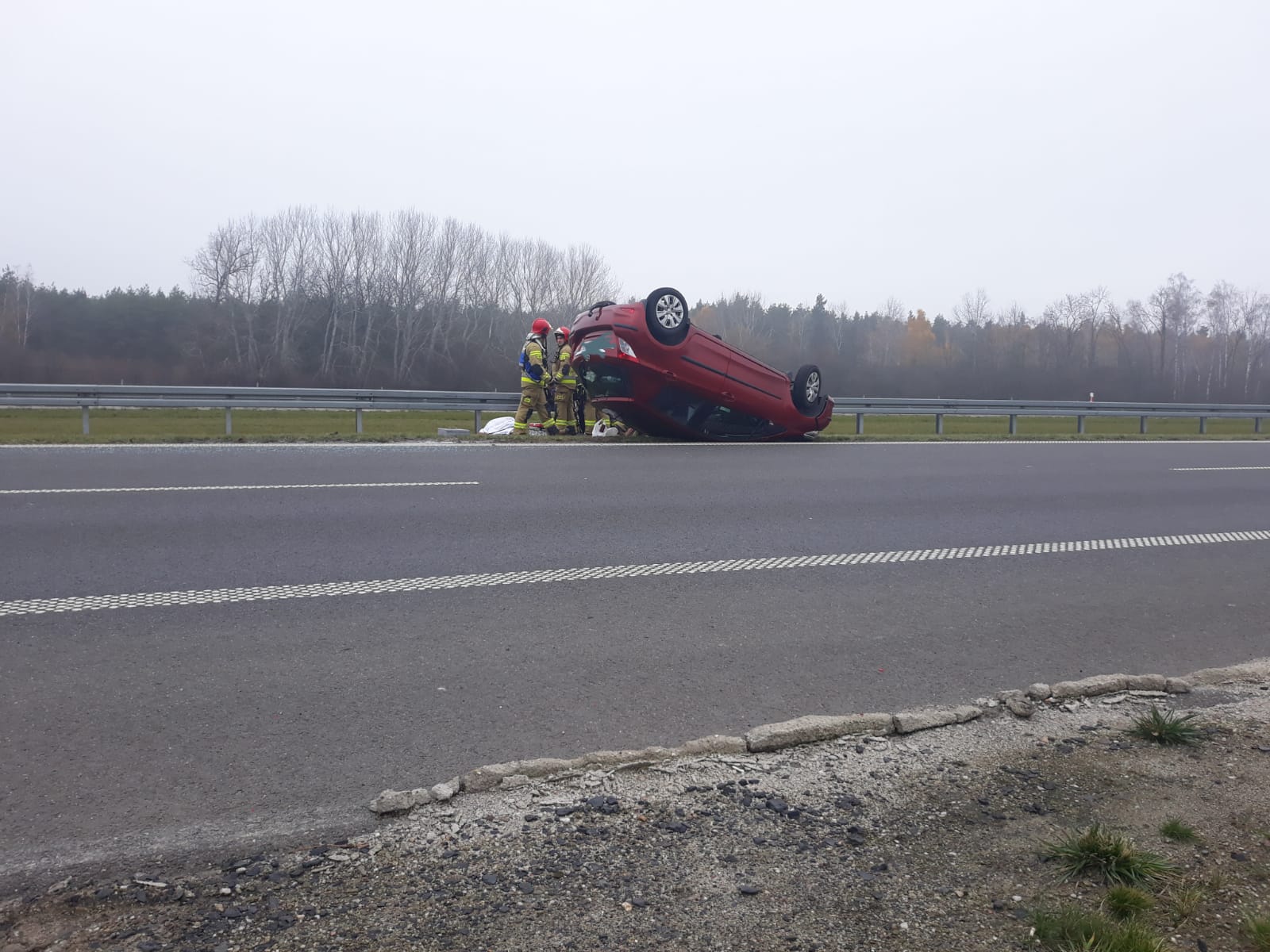 16 listopada br. o godz. 10.30 dyżurny operacyjny powiatu otrzymał informację o zdarzeniu na drodze w kierunku Poznania. Na miejsce zadysponowane zostały trzy zastępy z kościańskiej komendy. Samochód znajdował się na dachu, na pasie rozdzielającym jezdnie. Pojazdem podróżowały dwie osoby, które przed przybyciem służb opuściły auto. Pierwszej pomocy poszkodowanym udzielił przejeżdżający ratownik medyczny. Następnie strażacy wsparli te działania. Przybyły na miejsce Zespół Ratownictwa Medycznego po przebadaniu zdecydował o pozostawieniu na miejscu 75-letniej kobiety i 73-letniego mężczyzny. Policja przeprowadziła czynności dochodzeniowe.
