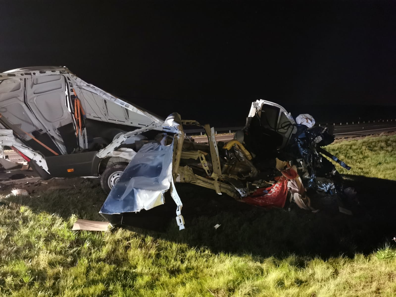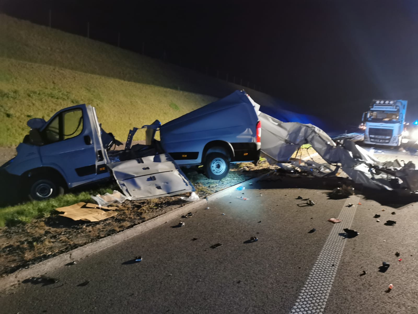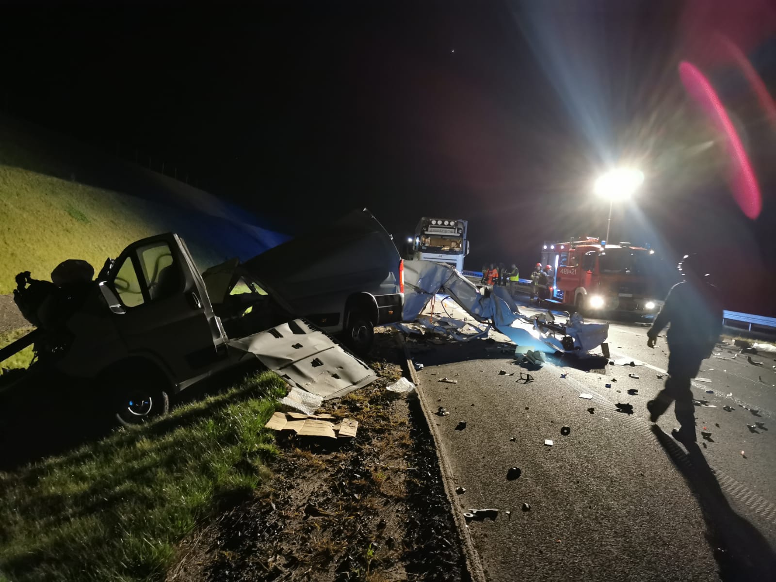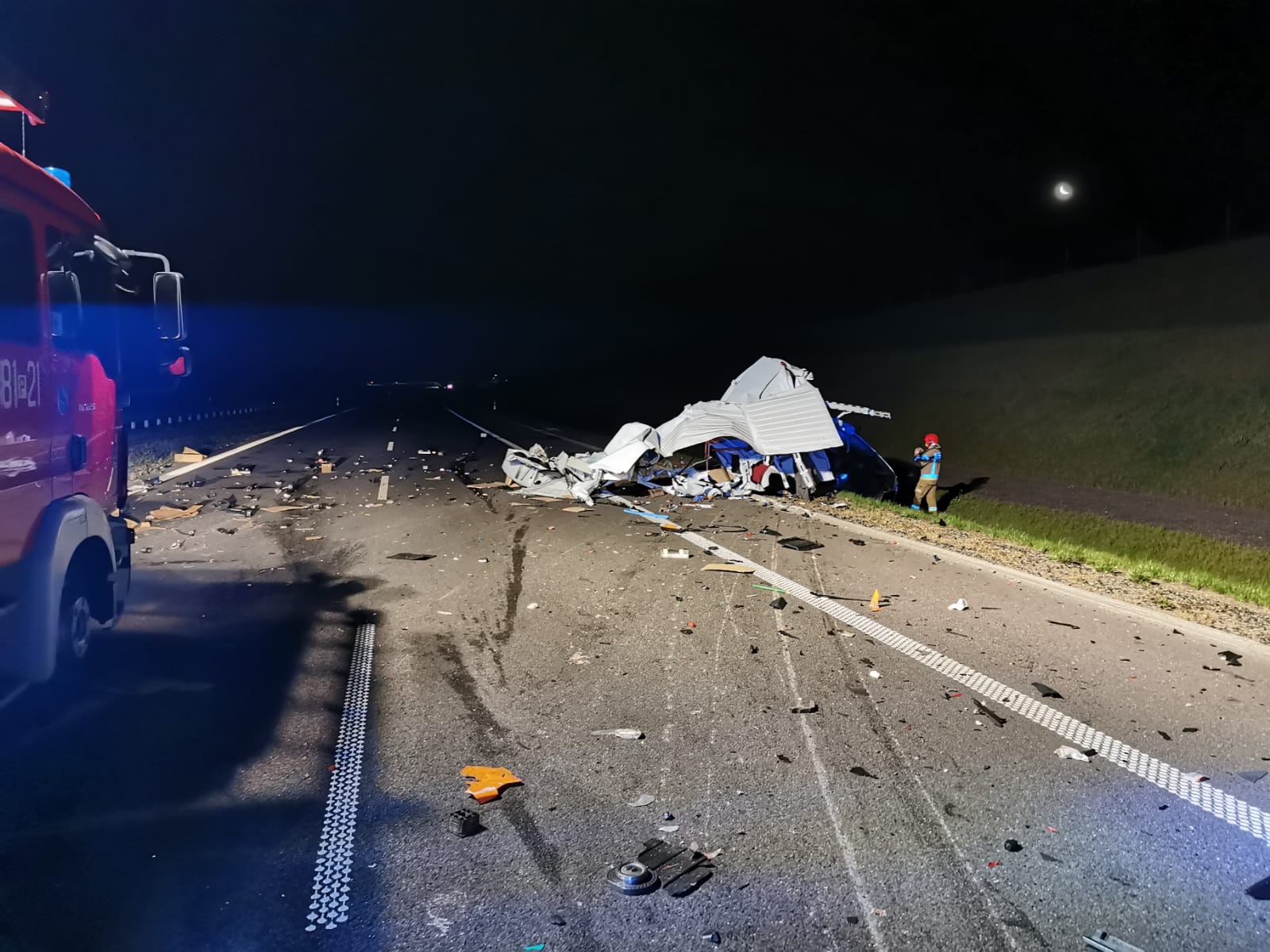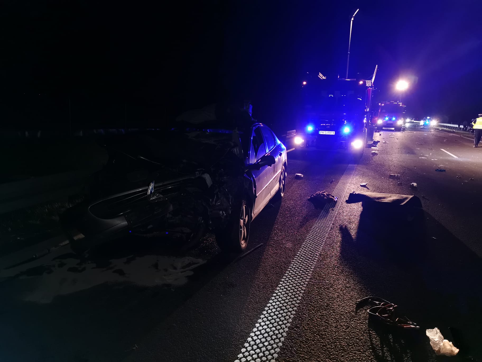 Strażacy wrócili do Komendy i zaledwie po dwóch minutach otrzymali kolejne zgłoszenie. O godz. 1.15 wpłynęła informacja o wypadku busa i samochodu ciężarowego. Do zderzenia doszło kilkaset metrów od wcześniejszego zdarzenia. Ratownicy zabezpieczyli i oświetlili teren akcji. Podróżujący busem wjechał w naczepę samochodu ciężarowego. Pojazd został rozerwany na strzępy, na szczęście jego kierowca odniósł jedynie lekkie obrażenia. Kierowca ciężarówki na nic się nie uskarżał. Strażacy udzielili pomocy poszkodowanemu. Przybyły na miejsce Zespół Ratownictwa Medycznego zdecydował o przewiezieniu kierowcy busa na dalsze badania do kościańskiego szpitala. Po wykonaniu czynności dochodzeniowych przez Policję, strażacy wspólnie z załogą pomocy drogowej usunęli wrak oraz oczyścili jezdnię z pozostałości powypadkowych.