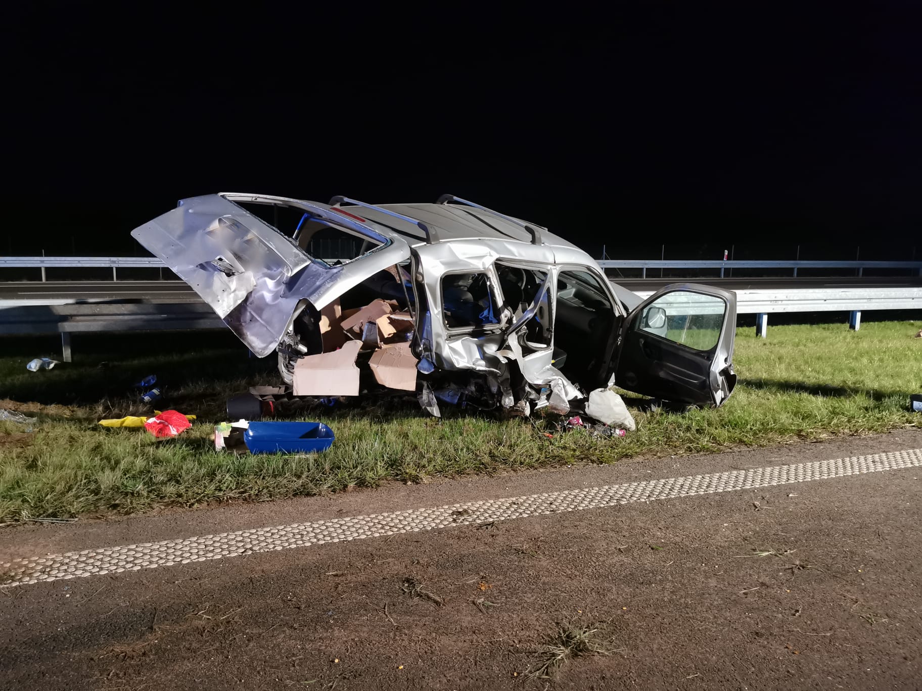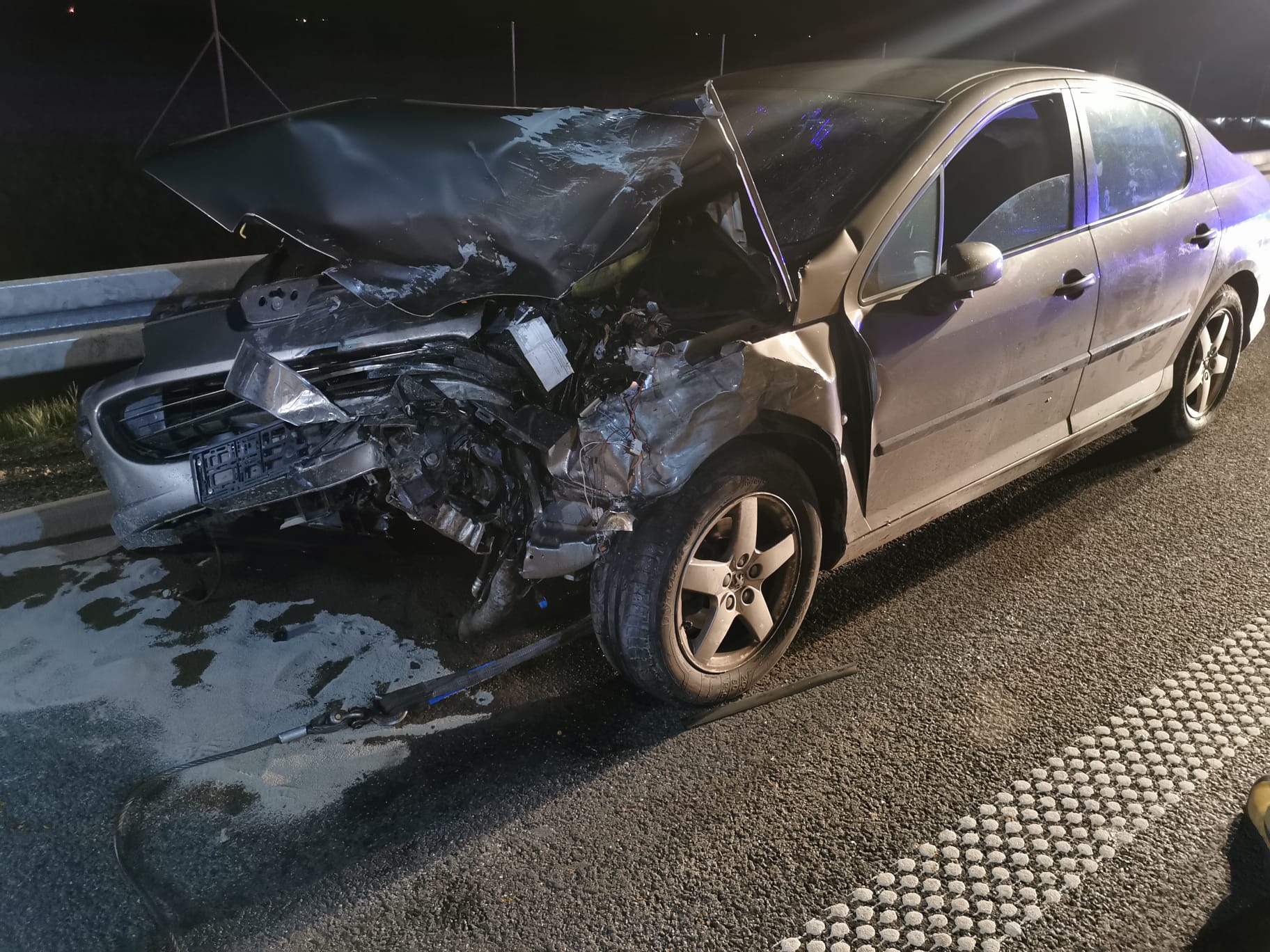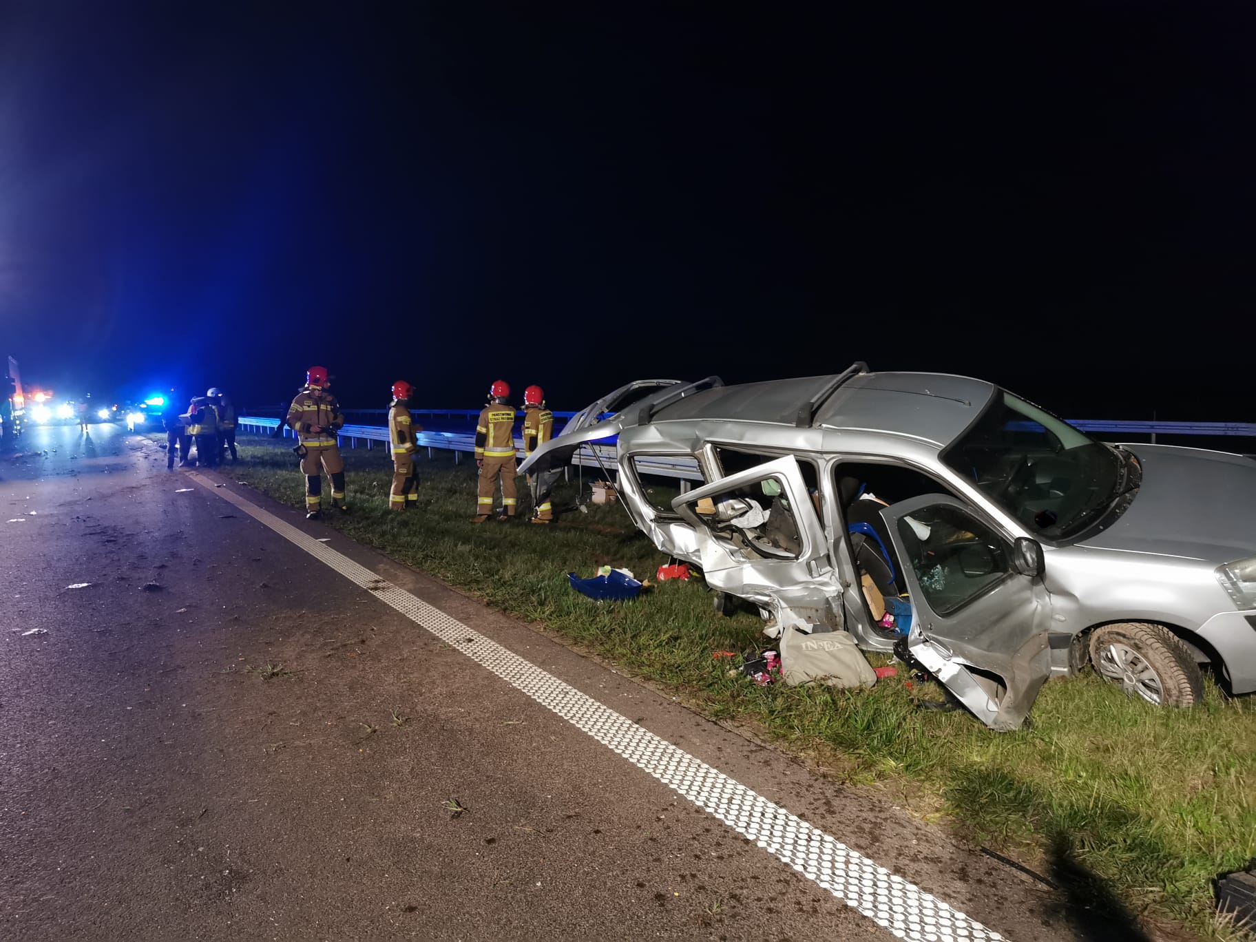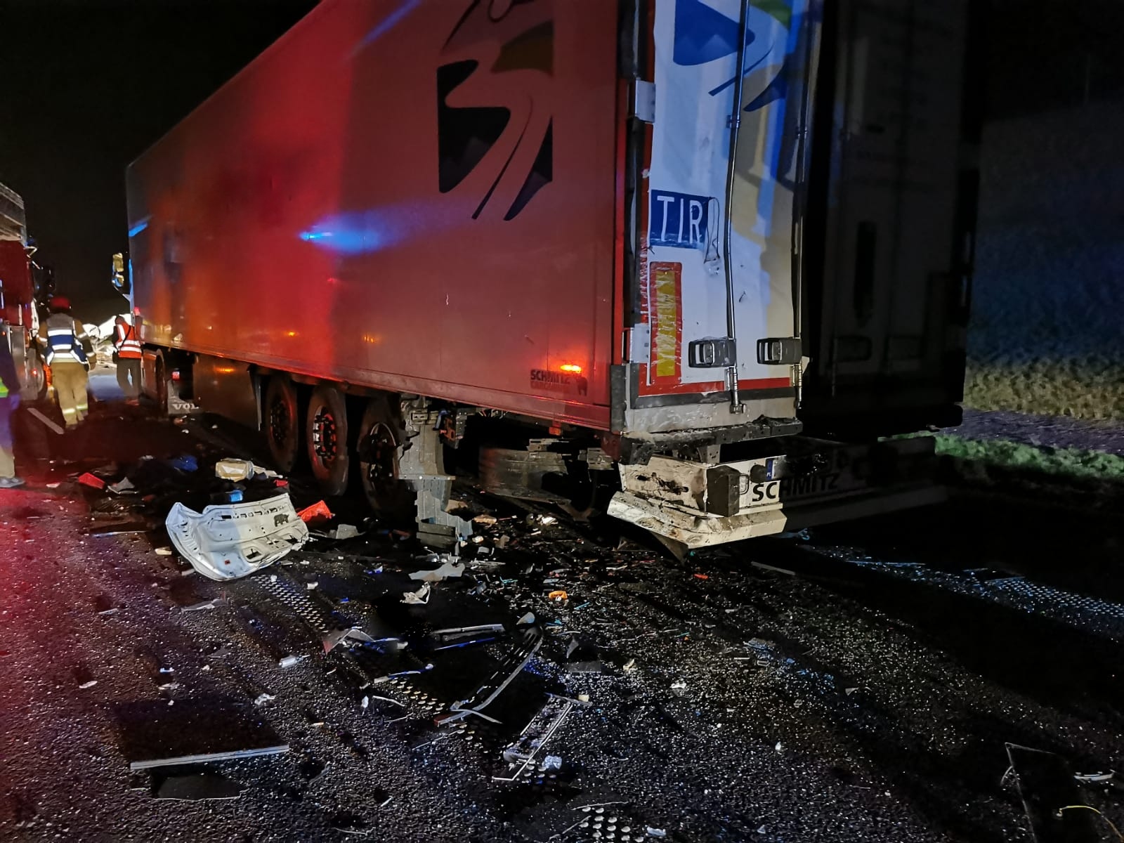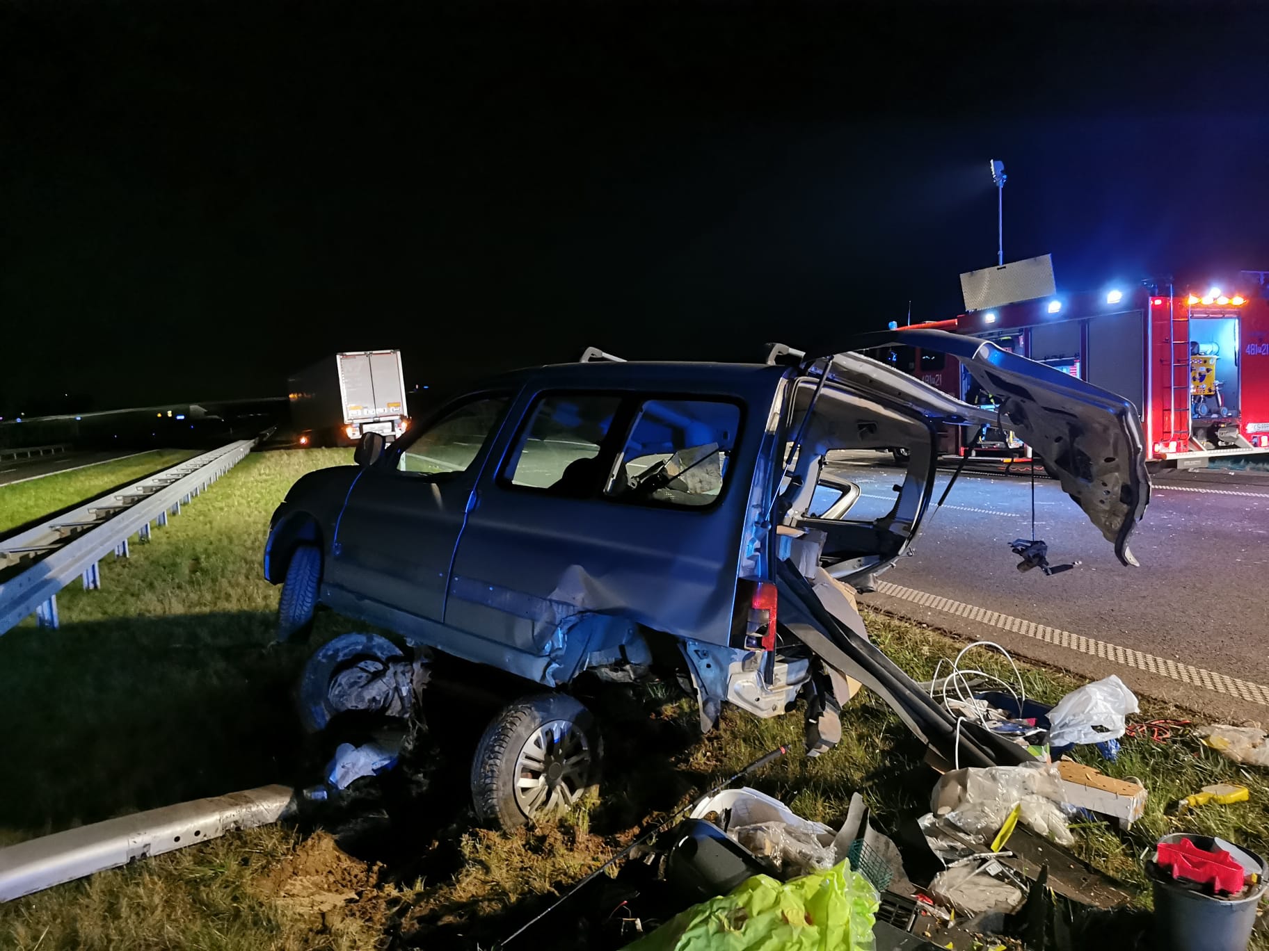 Strażacy wrócili do Komendy i zaledwie po dwóch minutach otrzymali kolejne zgłoszenie. O godz. 1.15 wpłynęła informacja o wypadku busa i samochodu ciężarowego. Do zderzenia doszło kilkaset metrów od wcześniejszego zdarzenia. Ratownicy zabezpieczyli i oświetlili teren akcji. Podróżujący busem wjechał w naczepę samochodu ciężarowego. Pojazd został rozerwany na strzępy, na szczęście jego kierowca odniósł jedynie lekkie obrażenia. Kierowca ciężarówki na nic się nie uskarżał. Strażacy udzielili pomocy poszkodowanemu. Przybyły na miejsce Zespół Ratownictwa Medycznego zdecydował o przewiezieniu kierowcy busa na dalsze badania do kościańskiego szpitala. Po wykonaniu czynności dochodzeniowych przez Policję, strażacy wspólnie z załogą pomocy drogowej usunęli wrak oraz oczyścili jezdnię z pozostałości powypadkowych.