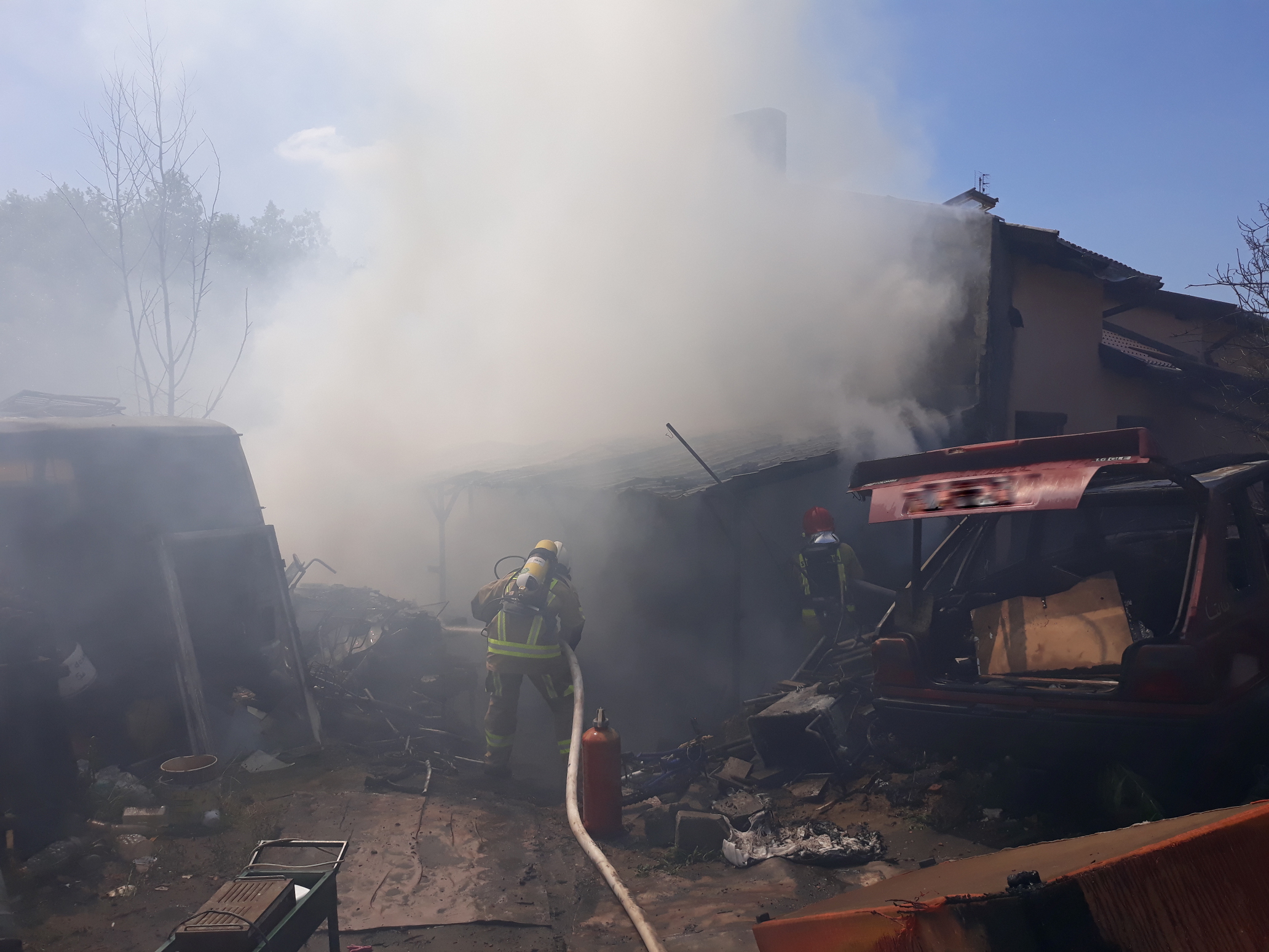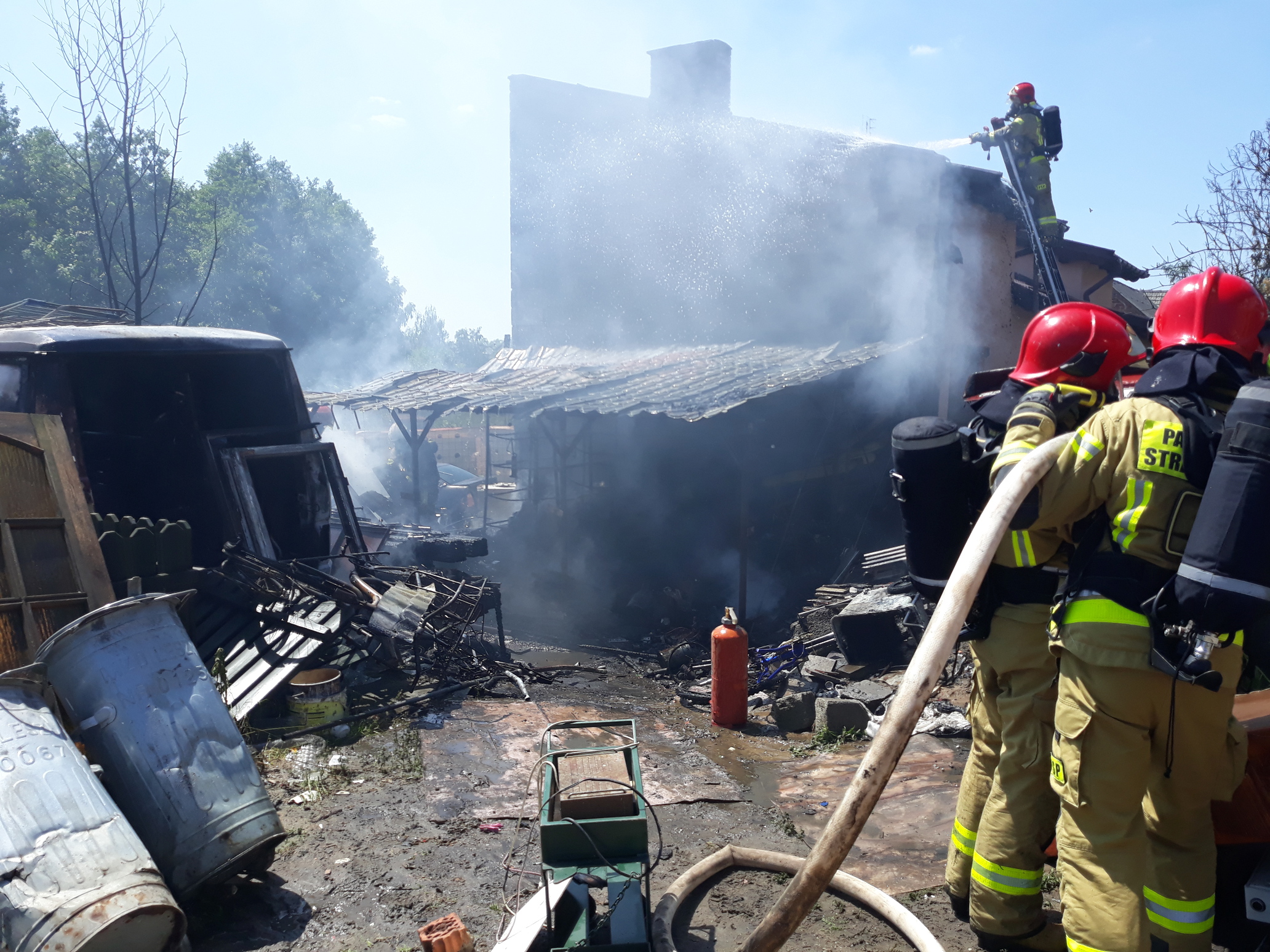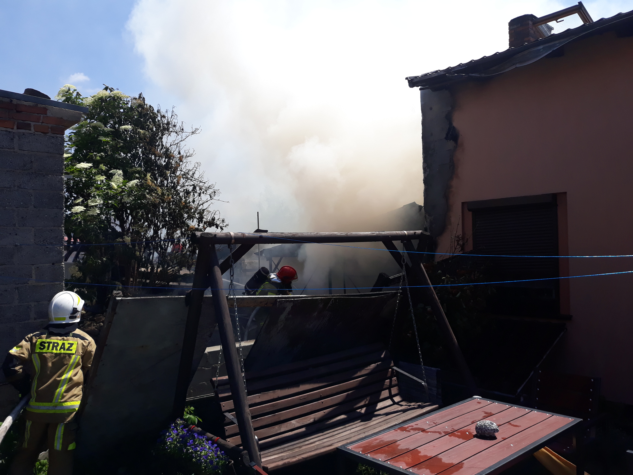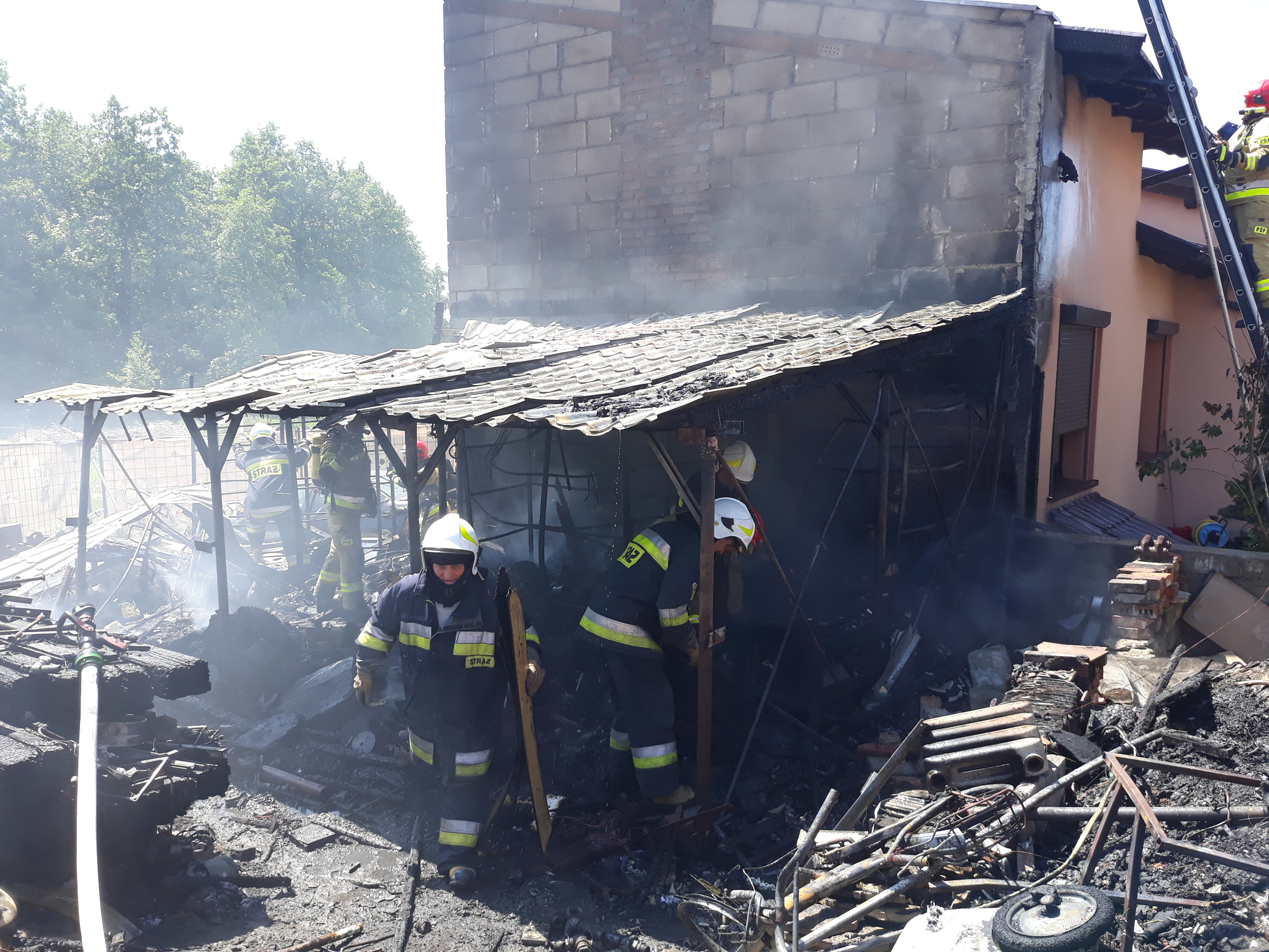 W poniedziałek 14 czerwca br. o godz. 16.01 Stanowisko Kierowania Komendanta Powiatowego PSP w Kościanie otrzymało informację o pożarze domu mieszkalnego. Na miejsce zadysponowane zostały strażackie zastępy. Po przybyciu na miejsce i przeprowadzeniu rozpoznania ustalono, że pali się wiata warsztatowa oraz elewacja wraz z częścią podbitki drewnianej dachu sąsiedniego budynku. W wiacie znajdowało się wyposażenie warsztatu m.in. elektronarzędzia, narzędzia, szafy, regały itp. Obok wiaty stały dwa samochody w całości objęte pożarem. Ratownicy w aparatach ochrony dróg oddechowych podali prądy wody w natarciu na palącą się wiatę oraz budynek. Pierwsze działania strażaków koncertowały się na niedopuszczeniu do rozprzestrzenienia się pożaru na budynek mieszkalny, do którego przylegała wiata. W miarę przybywania sił i środków podano kolejne prądy wody w natarciu oraz w obronie na palące się obiekty. Po stłumieniu ognia pogorzelisko wiaty przegarnięto a następnie zaczęto usuwać nadpalone przedmioty na pobliski ogród. W trakcie działań wycięto część podbitki dachu celem sprawdzenia ewentualnego zagrożenia. Przy użyciu kamery termowizyjnej sprawdzono obiekty na obecność zarzewi ognia, których nie stwierdzono.