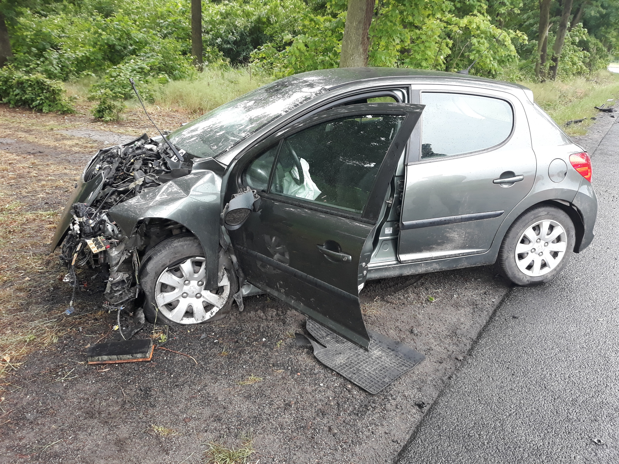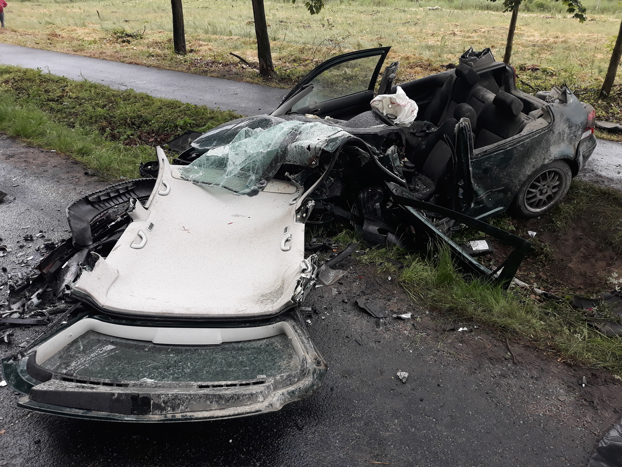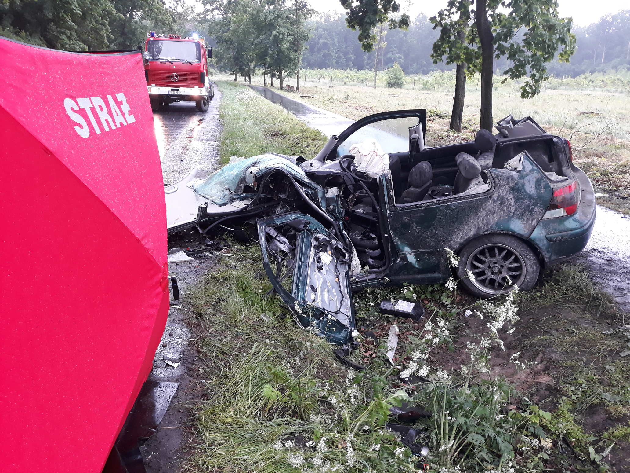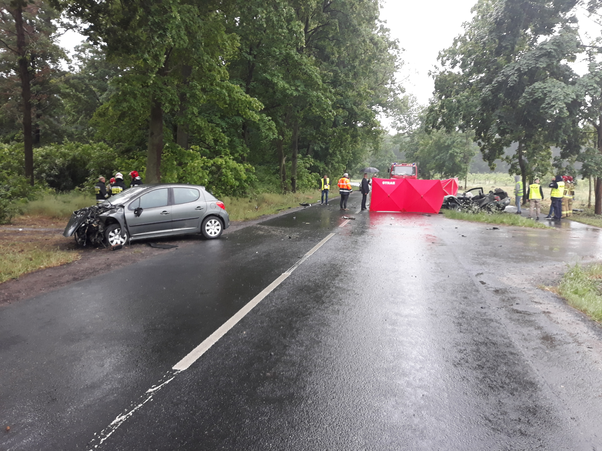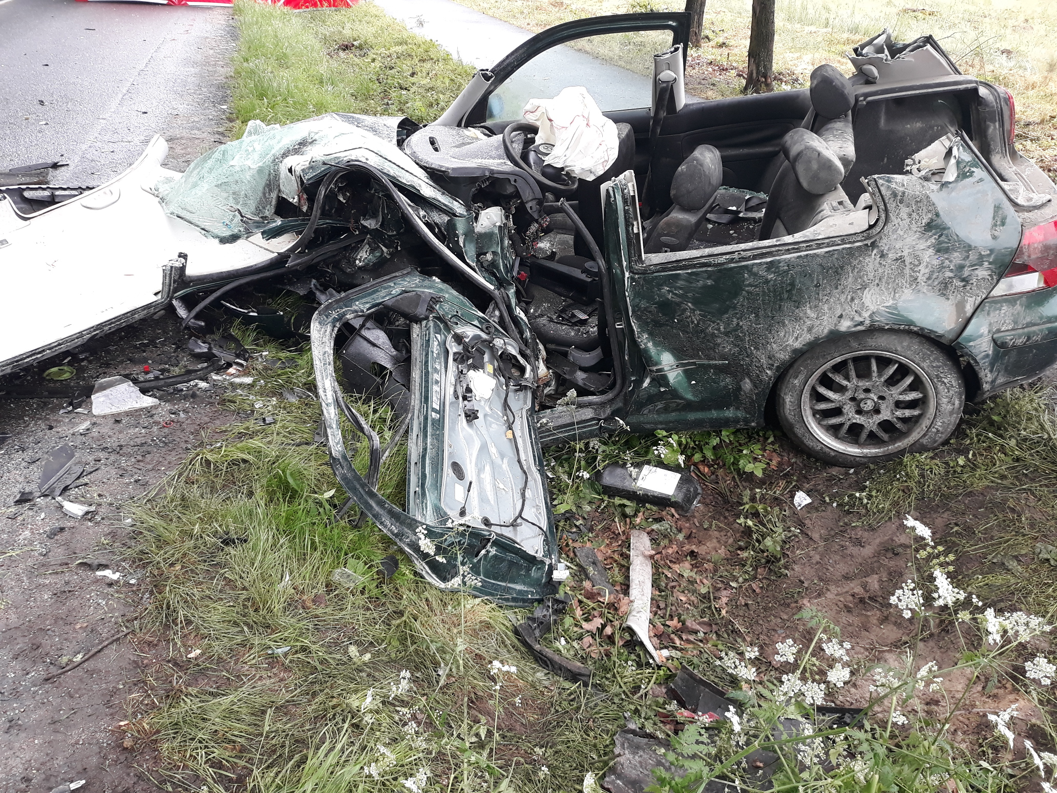 W sobotę 12 czerwca br. o godz. 16.01 Stanowisko Kierowania Komendanta Powiatowego PSP w Kościanie otrzymało informację o wypadku na drodze powiatowej pomiędzy miejscowościami Racot i Gryżyna. Na miejsce zadysponowane zostały zastępy z KP PSP w Kościanie oraz OSP Racot i Gryżyna. VW Golf, którym podróżowały trzy osoby zderzył się z samochodem marki Peugeot, którym jechała tylko kierująca. Trzy kobiety opuściły pojazdy o własnych siłach, kierowca VW pozostawał w pojeździe. Strażacy nie stwierdzili u Niego funkcji życiowych. Przy pomocy sprzętu hydraulicznego wykonany został dostęp do uwięzionego kierowcy i ewakuowano Go na zewnątrz pojazdu. Na miejsce przybył Zespół Ratownictwa Medycznego. Niestety wspólne działania strażaków i ratowników medycznych nie pozwoliły na uratowanie Jego życia, a obecny na miejscu lekarz stwierdził zgon. Pozostali uczestnicy zdarzenia zostali zabrani do kościańskiego szpitala. Przybyły na miejsce Prokurator oraz Policja przeprowadzili czynności dochodzeniowe. Po ich zakończeniu strażacy wspólnie z załogą pomocy drogowej usunęli wraki oraz oczyścili jezdnię z pozostałości powypadkowych. Przez blisko 3 godziny trwającej akcji droga była zablokowana w obu kierunkach, a policja wyznaczyła objazdy.