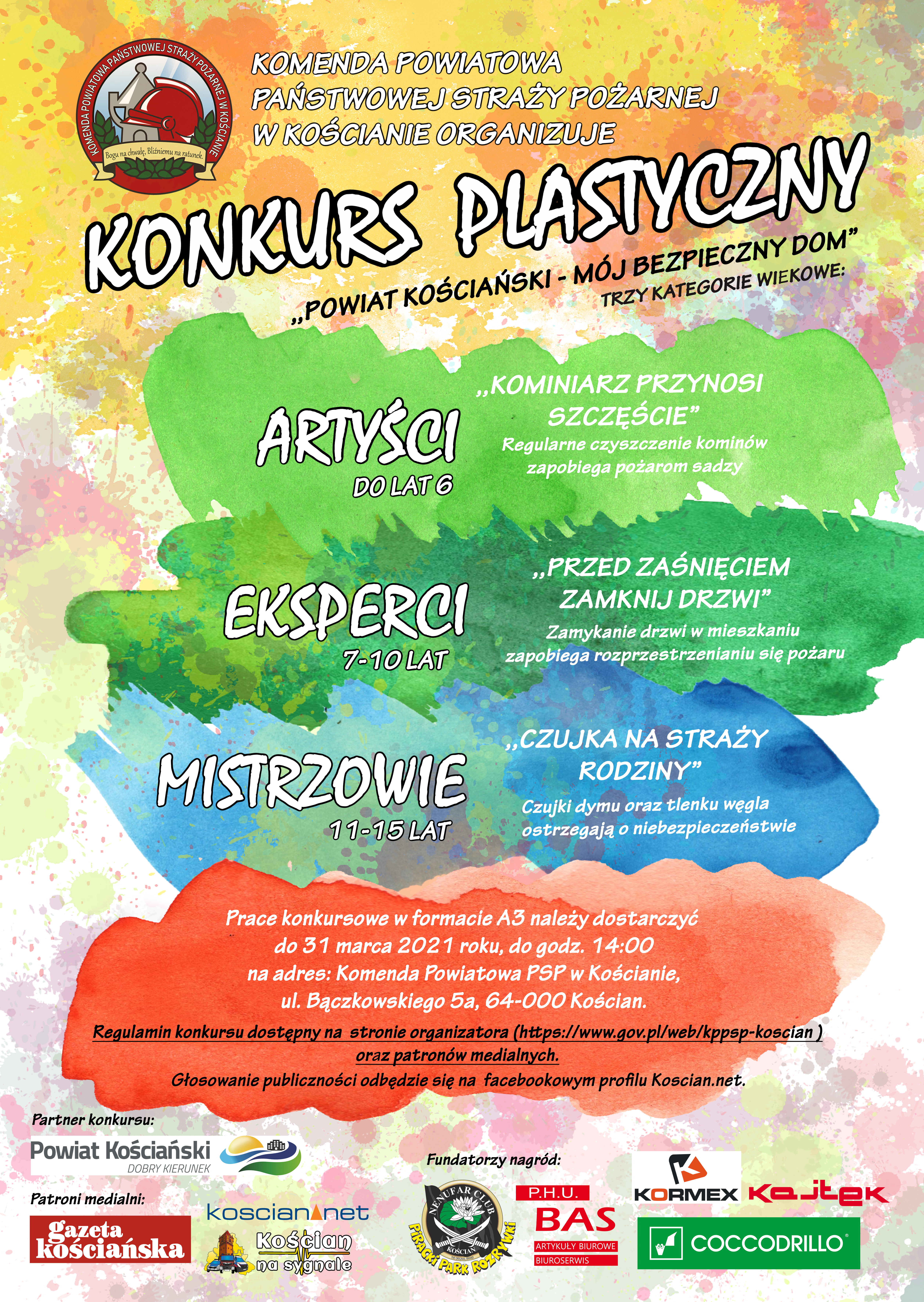 Konkurs odbywa się w trzech kategoriach wiekowych. Dla każdej z kategorii przygotowaliśmy inny temat prac związany z bezpieczeństwem pożarowym. Tematem prac artystów w wieku do 6 lat jest „Kominiarz przynosi szczęście”, dla ekspertów w wieku 7-10 lat temat brzmi „Przed zaśnięciem zamknij drzwi”, a mistrzowie w wieku 11-15 lat zmierzą się z hasłem „Czujka na straży mojej rodziny”. Opis kategorii dostępny jest w regulaminie konkursu. Prace wraz z dołączoną kartą uczestnictwa oraz klauzulą informacyjną podpisaną przez opiekunów należy dostarczyć osobiście lub pocztą na adres : Komenda Powiatowa Państwowej Straży Pożarnej w Kościanie, ul. Bączkowskiego 5a, 64-000 Kościan. Regulamin, karta uczestnictwa oraz klauzula informacyjna dostępne na naszej stronie internetowej. Na laureatów konkursu czekają atrakcyjne nagrody, a ich prace zostaną opublikowane na wystawie oraz ozdobią ulotki informacyjne. Zostanie też przyznana specjalna nagroda publiczności. Otrzyma ją uczestnik, którego praca zdobędzie najwięcej reakcji na profilu Facebooko’wym Koscian.net. Zapraszamy!