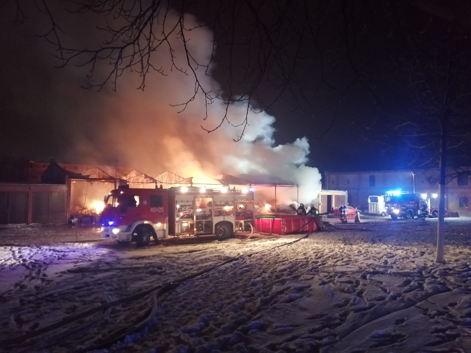 Pożar powstał po północy. Ze zgłoszenia wynikało, że pali się stóg słomy, jednak po dojeździe na miejsce strażacy zastali palącą się wiatę magazynową przy budynkach stajni. Składowane były w niej słoma, sino, zboże, maszyny i urządzenia. Pożar zaczął zagrażać budynkowi stajni i przebywającym w niej koniom. Na szczęście konie udało się ewakuować i obronić budynek przed ogniem.
