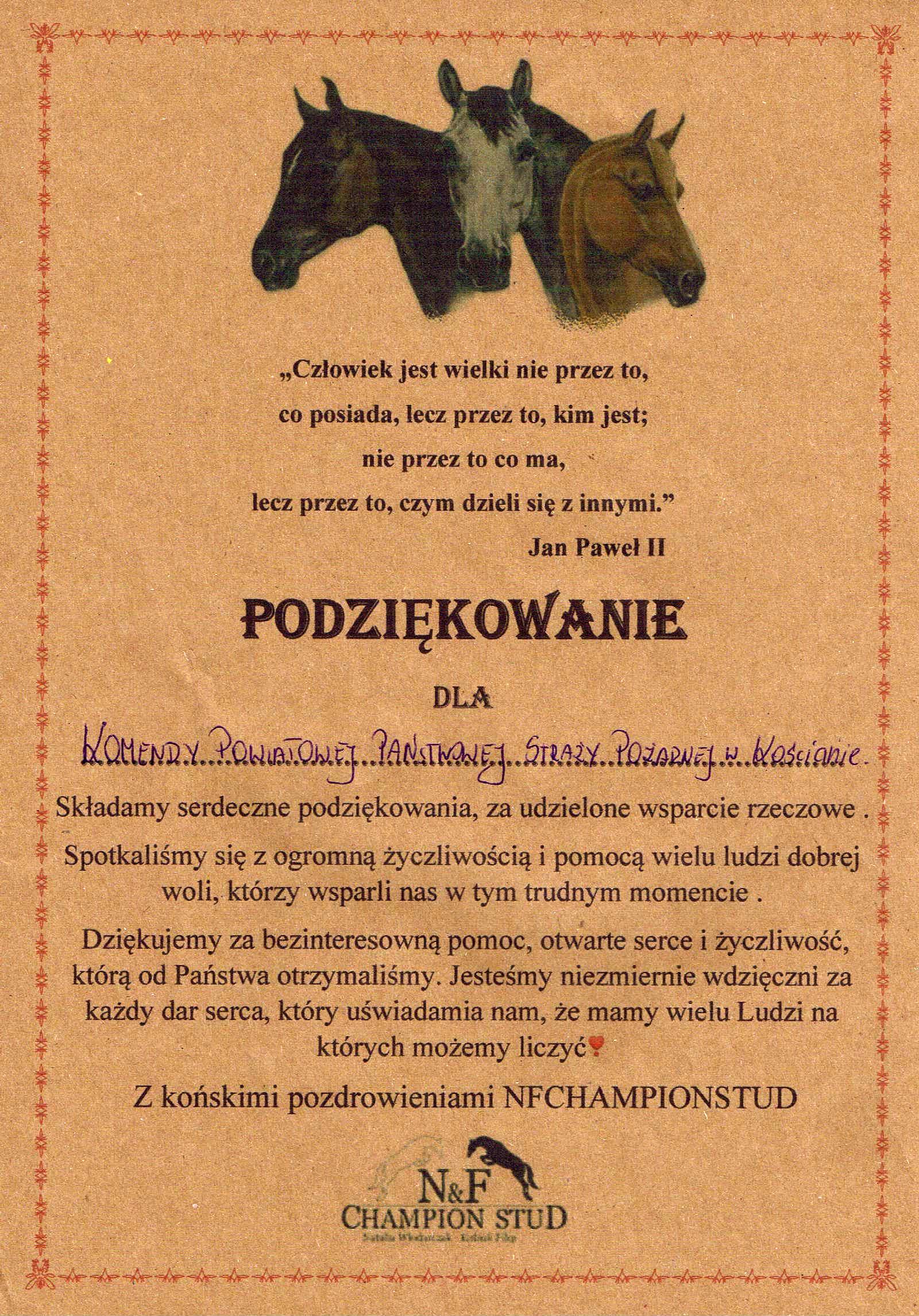 W minionych dniach Komendę Powiatową Państwowej Straży Pożarnej w Kościanie odwiedziła przedstawicielka stadniny koni N&F Champion Stud w Piotrkowicach. Wizyta związana była z pożarem, który wybuchł w stadninie 10 lutego br.