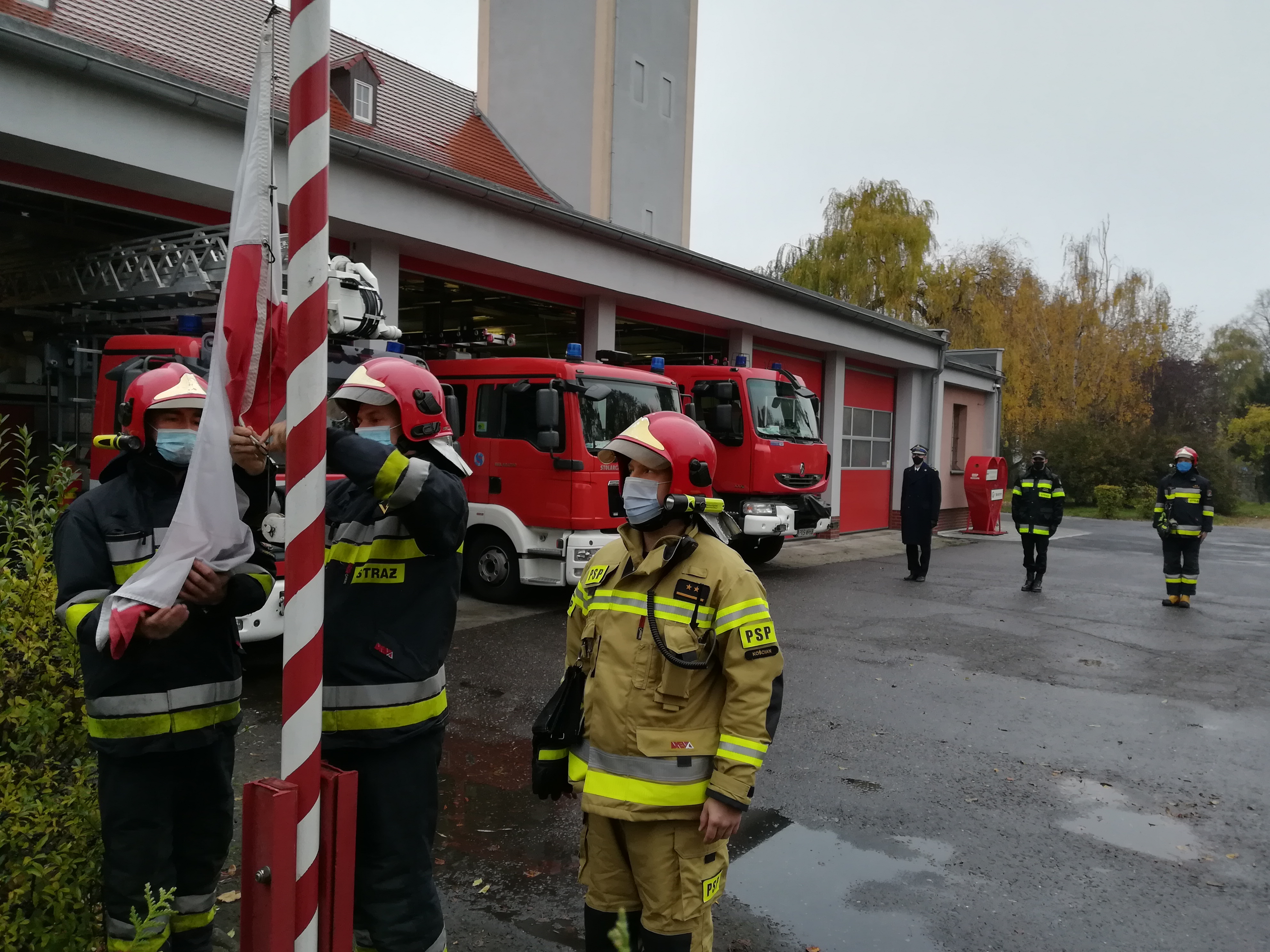 Przyjmująca zmiana służbowa uroczyście podniosła Flagę na maszt i odśpiewała Mazurka Dąbrowskiego w ramach akcji „Niepodległa do Hymnu 2020”. W apelu oprócz zmiany służbowej udział wziął Komendant Powiatowy PSP w Kościanie st. bryg. Andrzej Ziegler oraz Dowódca JRG kpt. Szymon Klemenski. Ze względu na panującą sytuację całość uroczystości odbyła się z zachowaniem dystansu społecznego i szczególnych środków ostrożności.