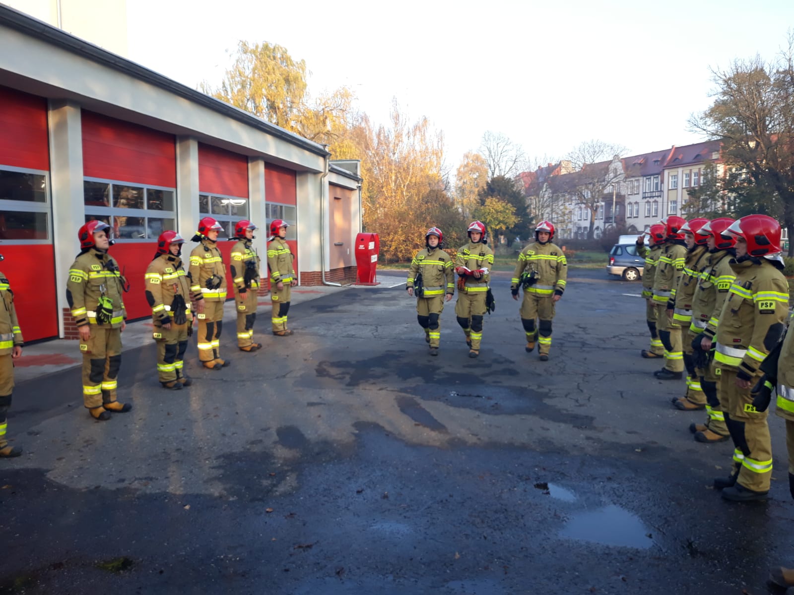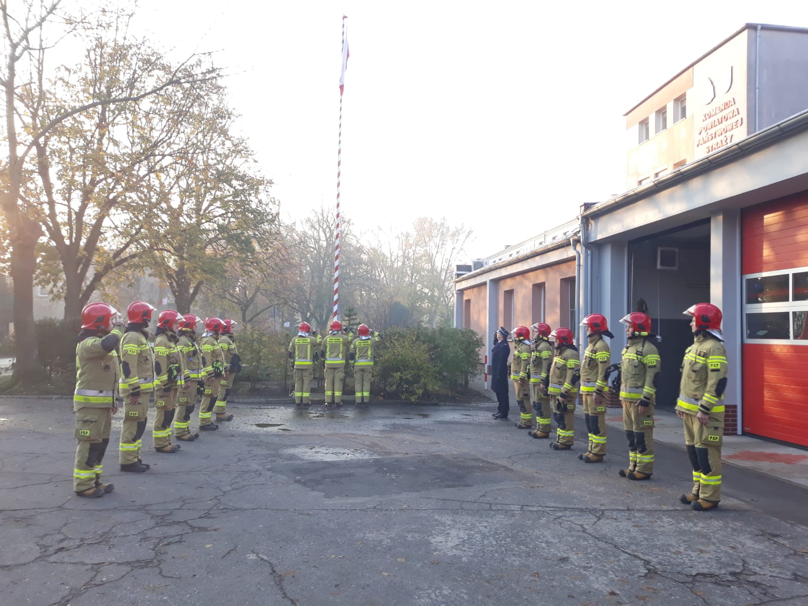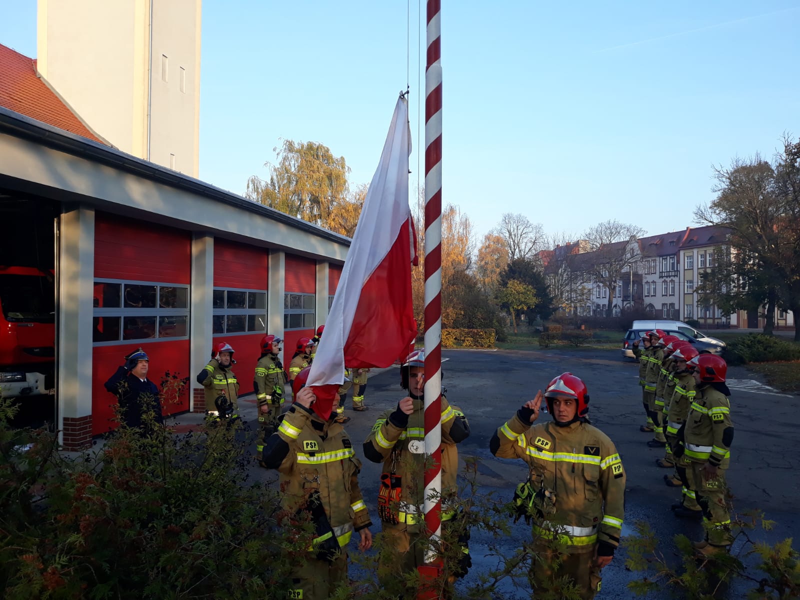 Uroczyście wciągnięto Flagę na maszt i odśpiewano Mazurka Dąbrowskiego w ramach akcji „Niepodległa do Hymnu”. W apelu oprócz zmiany służbowej udział wziął Dowódca Jednostki Ratowniczo-Gaśniczej mł. bryg. Jacek Donaj.