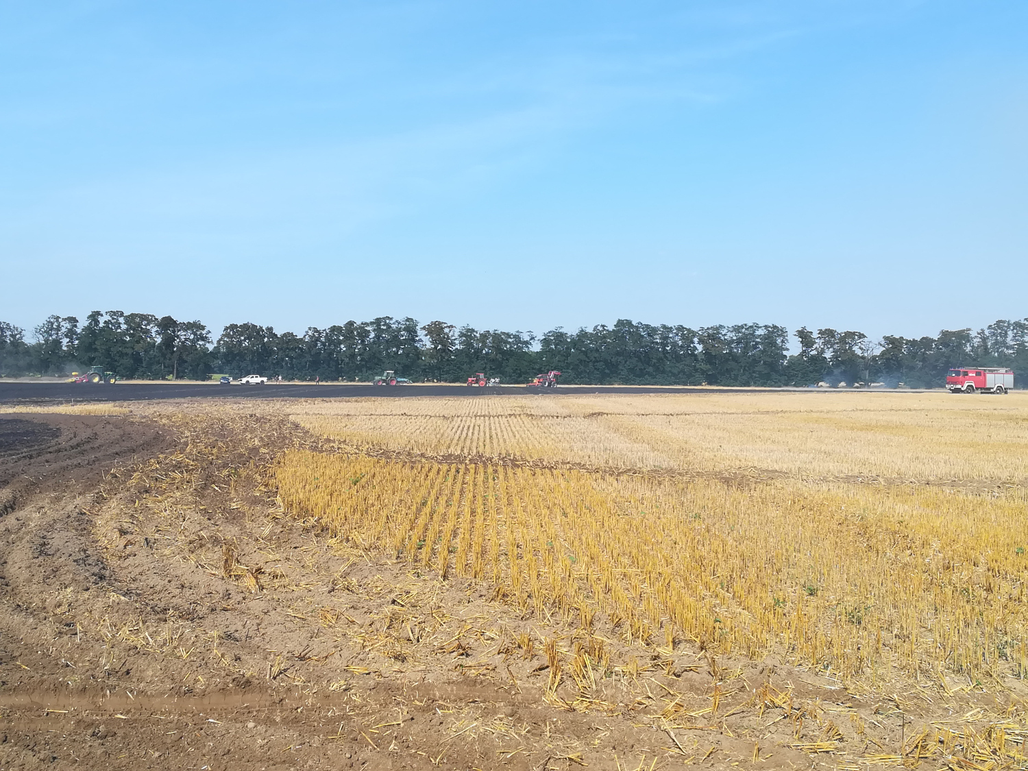 Po przybyciu na miejsce ustalono, że pali się ściernisko oraz rozdrobniona słoma po kombajnie. Pożar rozprzestrzeniał się w kierunku pobliskiego lasu. Pierwsze zastępy podały prądy wody w natarciu na palące się ściernisko od strony lasu. W miarę przybywania kolejnych zastępów otoczono pożar, gasząc płomienie. Na miejsce zdarzenia przyjechali także okoliczni rolnicy - 6 traktorów z pługami i agregatami uprawowymi, co znacznie pomogło strażakom szybko opanować pożar. Teren wokół palącego się ścierniska został oborany i całość dodatkowo zlana wodą.